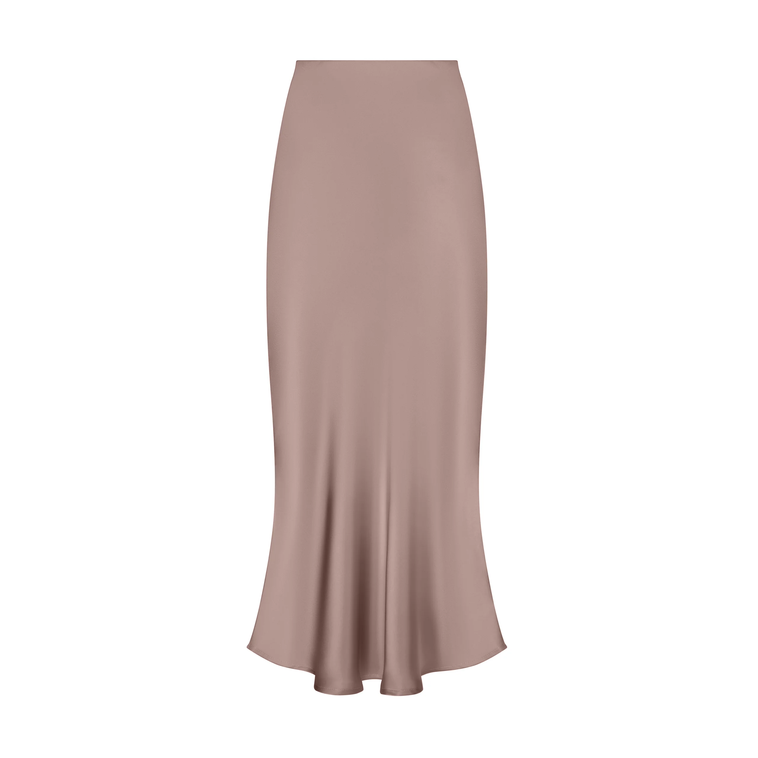 The trapezoidal silhouette and length of the midi further emphasize its lightness. The skirt has an elasticized waistband with an elastic band.