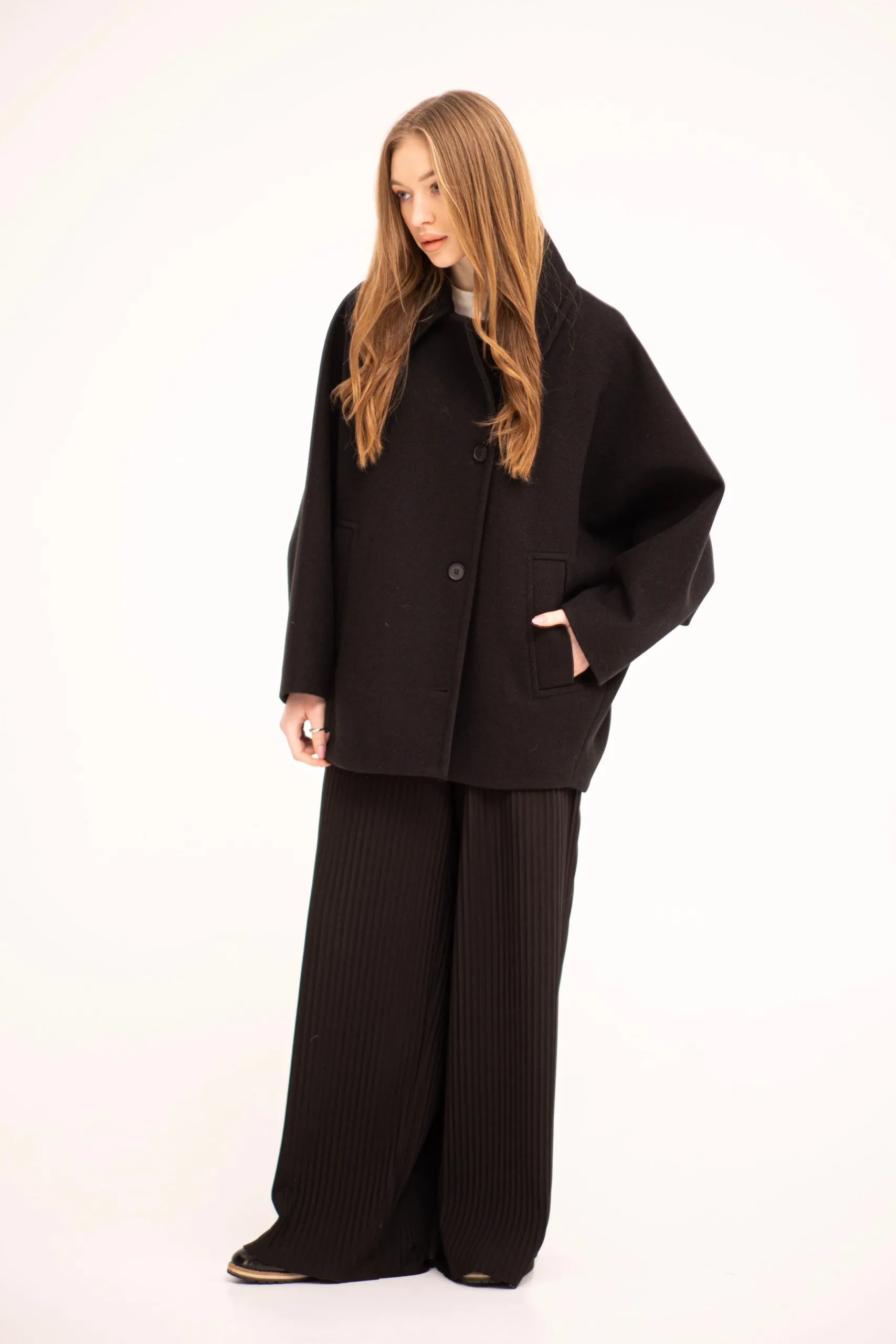 Straight-cut double-breasted coat with a two-button fastener, a dropped armhole and set-in sleeves. Turn-down collar with sides, welt pockets with a leaf. The back has a medium seam with a slot.
