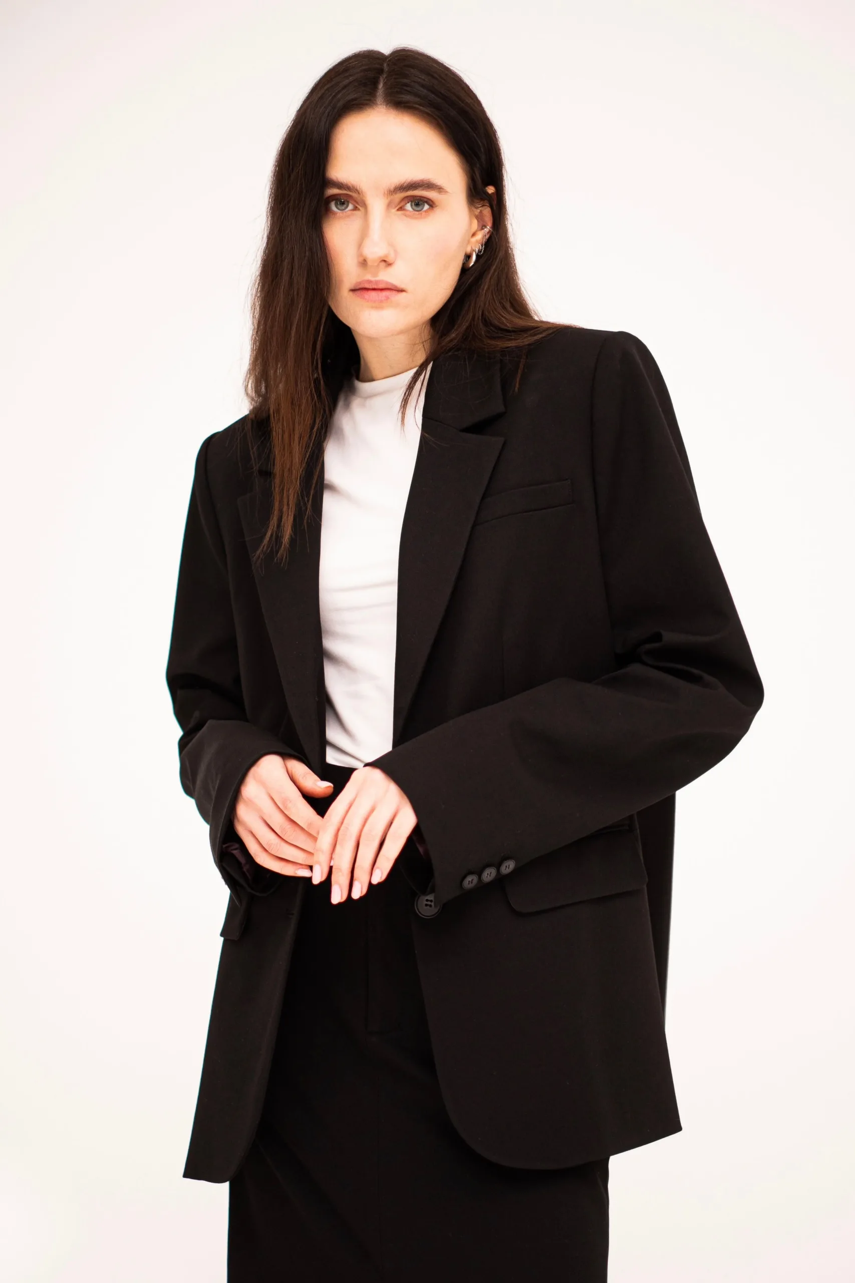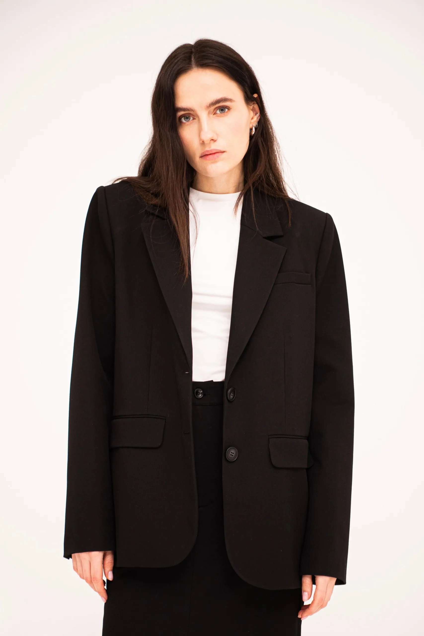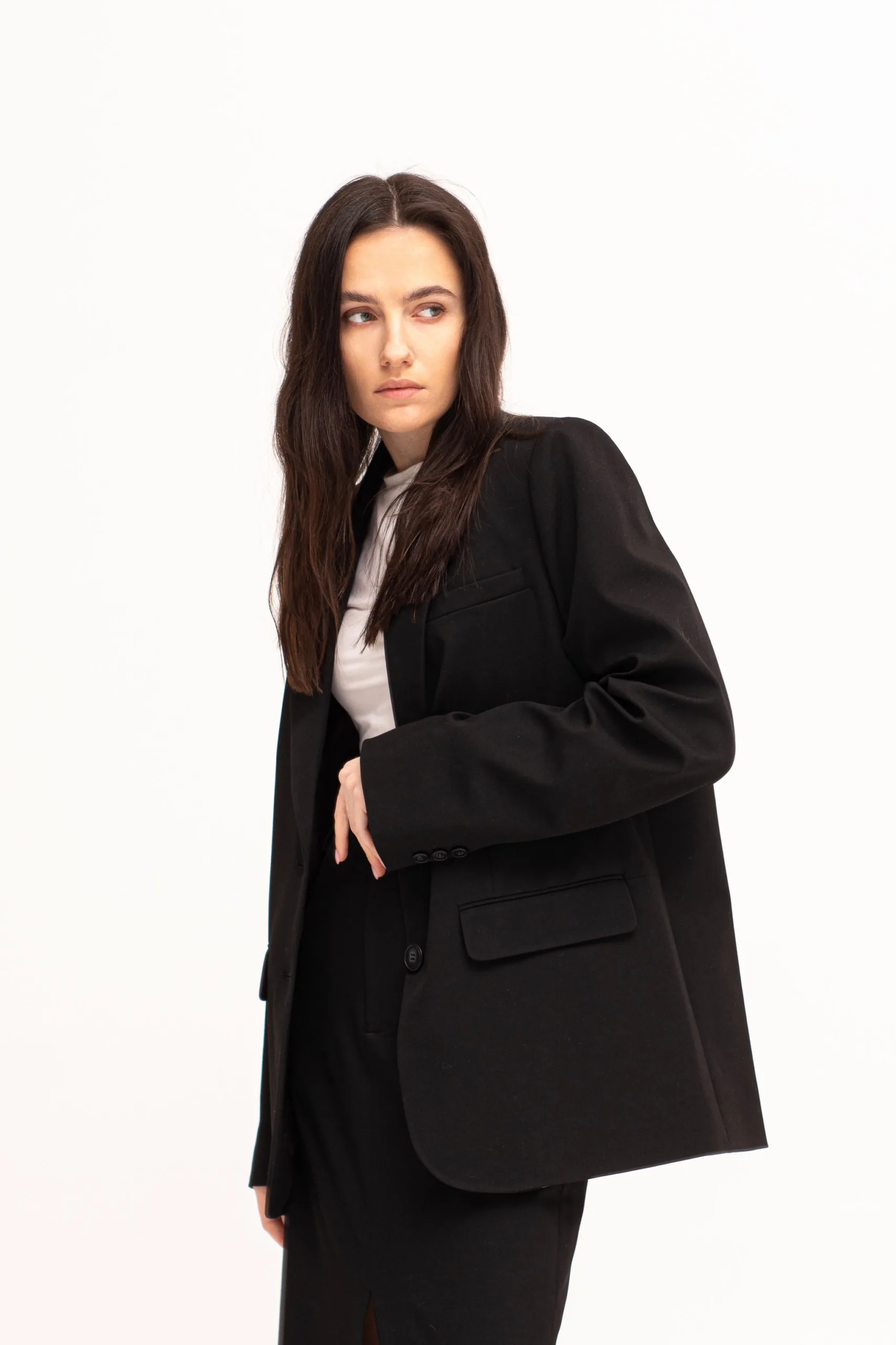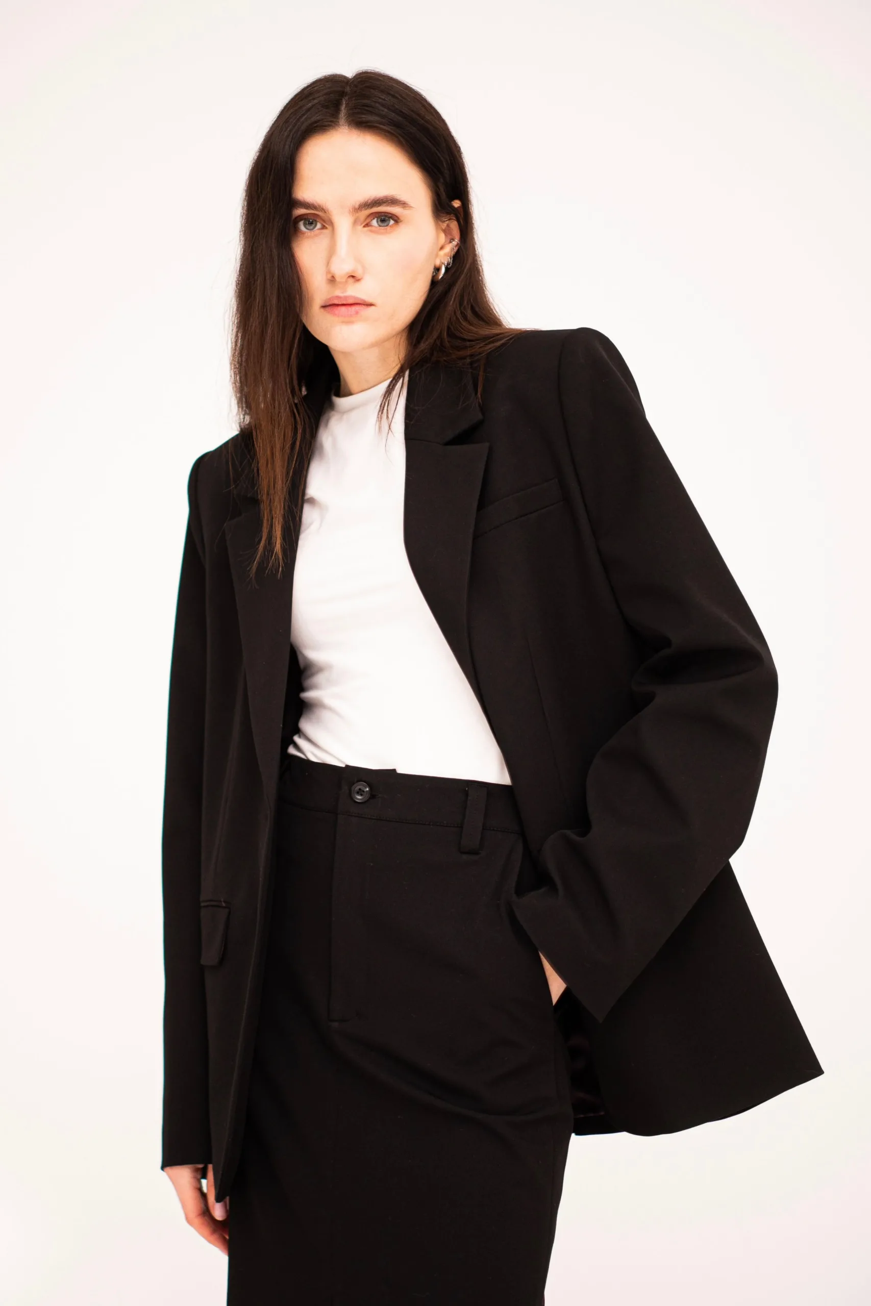 The jacket is single-breasted, straight-cut, with a one-button fastener.
