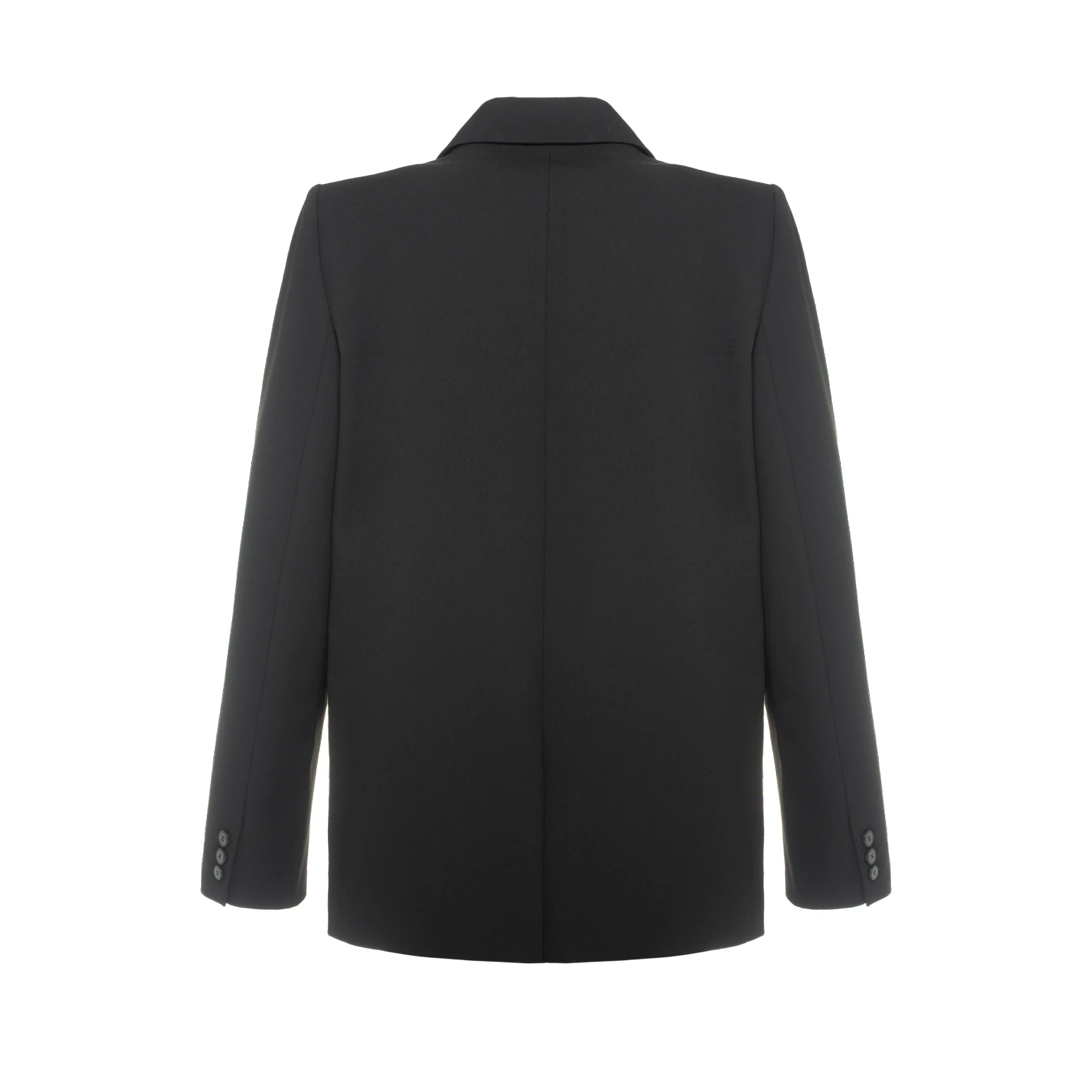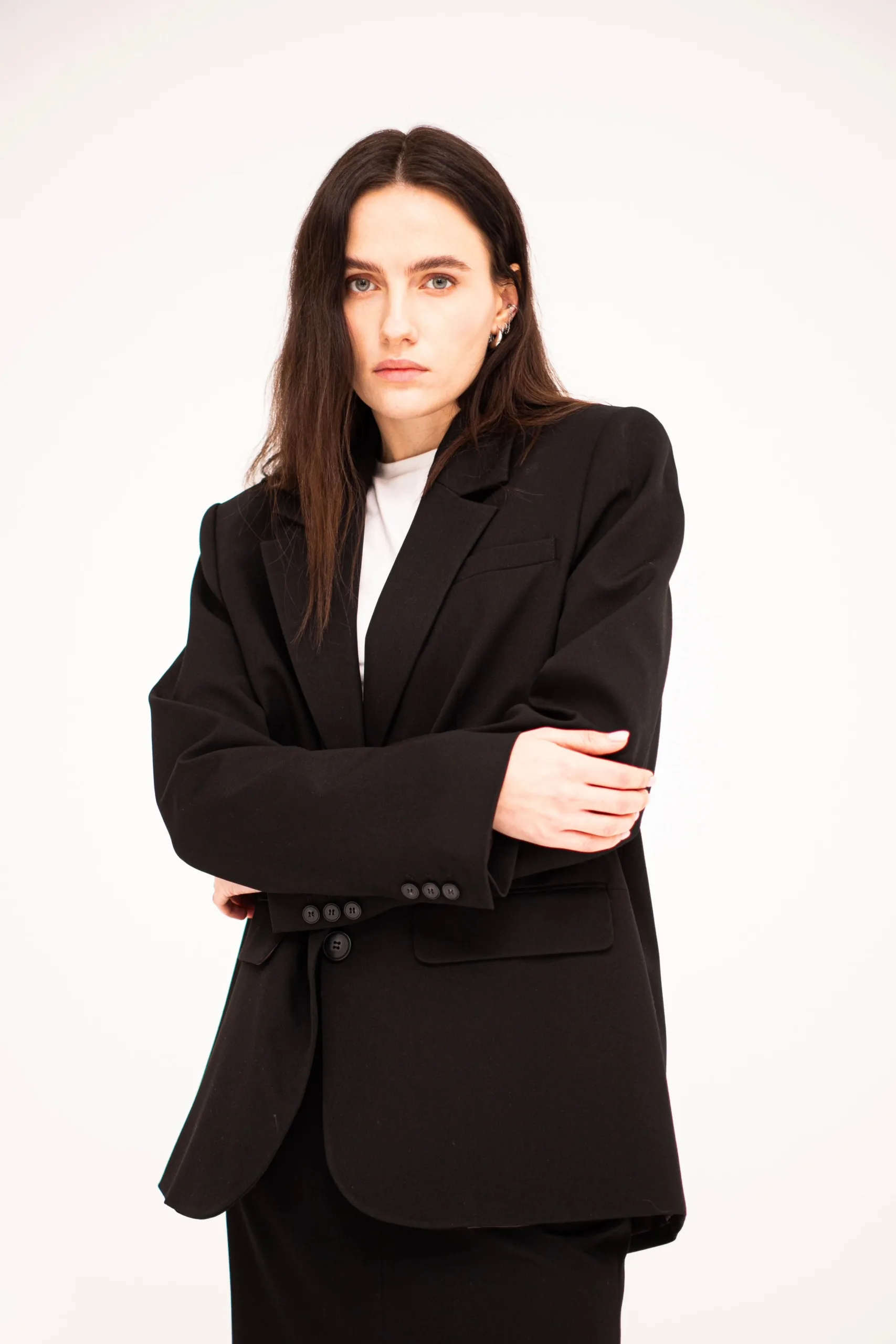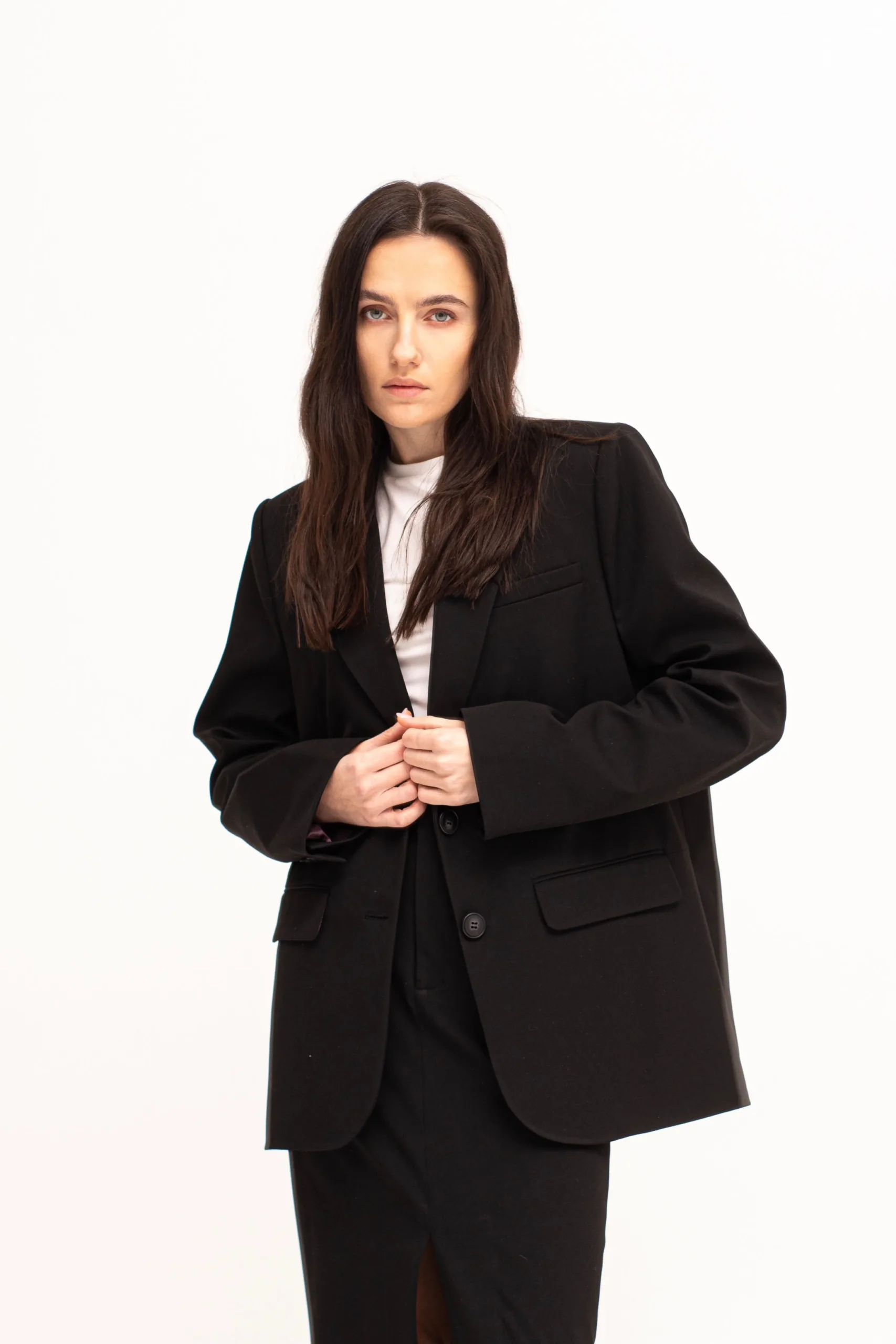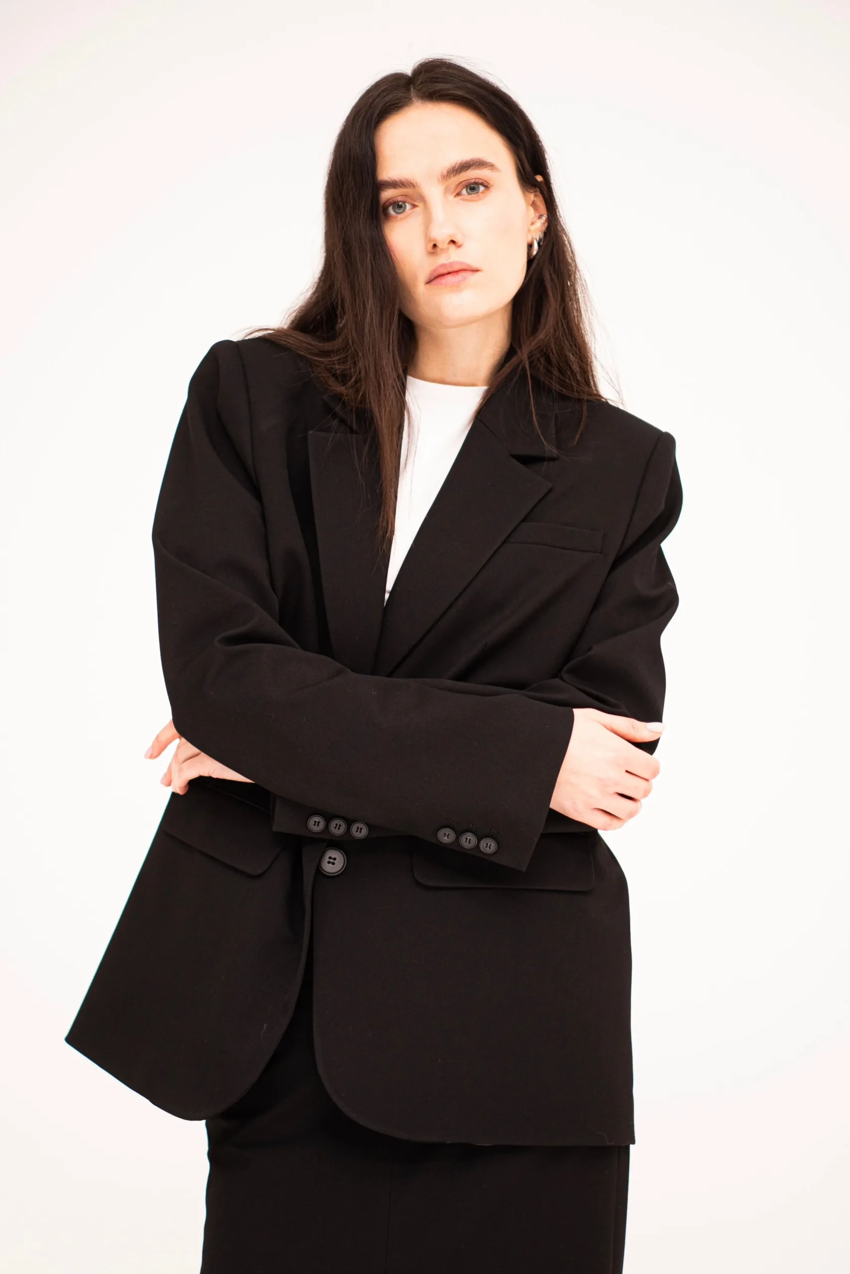 The jacket is single-breasted, straight-cut, with a one-button fastener.