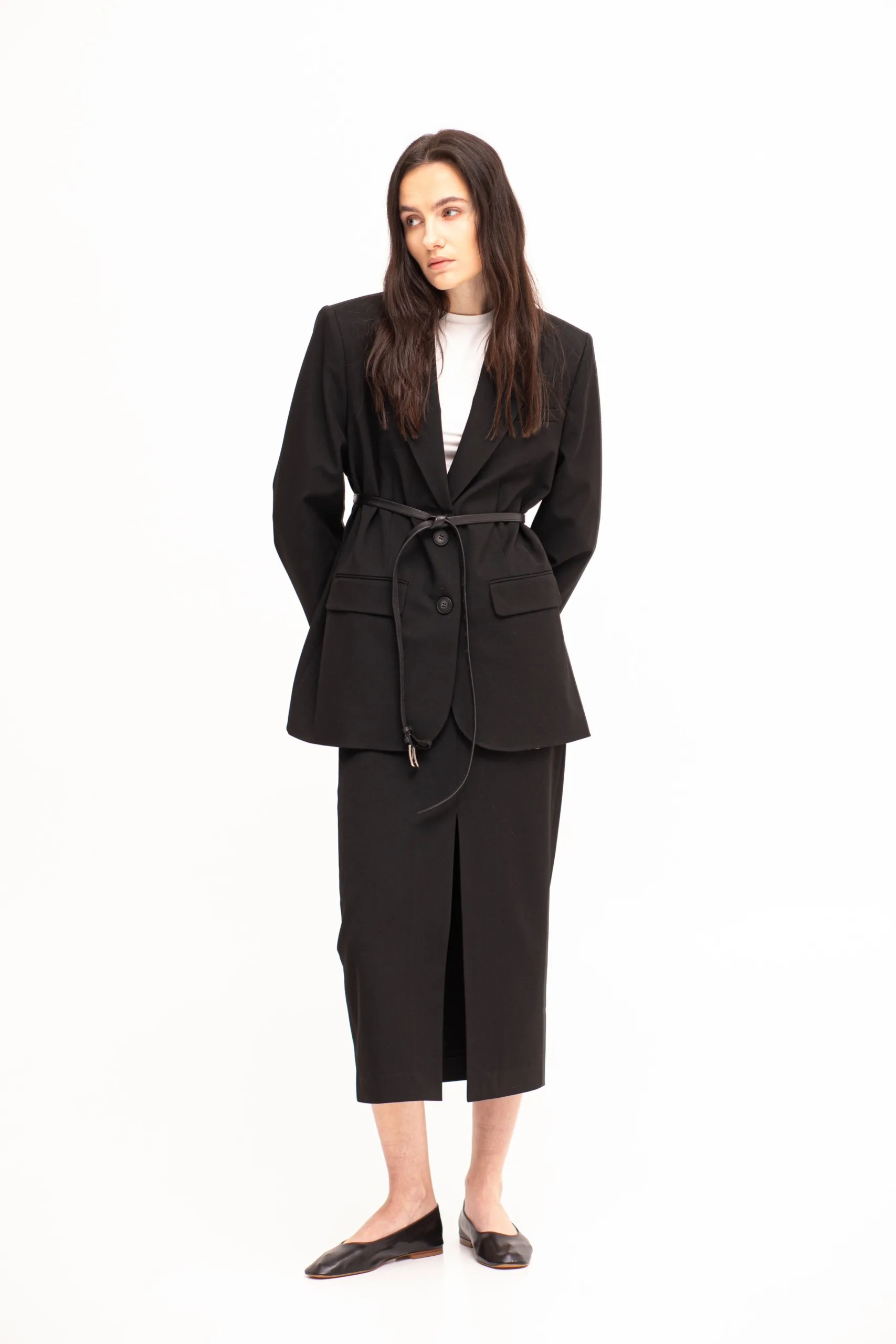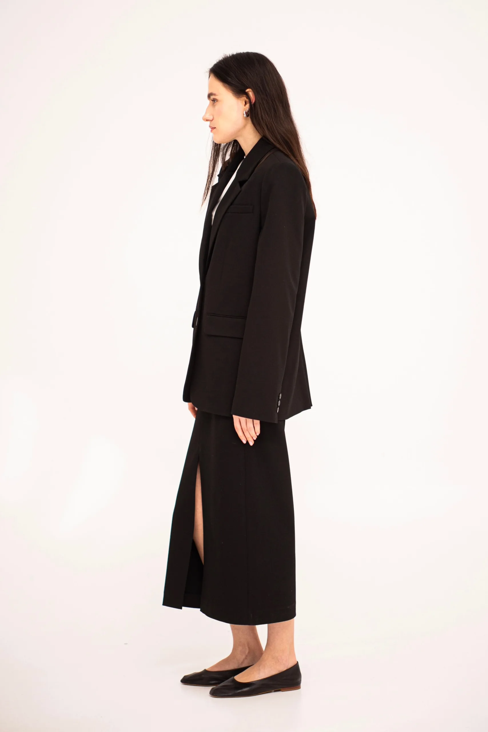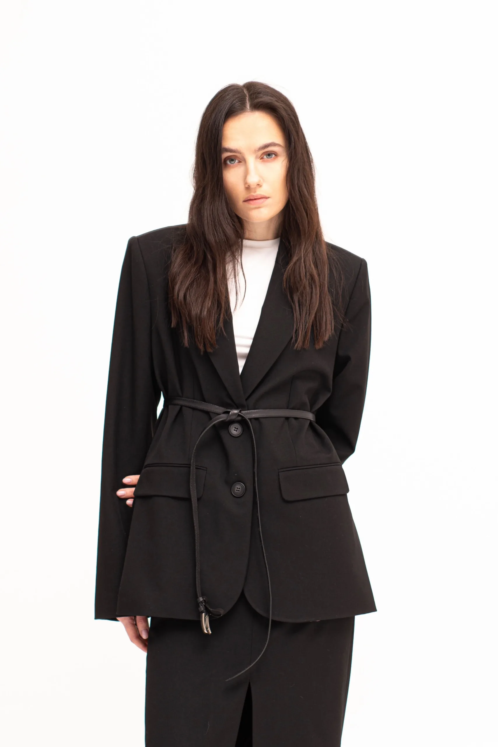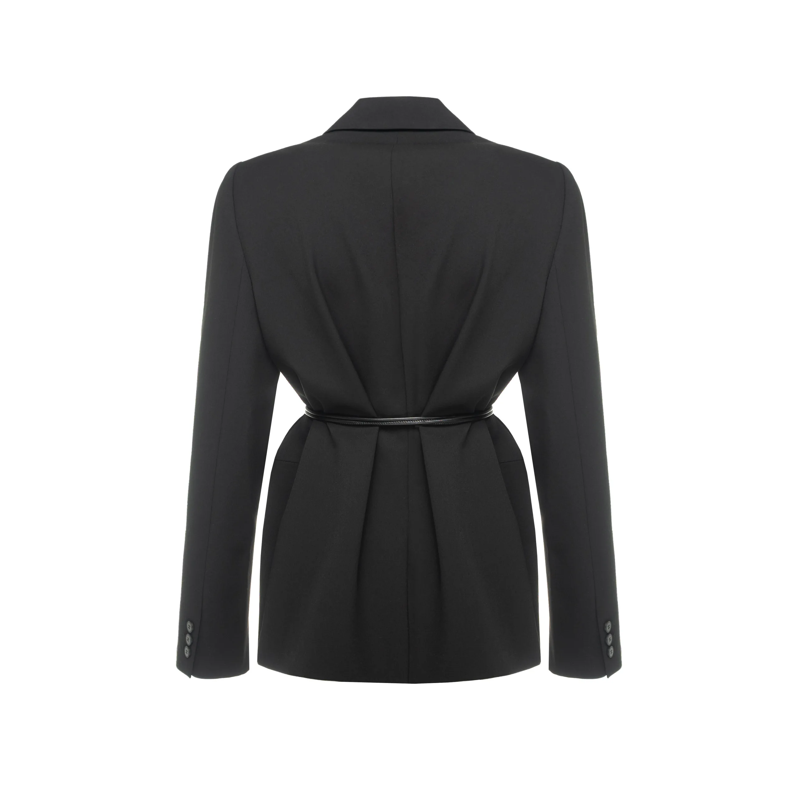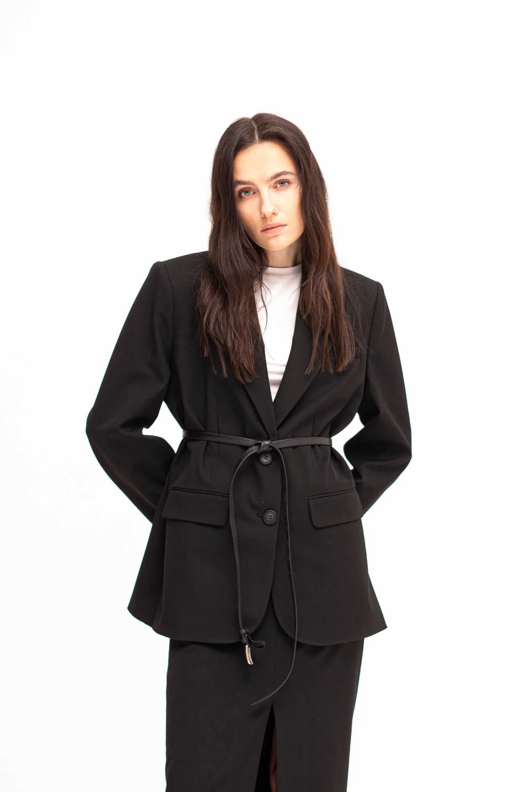 The jacket is single-breasted, straight-cut, with a one-button fastener.