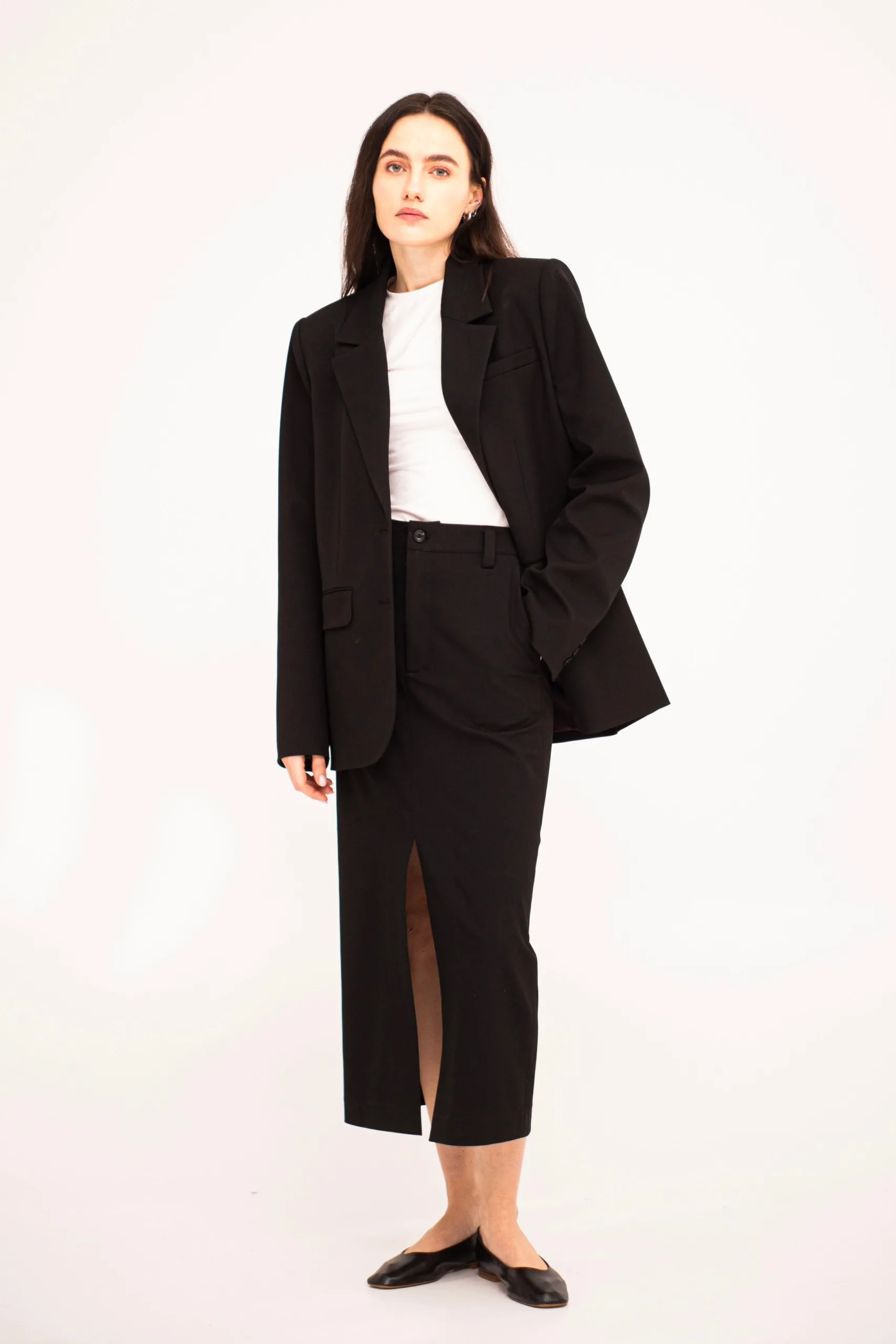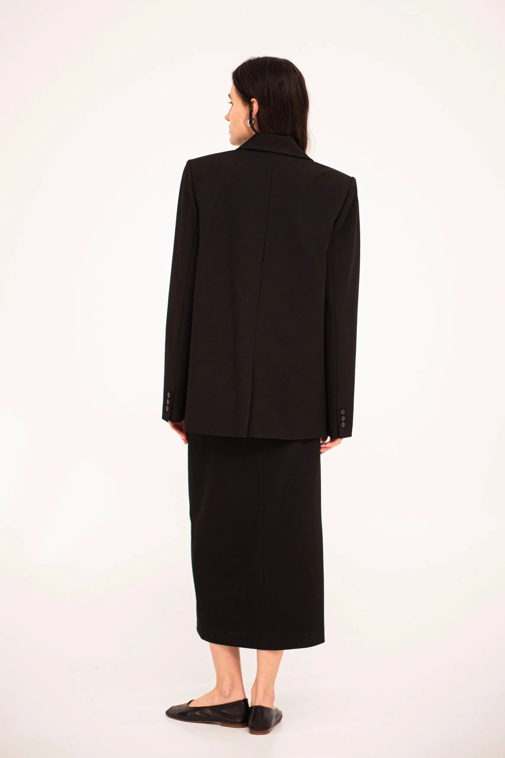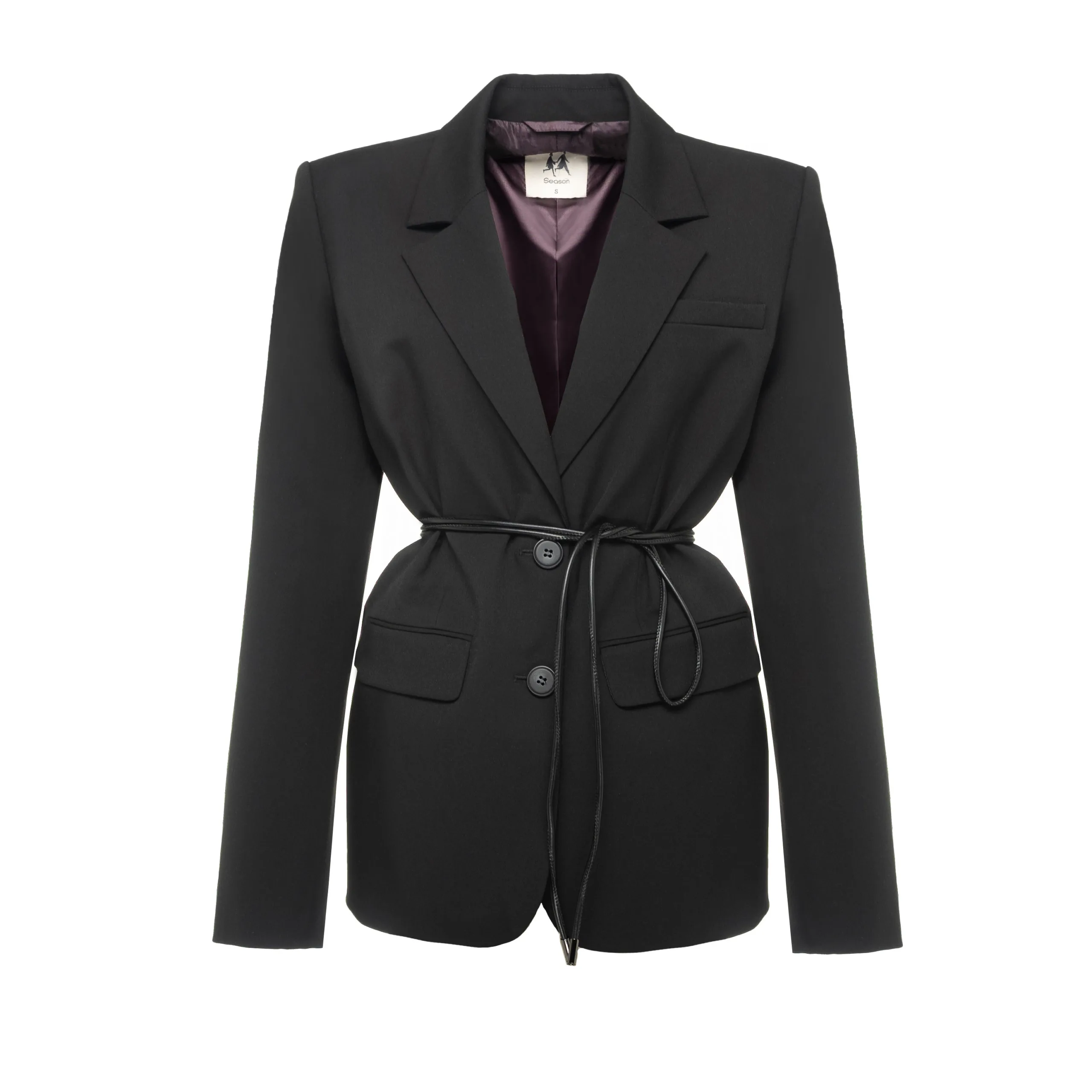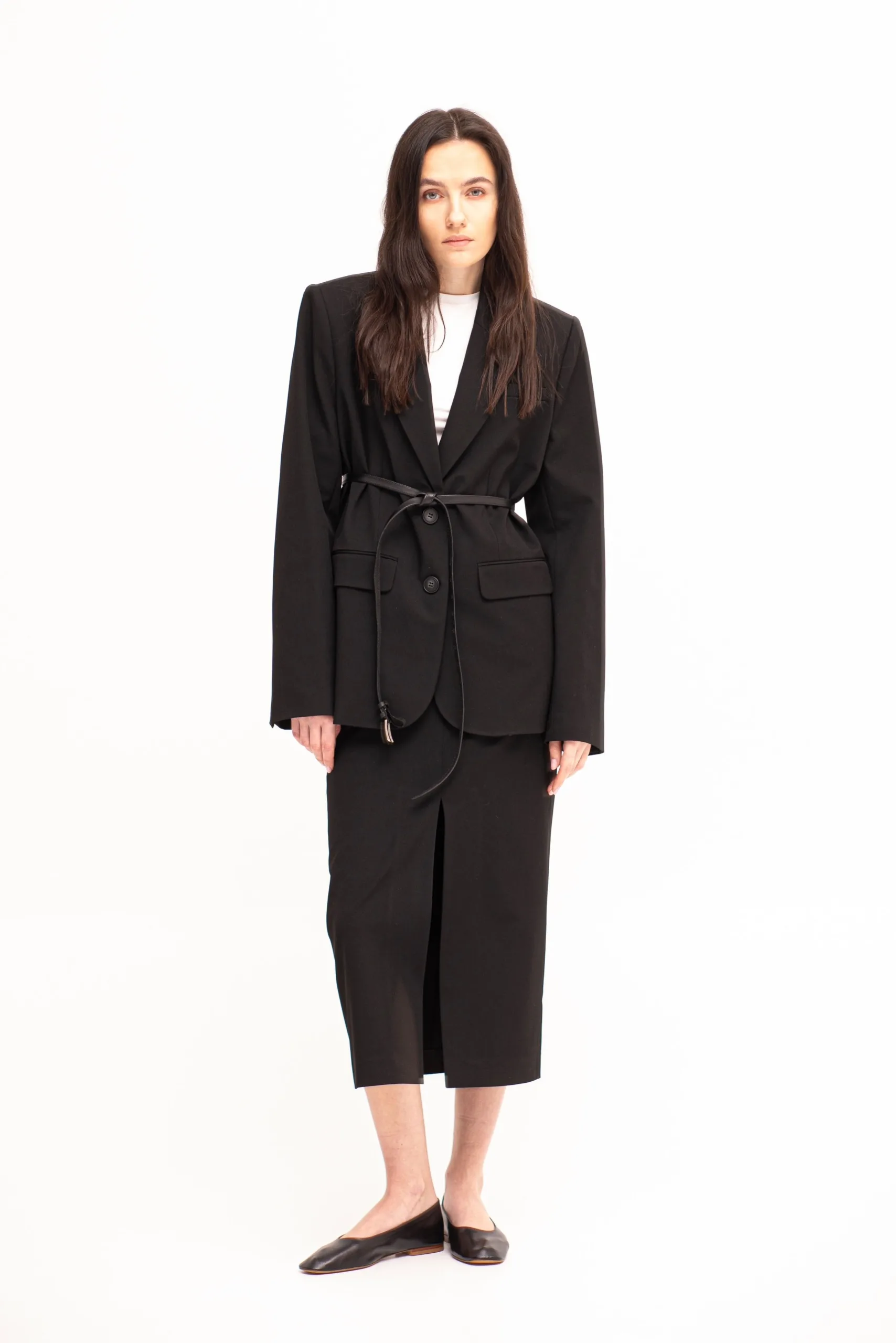 The jacket is single-breasted, straight-cut, with a one-button fastener.