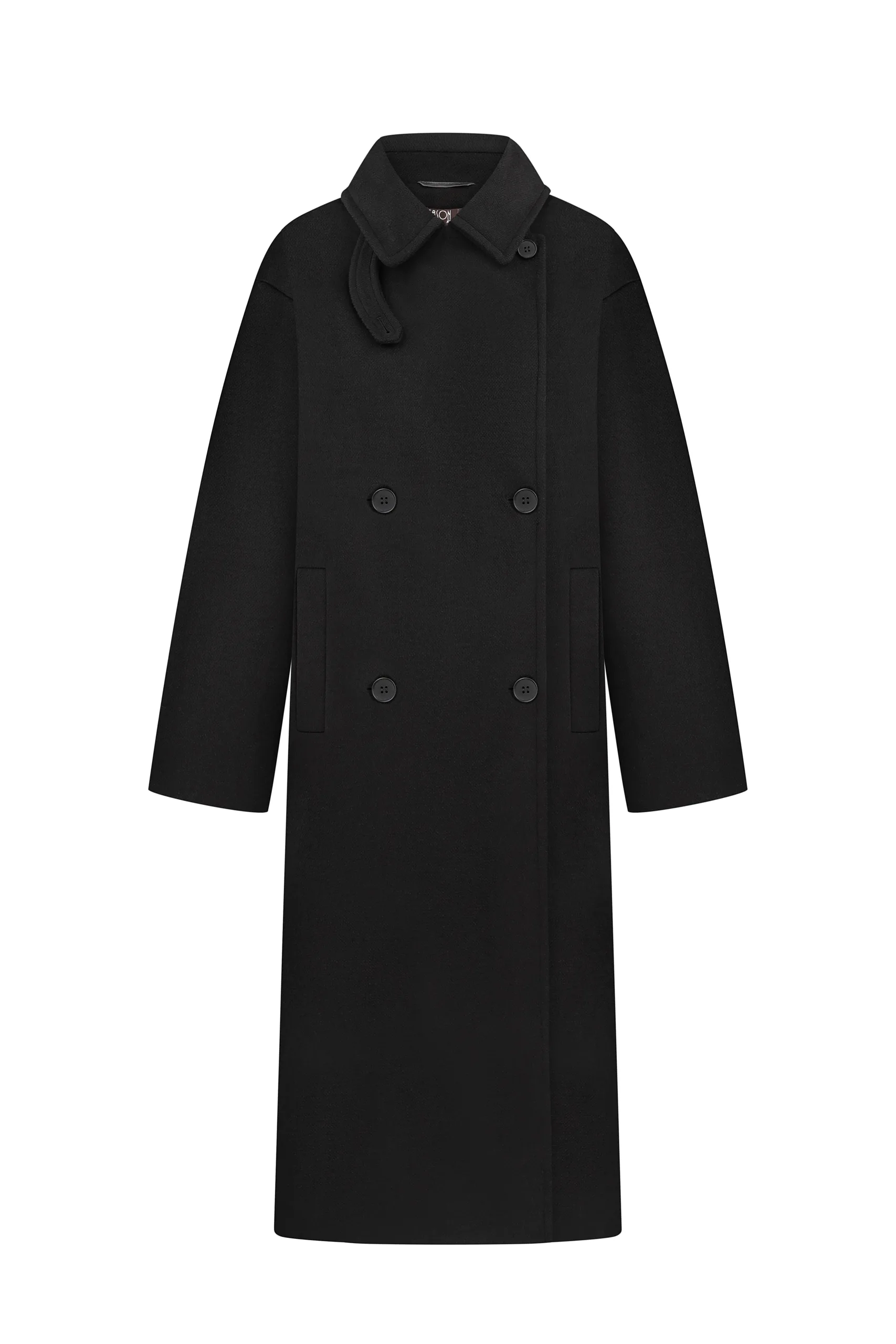 Straight-cut double-breasted coat with a two-button fastener, a dropped armhole and set-in sleeves. Turn-down collar with sides, welt pockets with a leaf. The back has a medium seam with a slot.