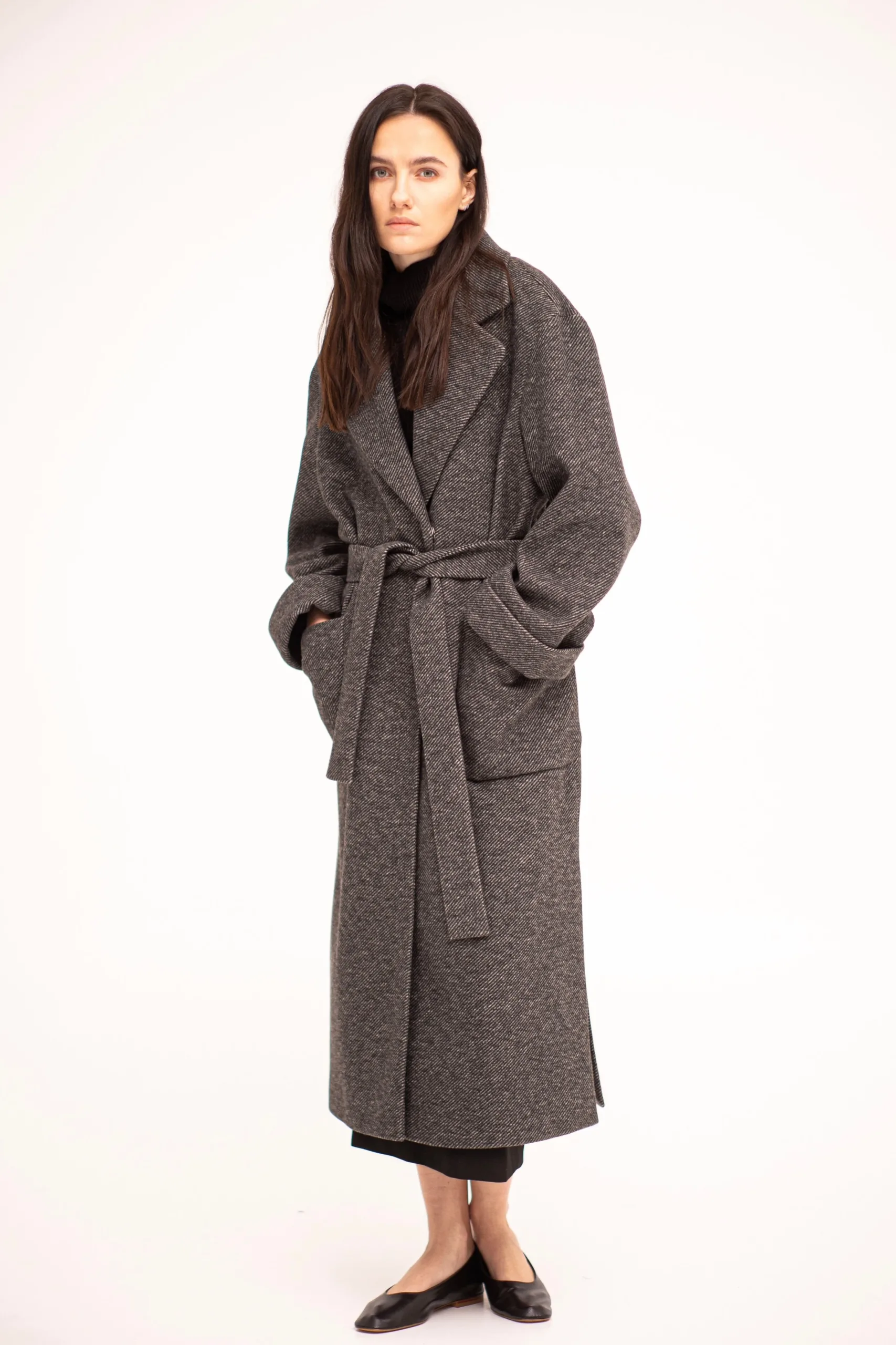 Straight-cut double-breasted coat with a belt and two-button fastener.
