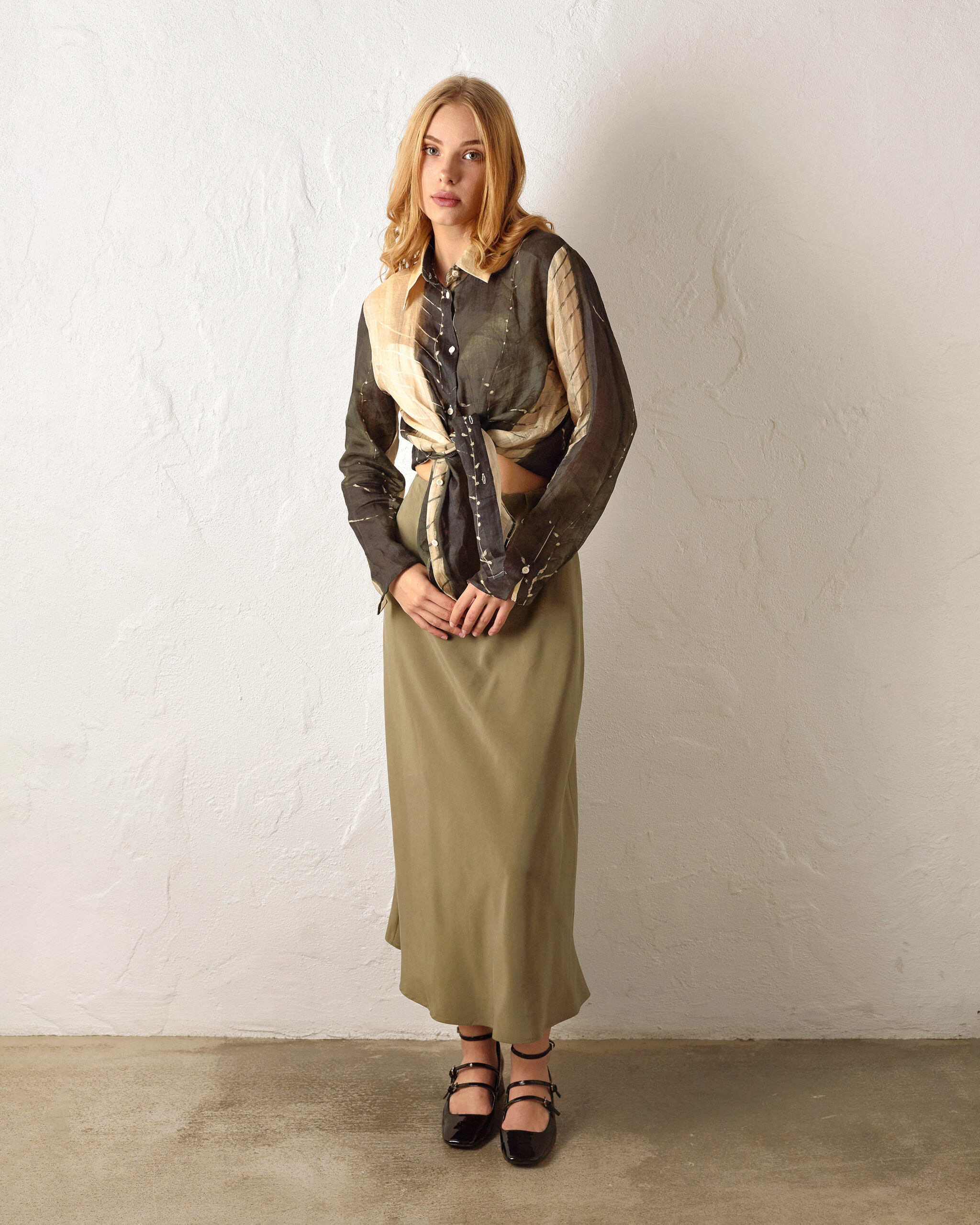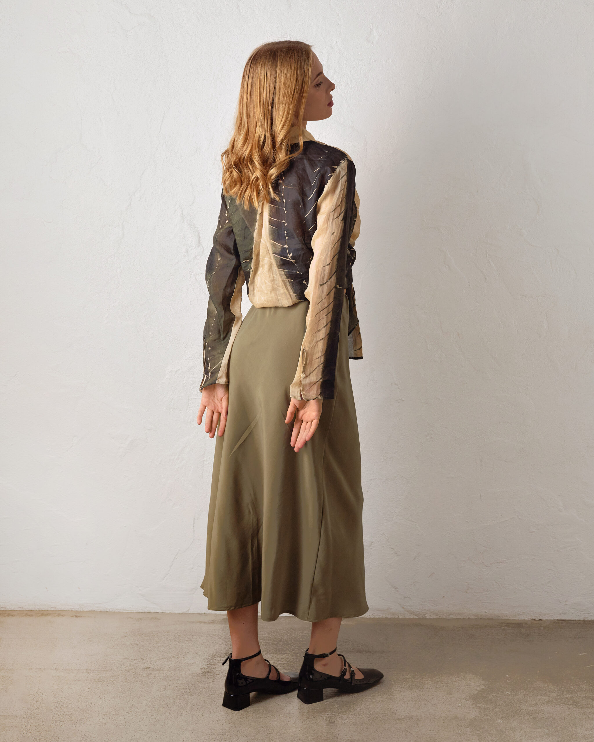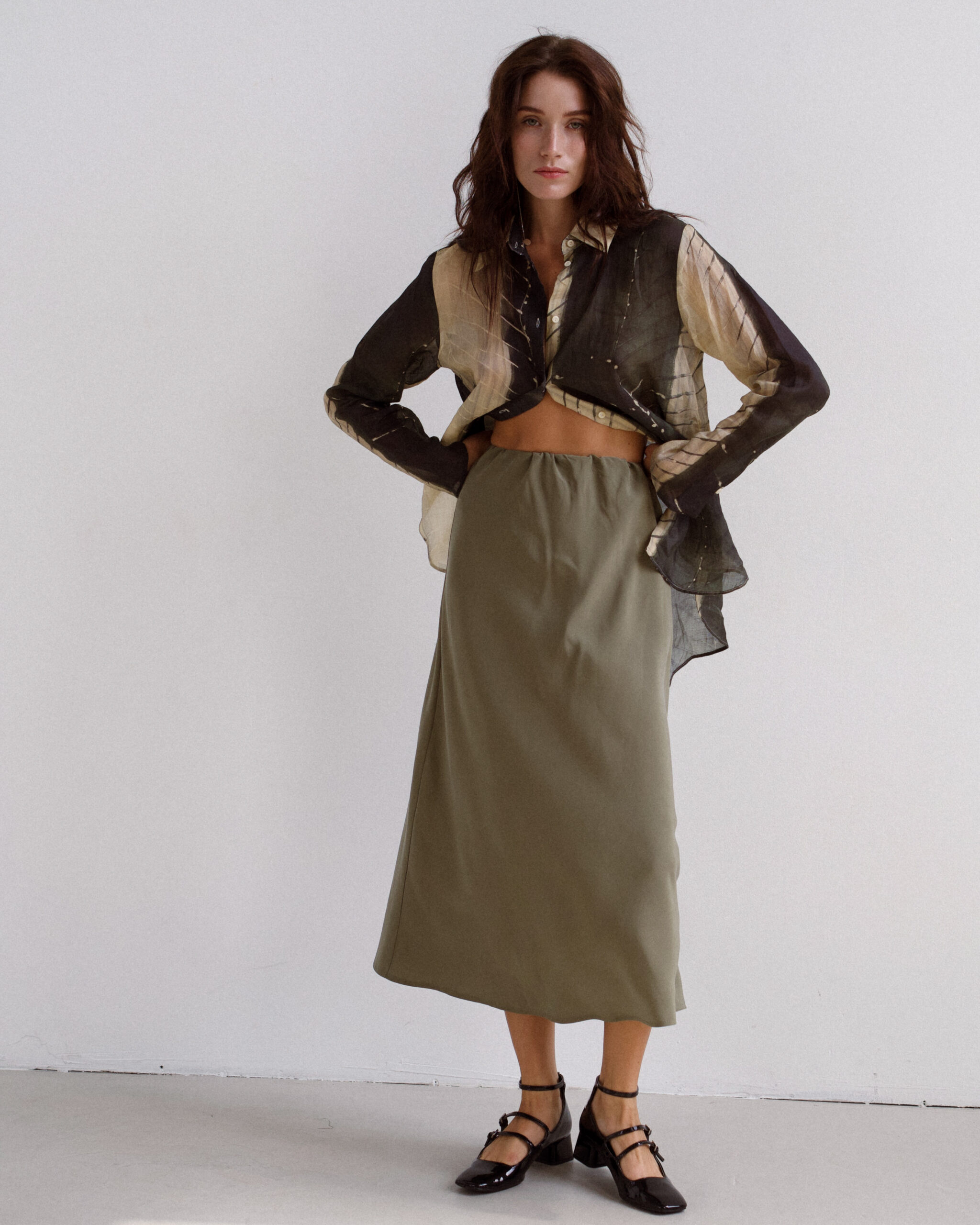 The trapezoidal silhouette and length of the midi further emphasize its lightness. The skirt has an elasticized waistband with an elastic band.
