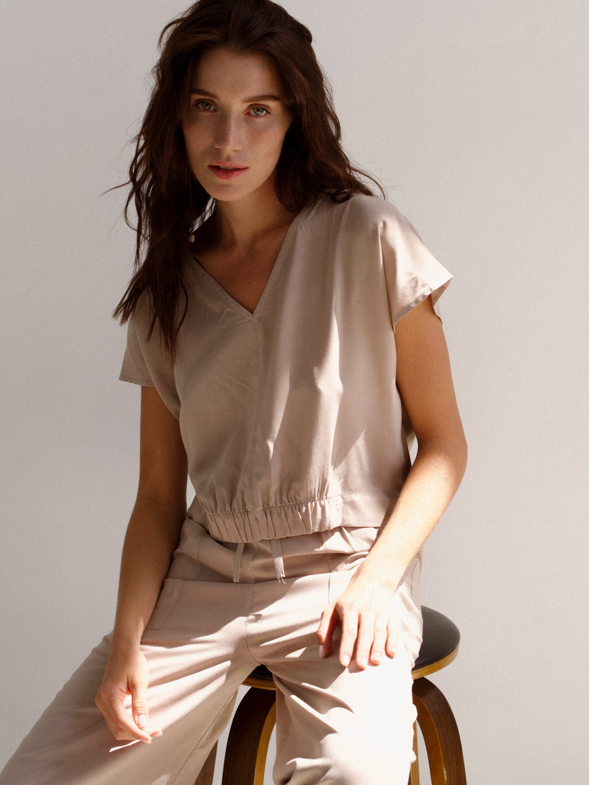 Top with a V-neckline and draping at the waistline with an elastic band.