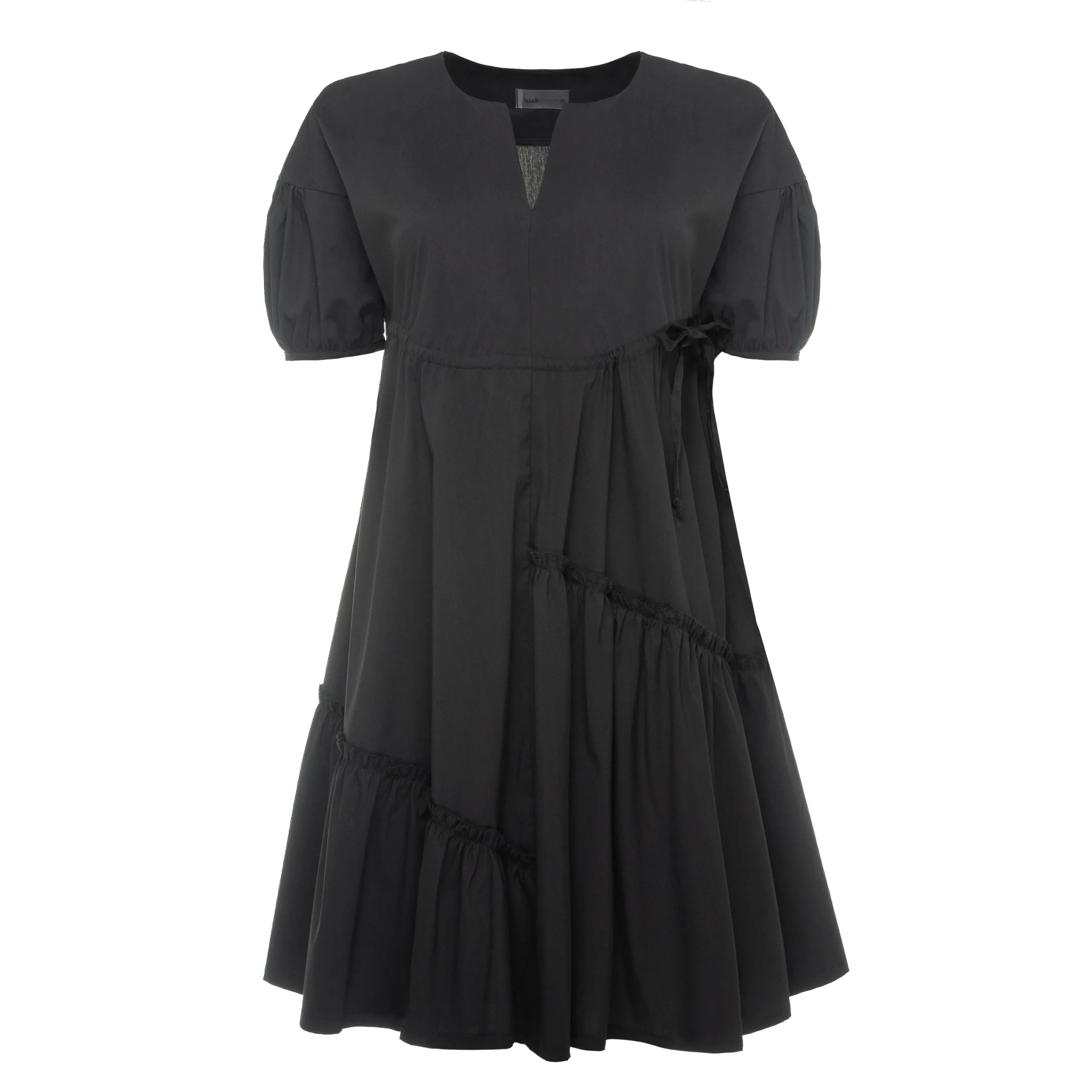 Women’s dress with a fitted silhouette, cut off at the waist with a stand-up collar and drapery on the back.