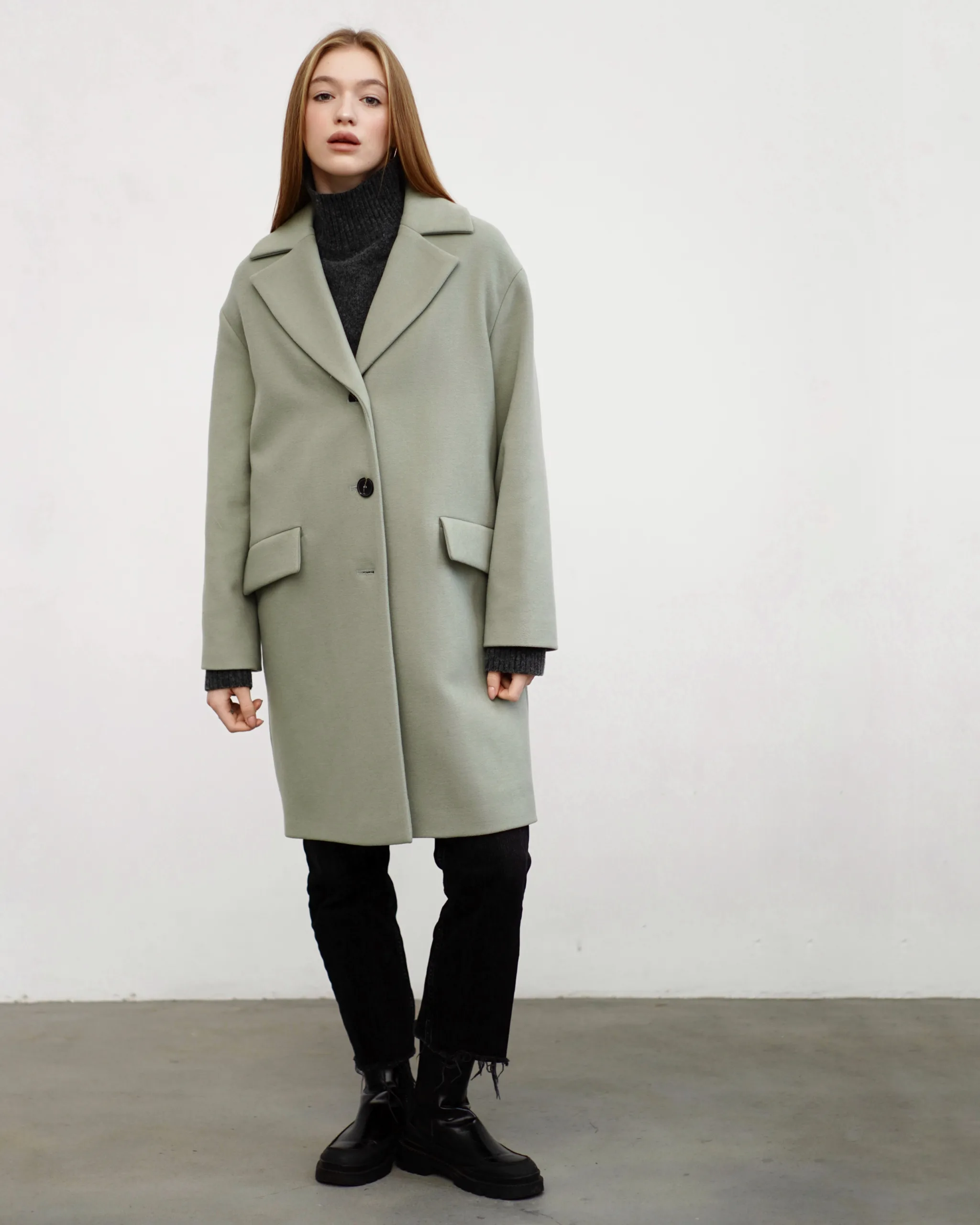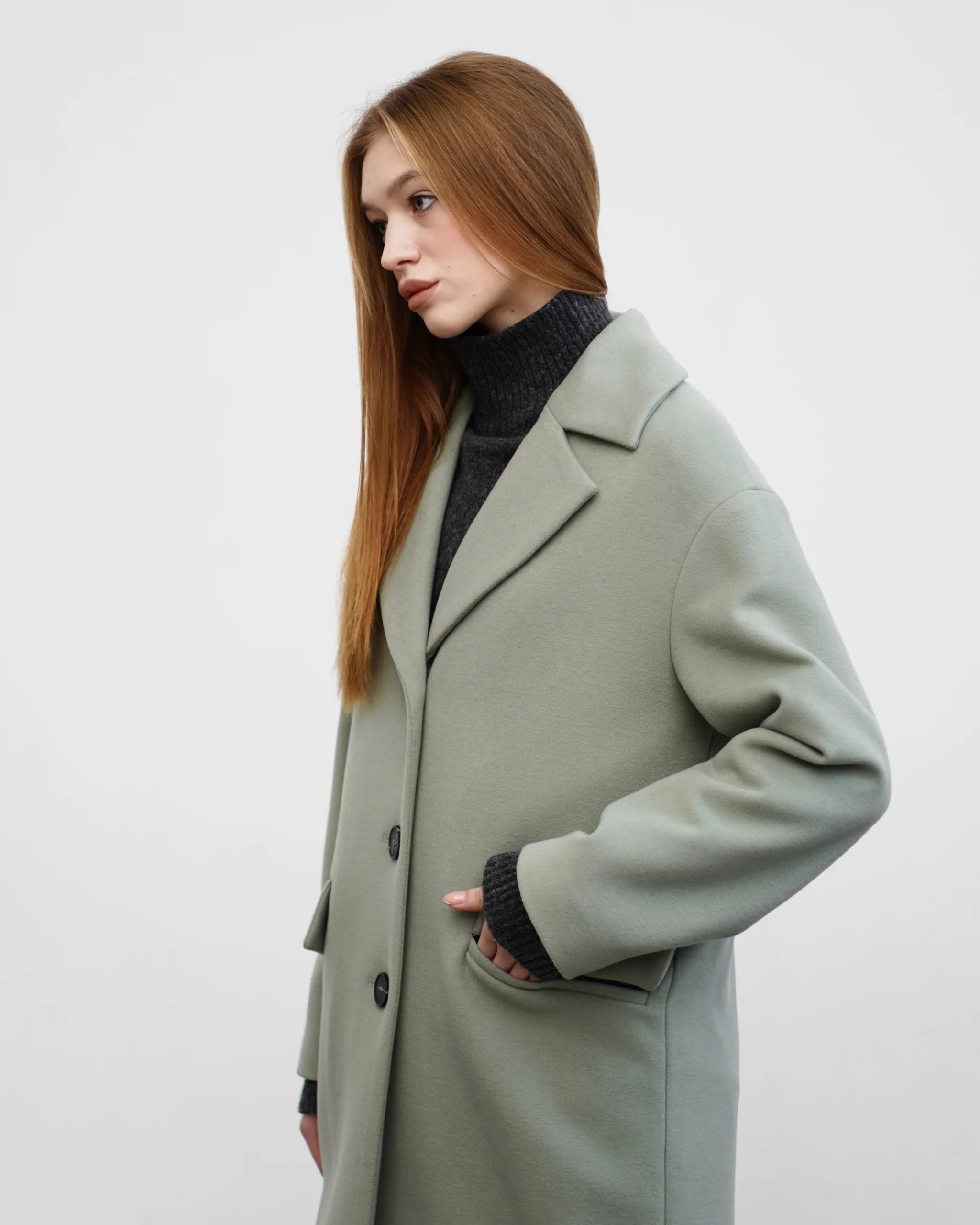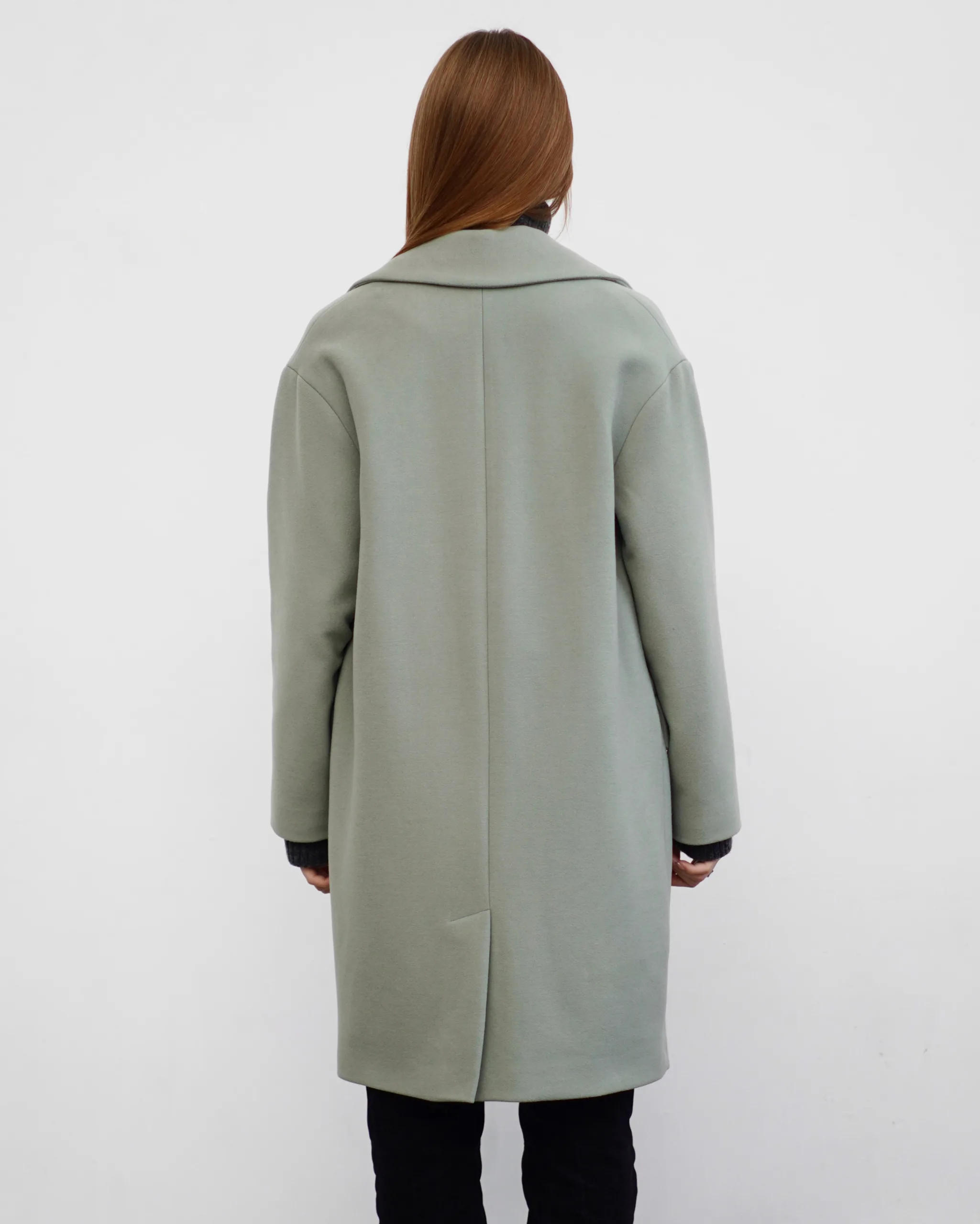 Straight-cut double-breasted coat with a two-button fastener, a dropped armhole and set-in sleeves. Turn-down collar with sides, welt pockets with a leaf. The back has a medium seam with a slot.
