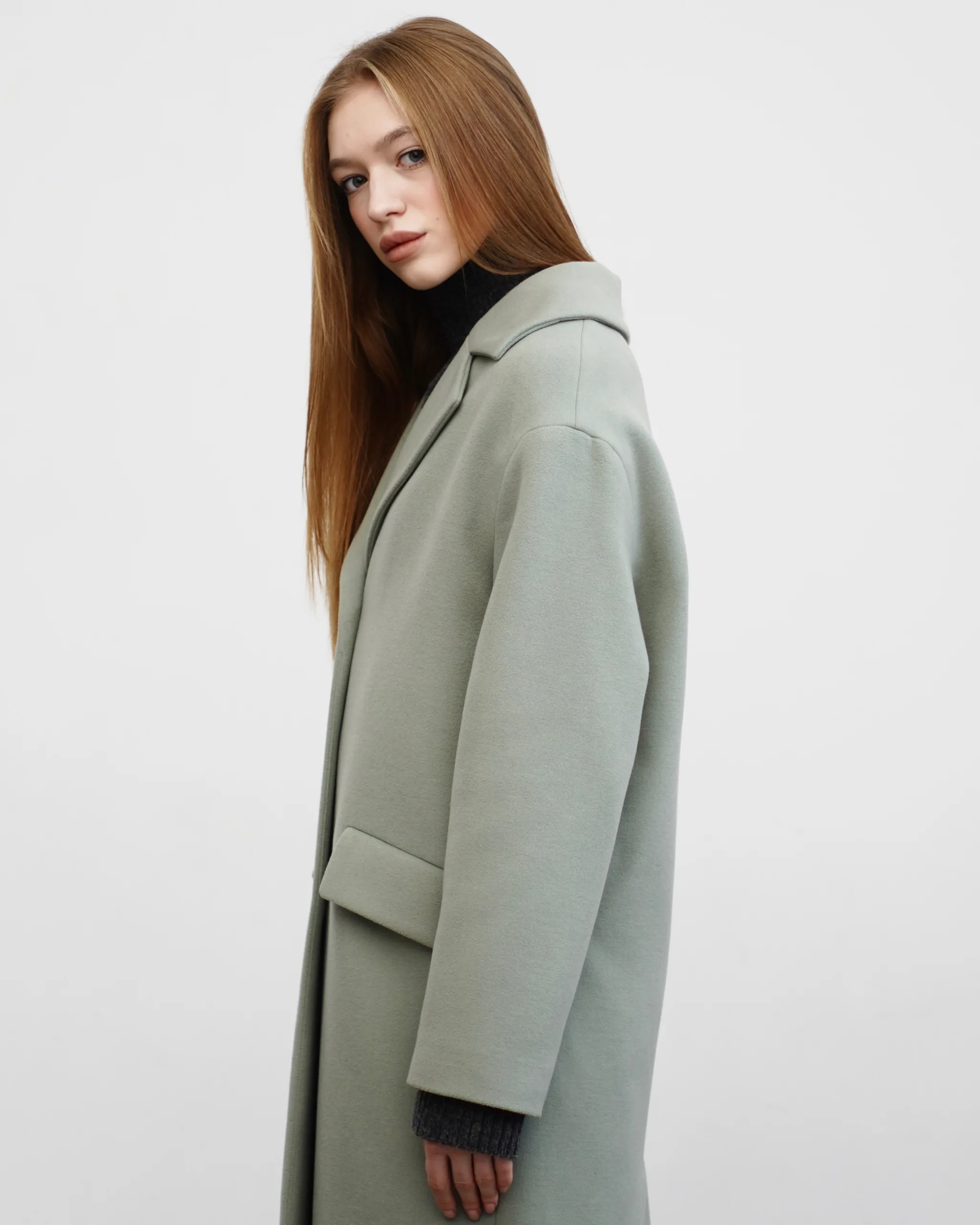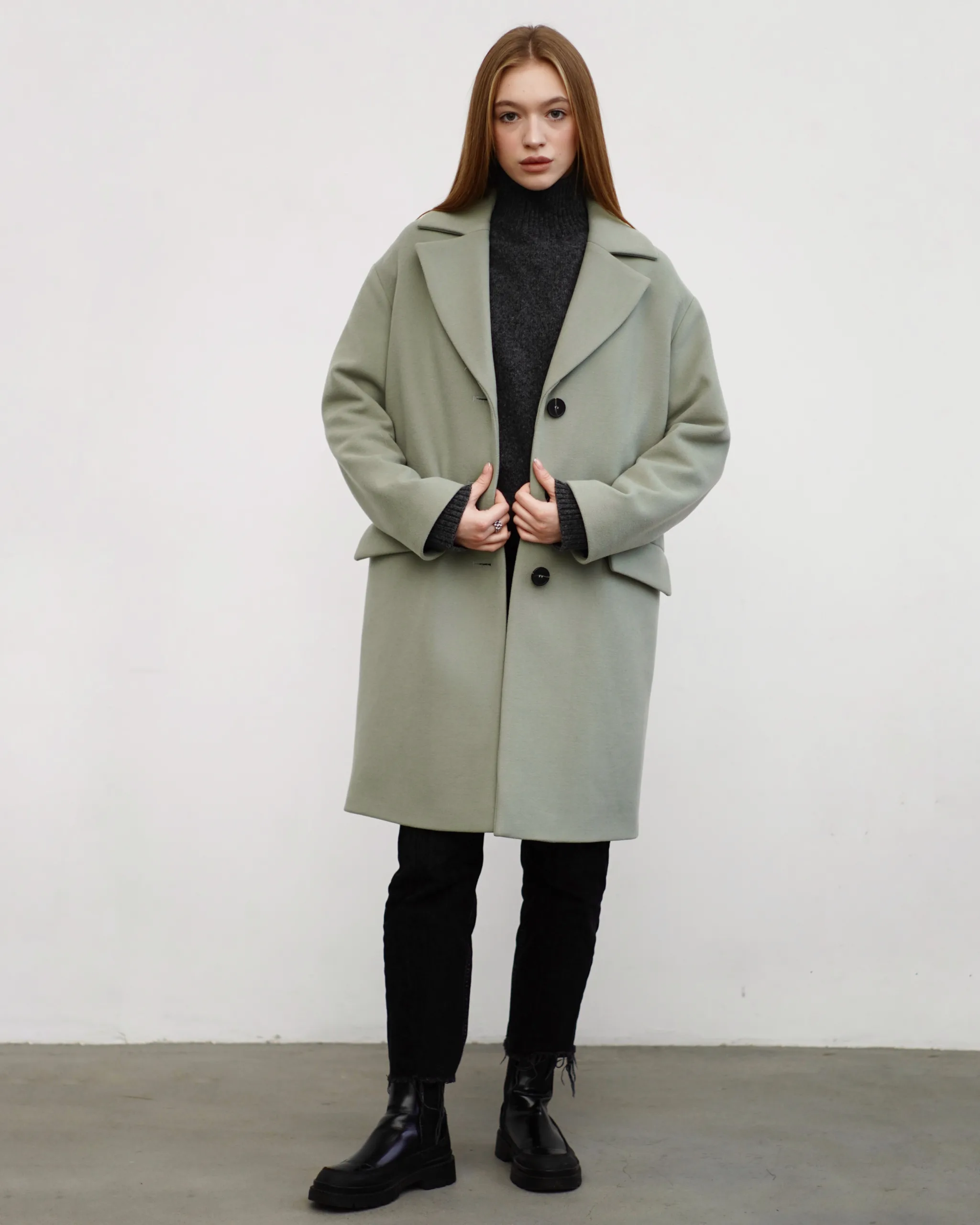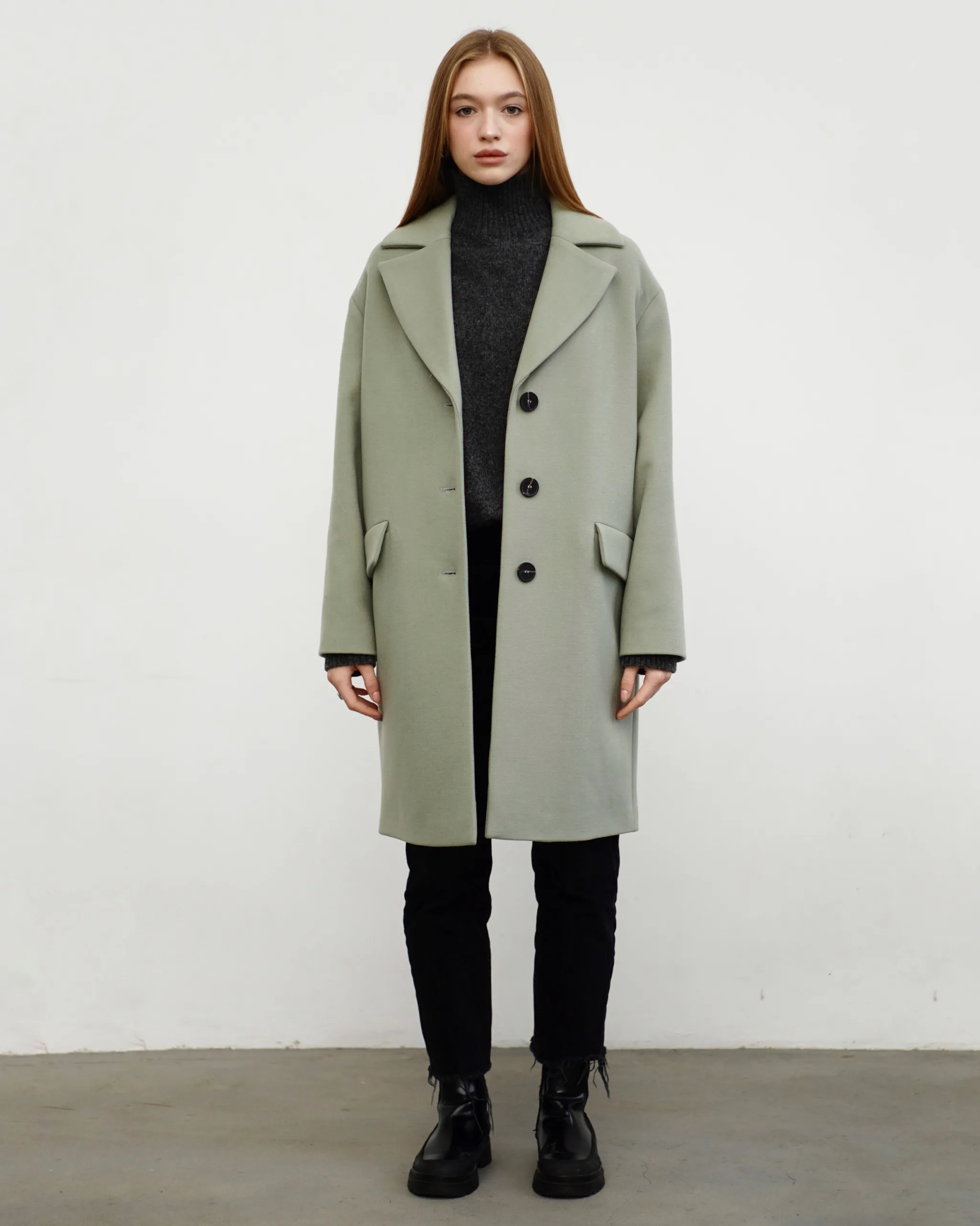 Straight-cut double-breasted coat with a two-button fastener, a dropped armhole and set-in sleeves. Turn-down collar with sides, welt pockets with a leaf. The back has a medium seam with a slot.