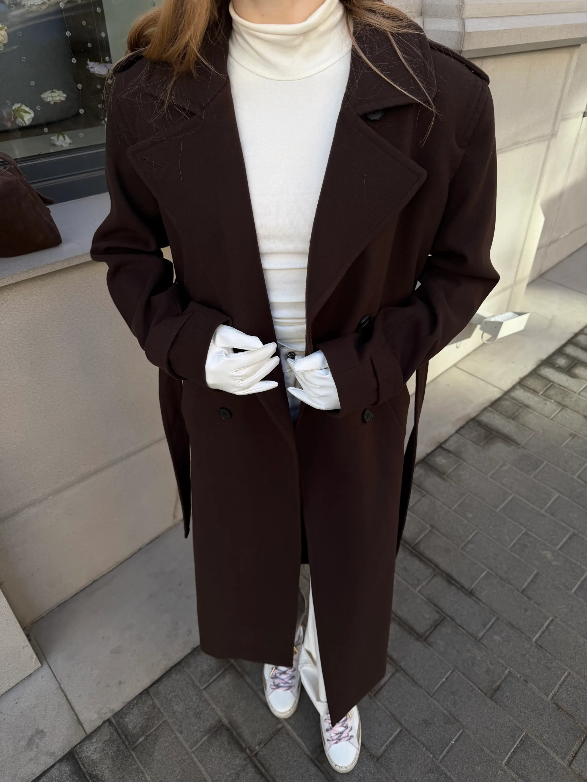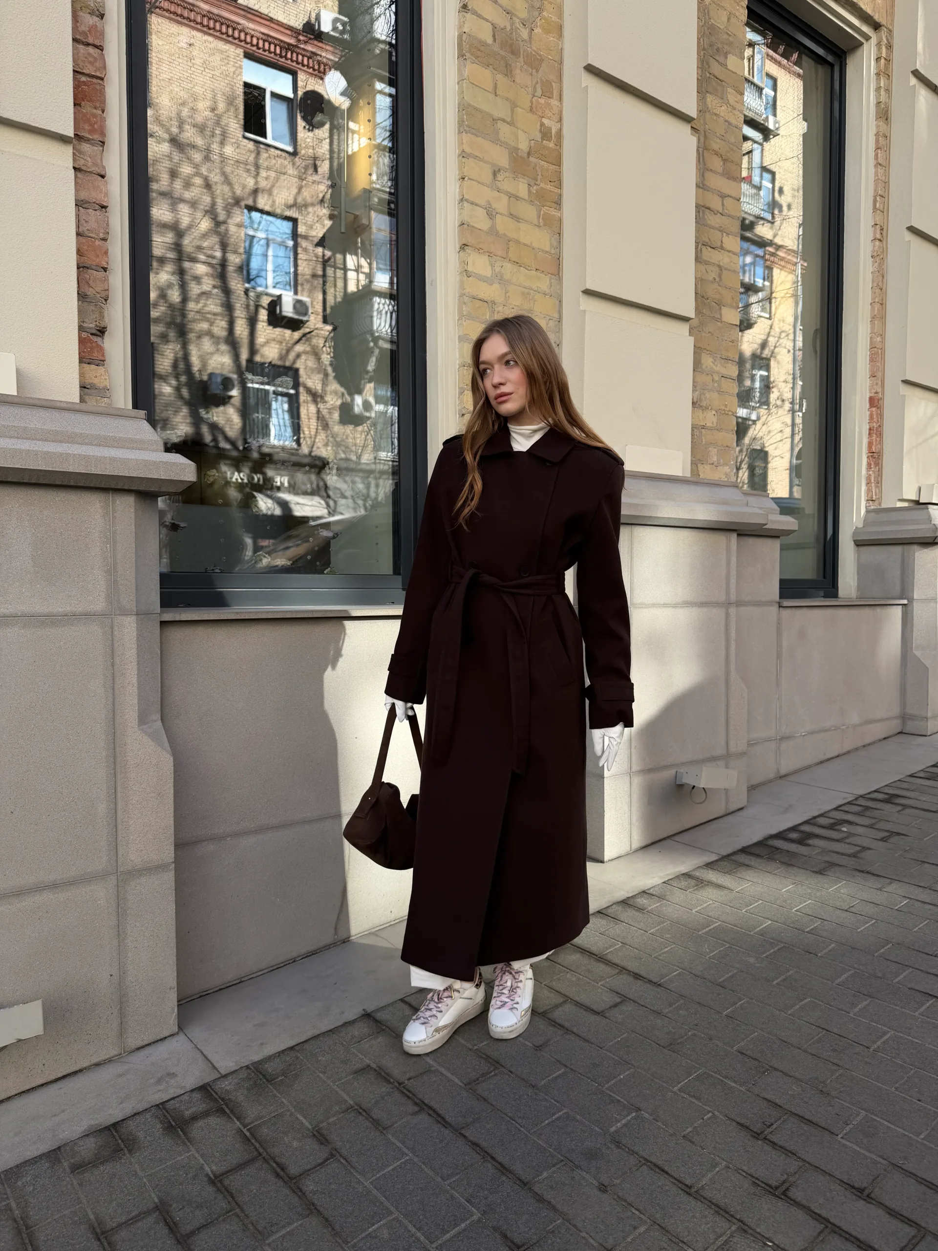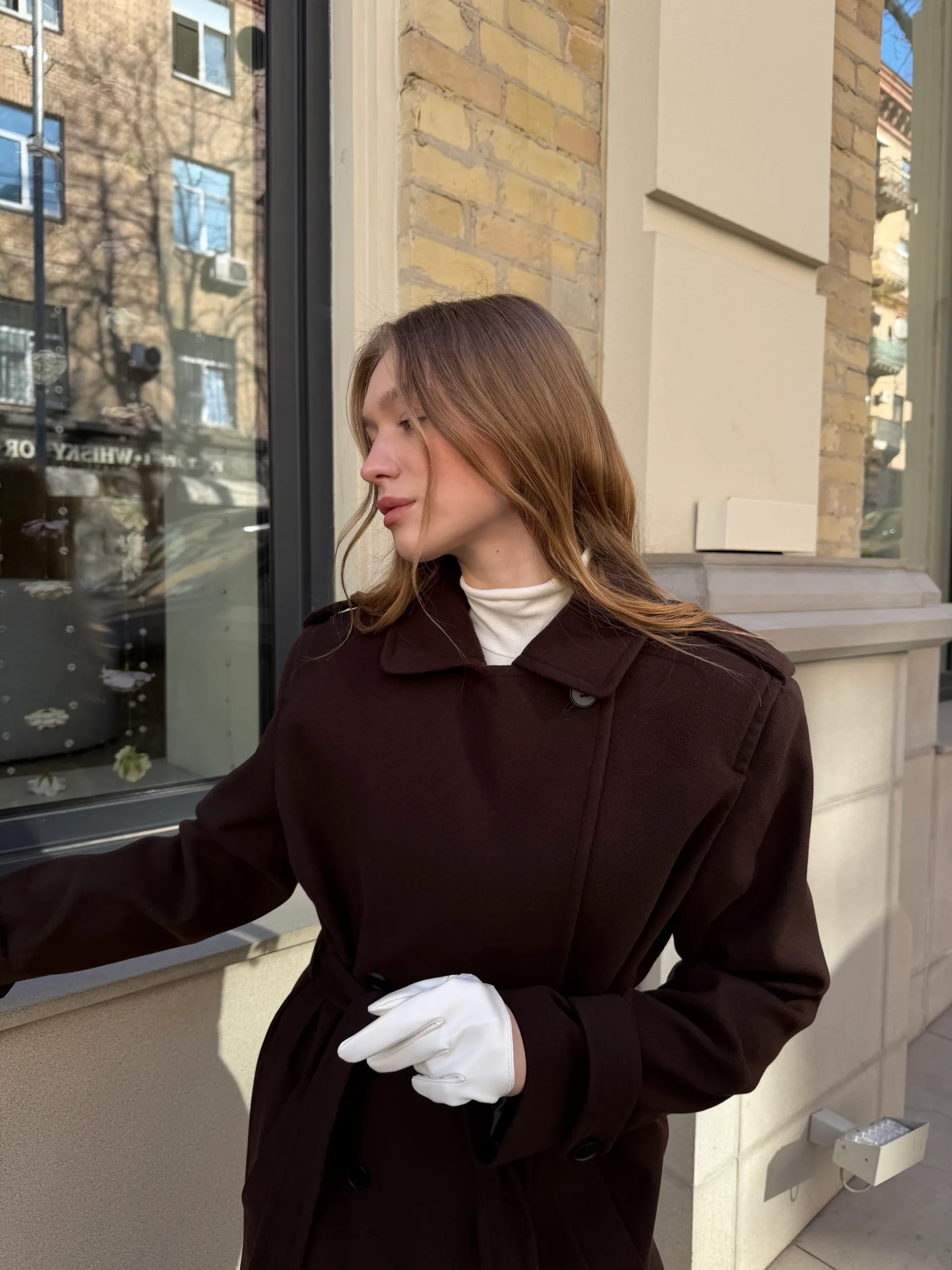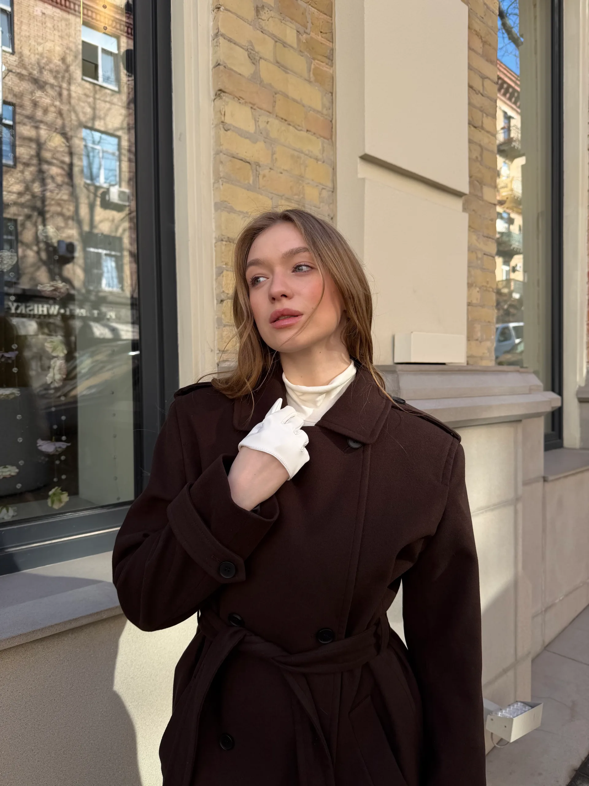 Двобортне демісезонне пальто-тренч прямого силуету з поясом. Поєднує в собі риси класичного тренча та демісезонного пальто.