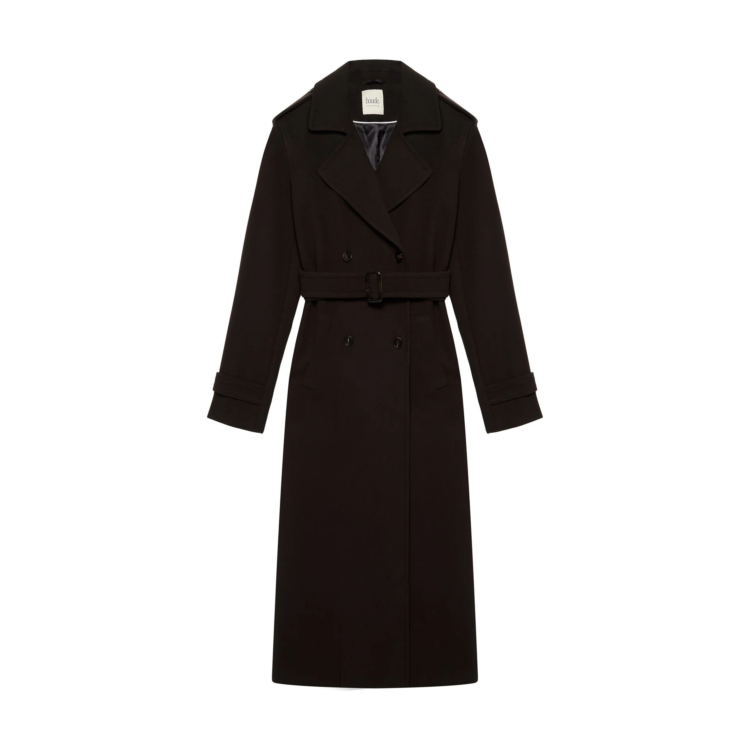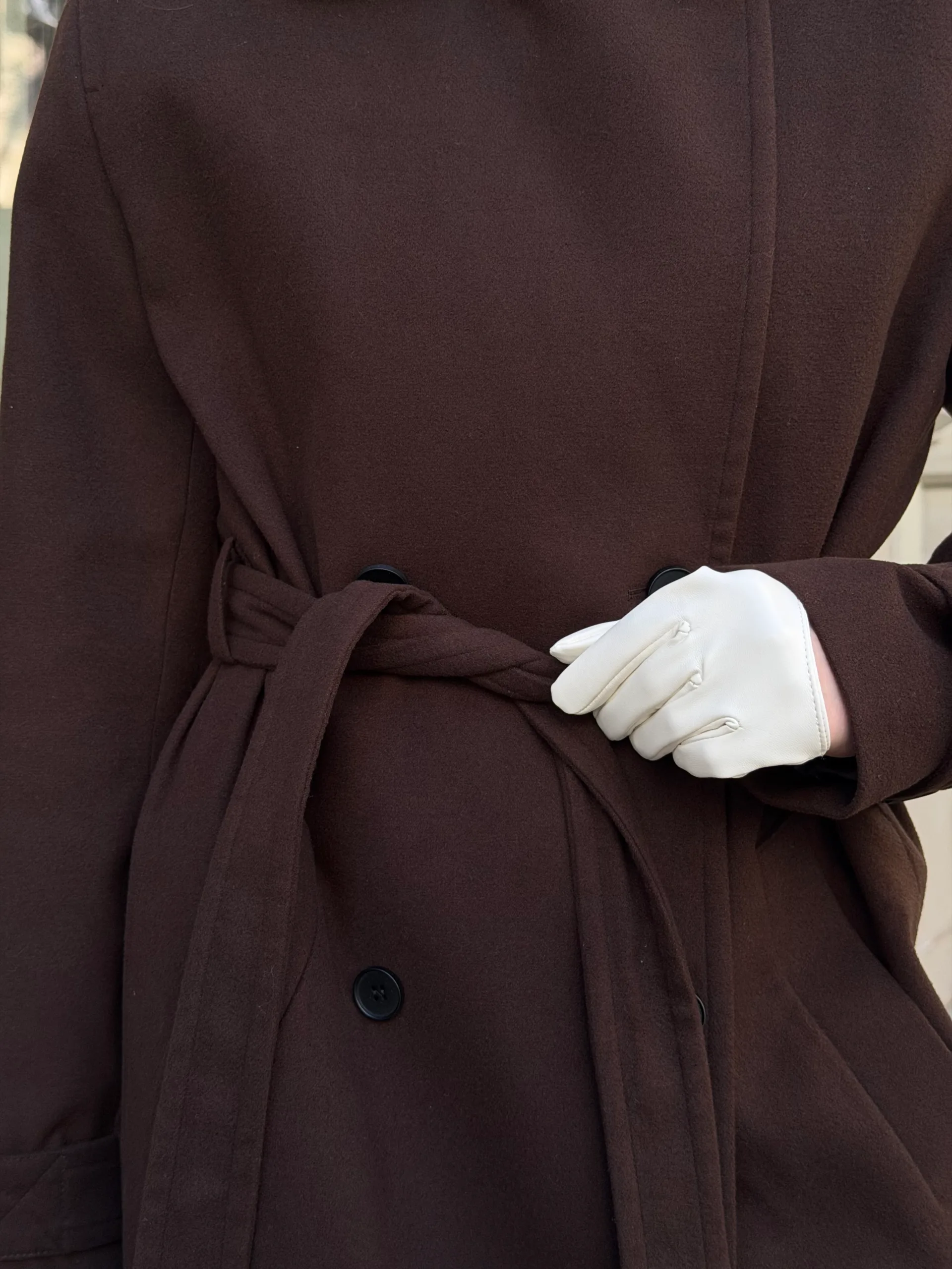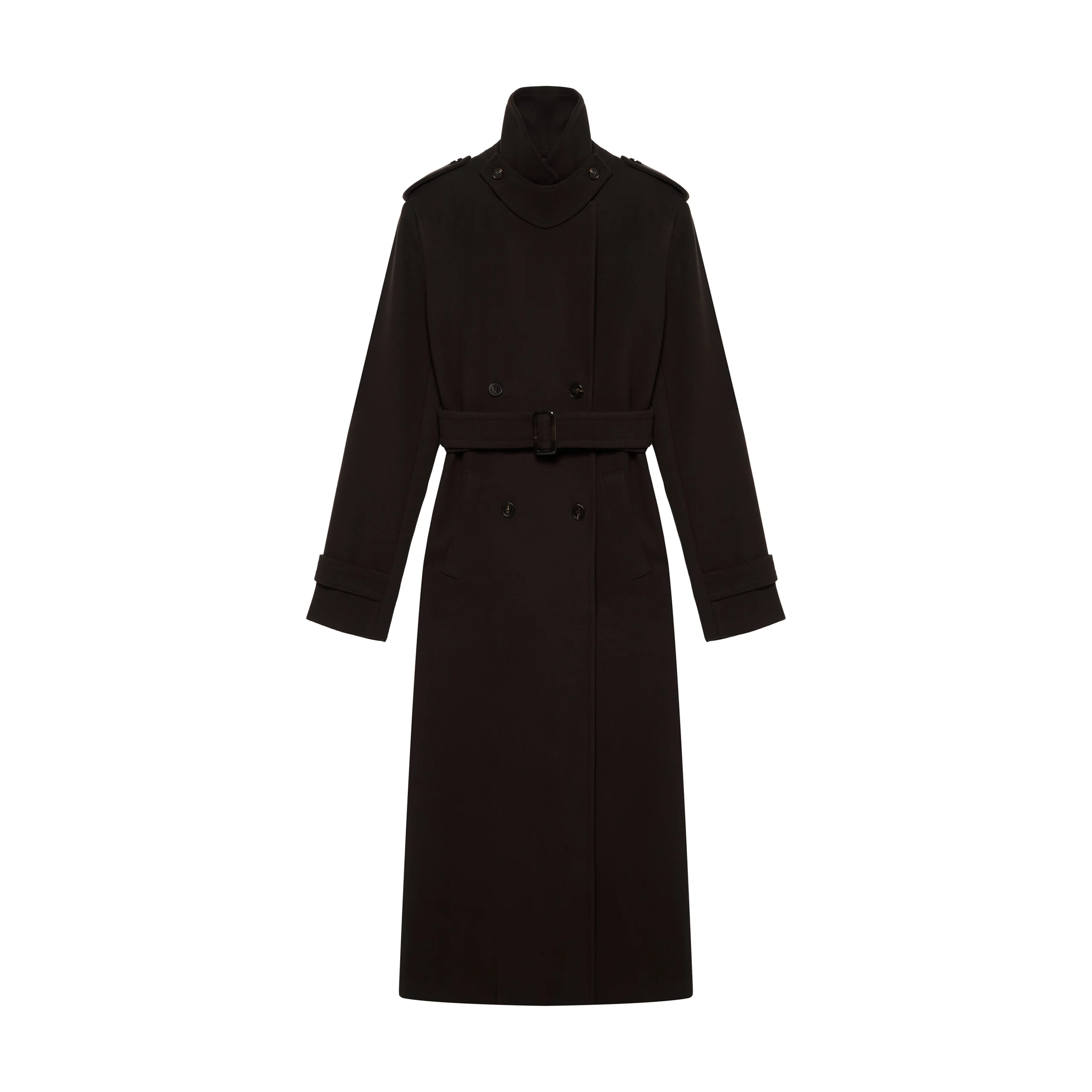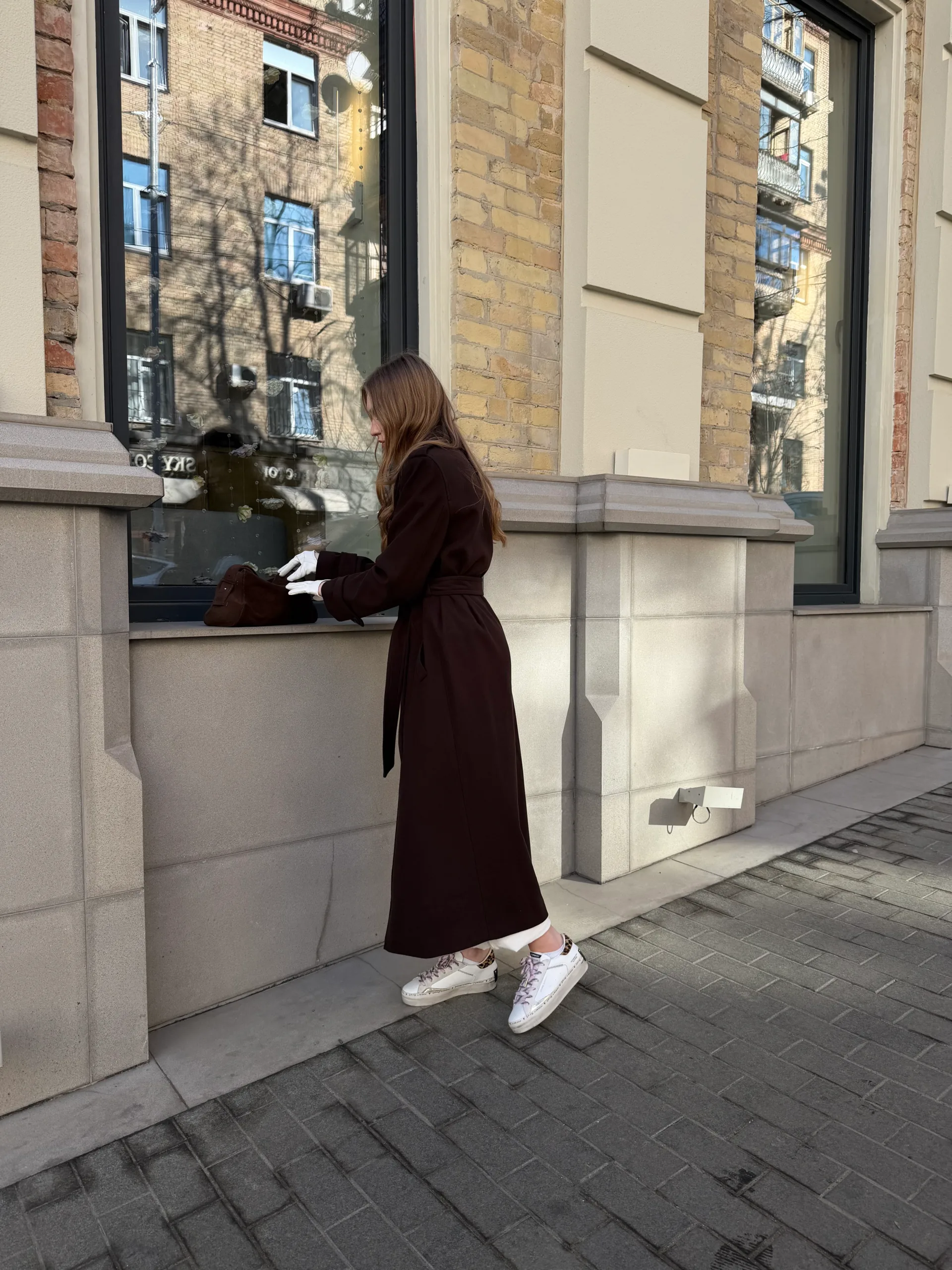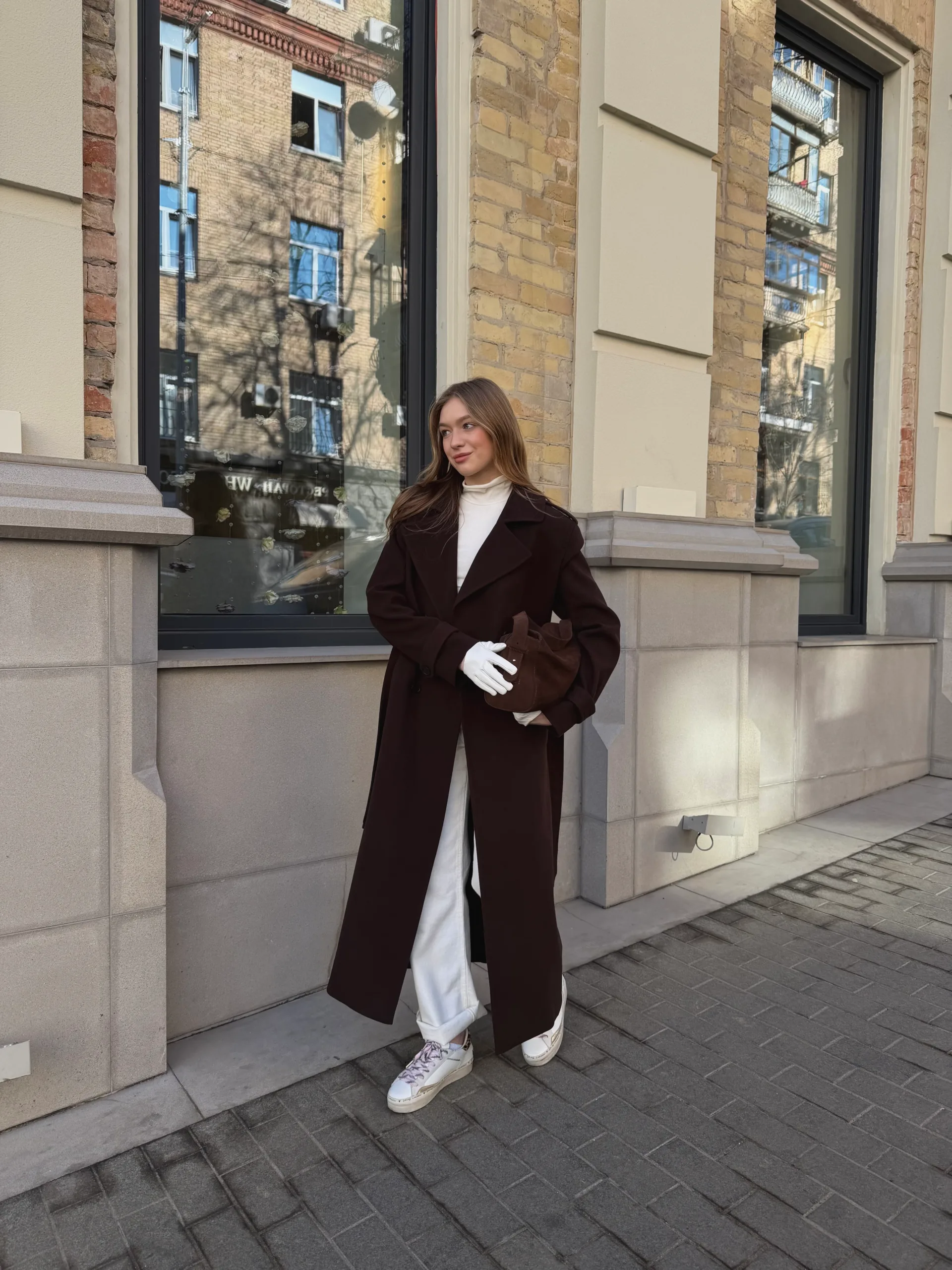 Двобортне демісезонне пальто-тренч прямого силуету з поясом. Поєднує в собі риси класичного тренча та демісезонного пальто.