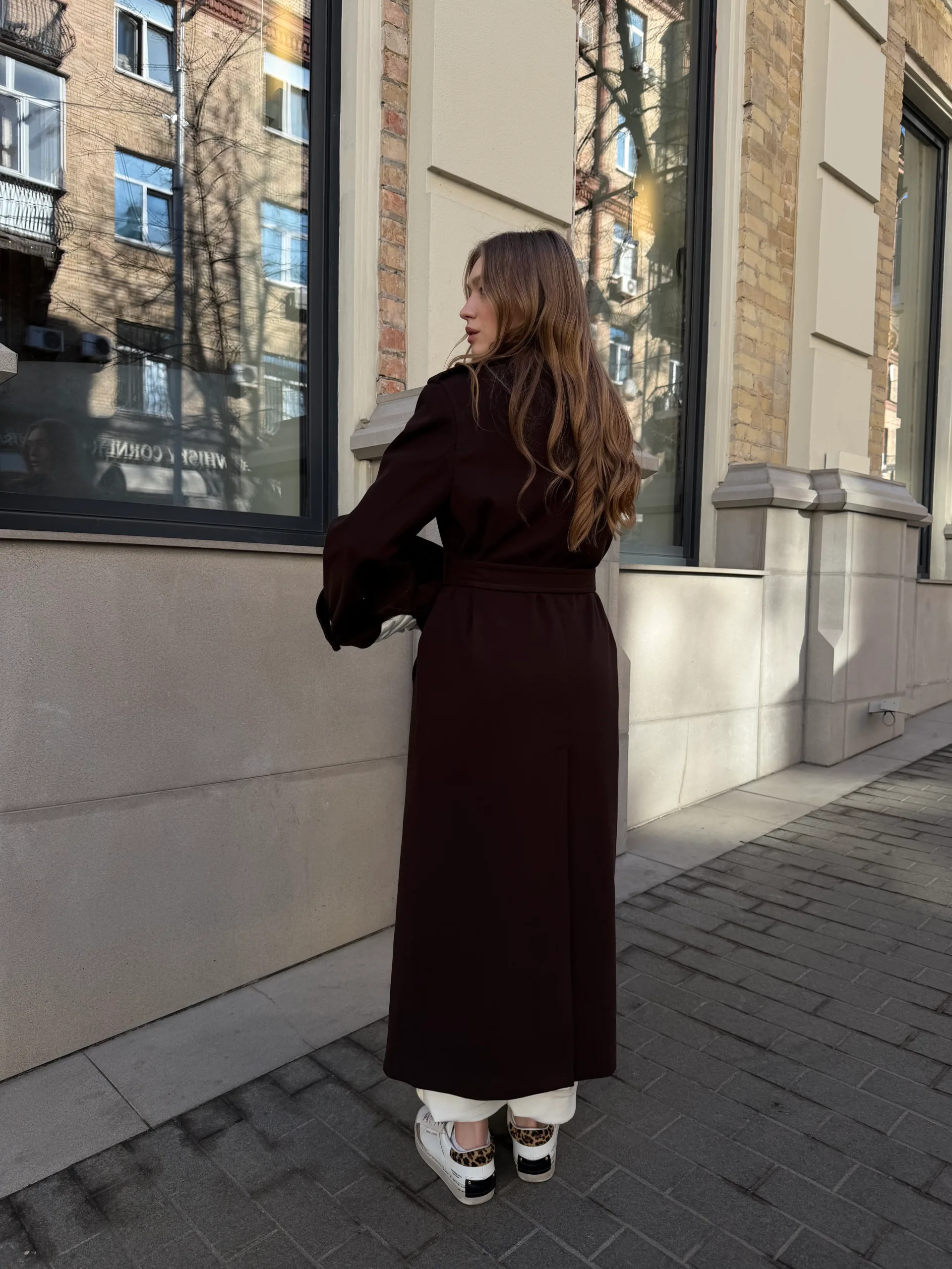Пальто двобортне прямого силуету, під пояс із застібкою на два гудзики.