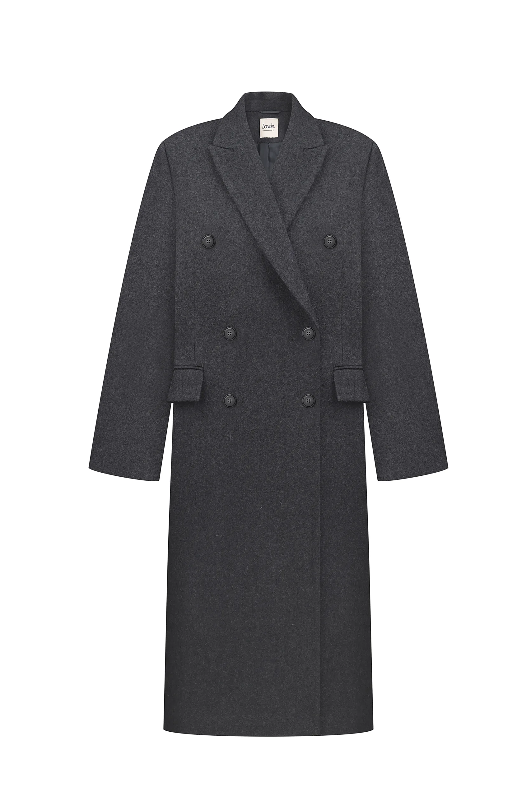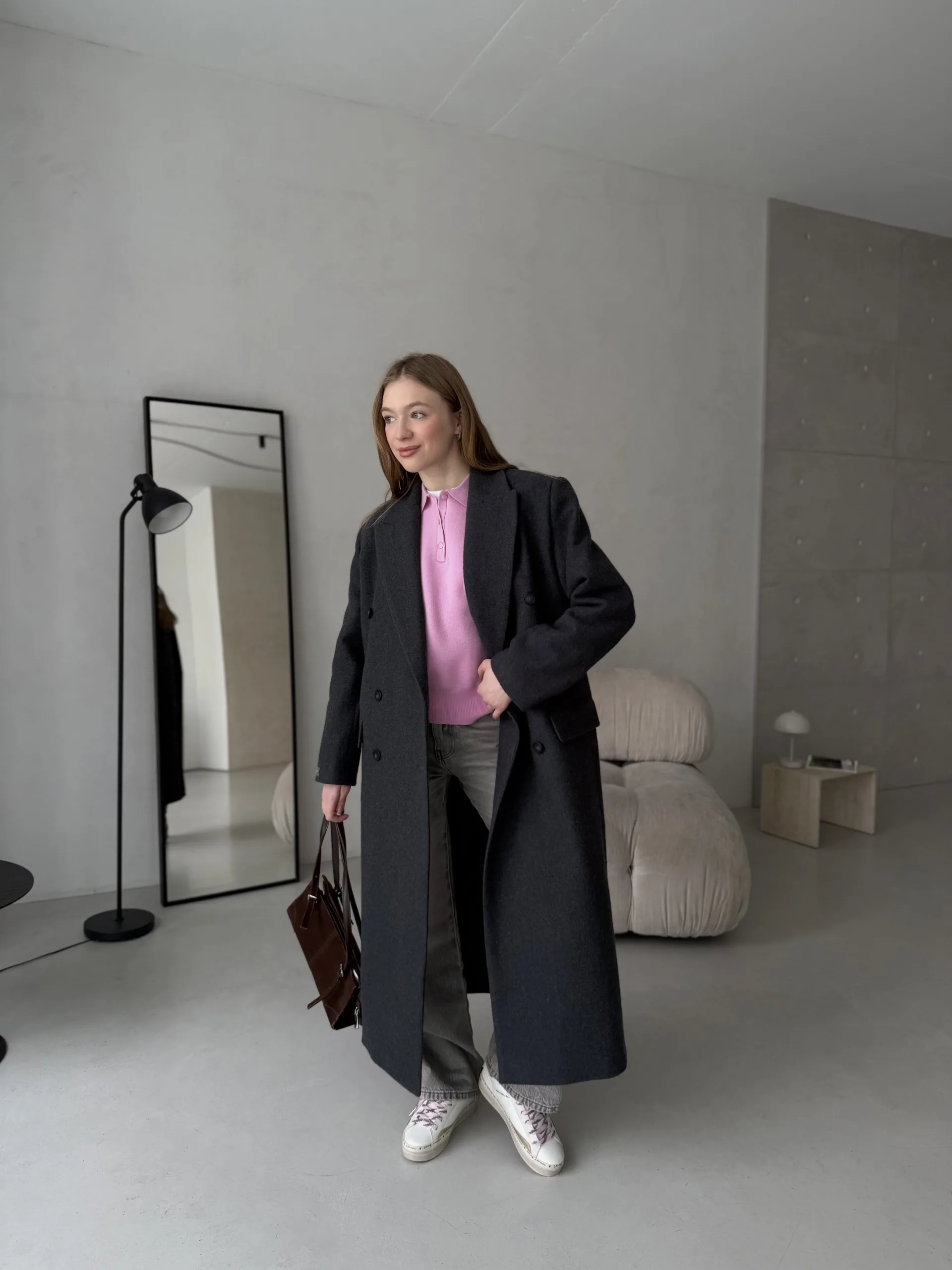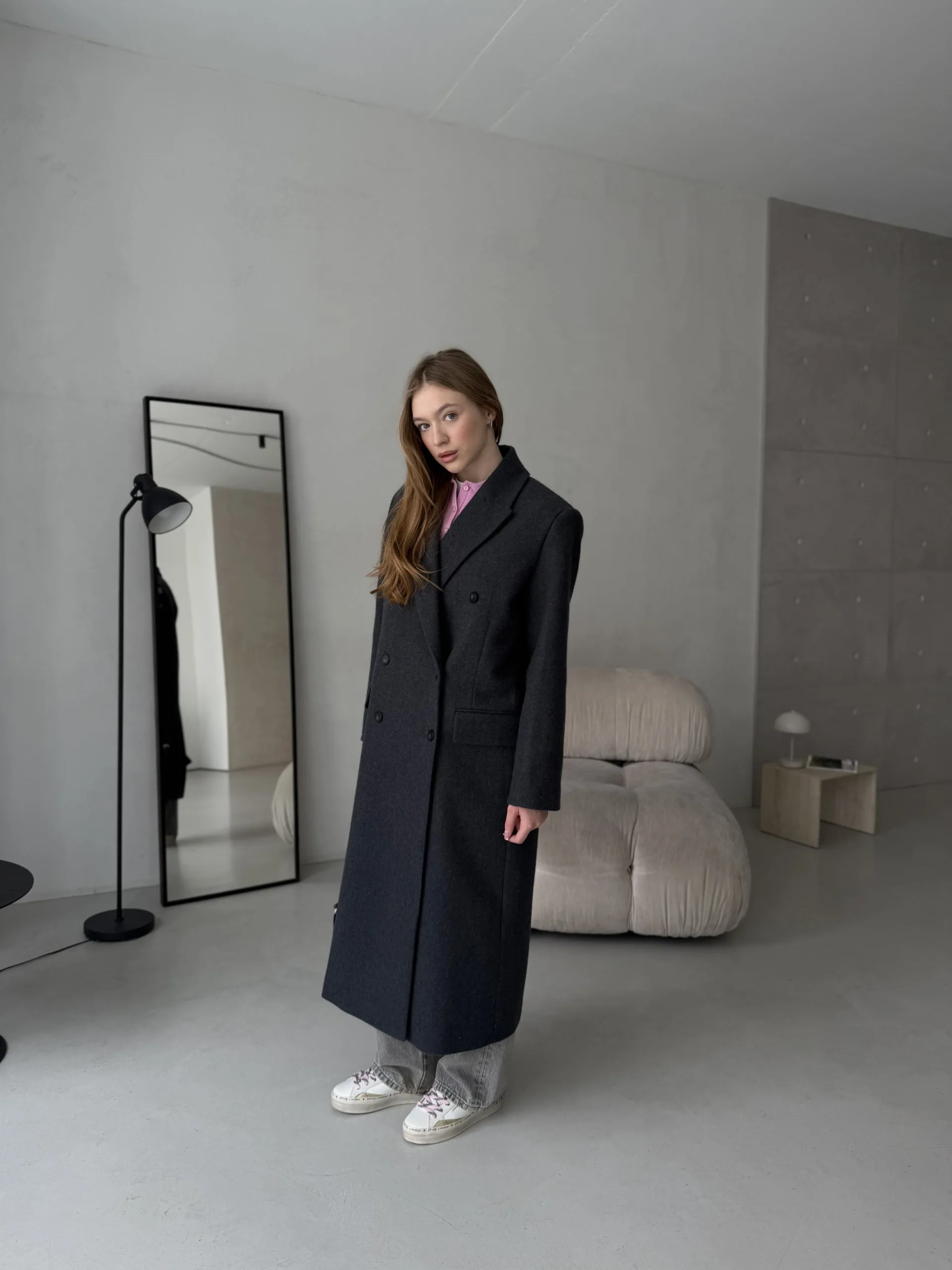 Двобортне демісезонне оверсайз пальто з акцентними плечами.