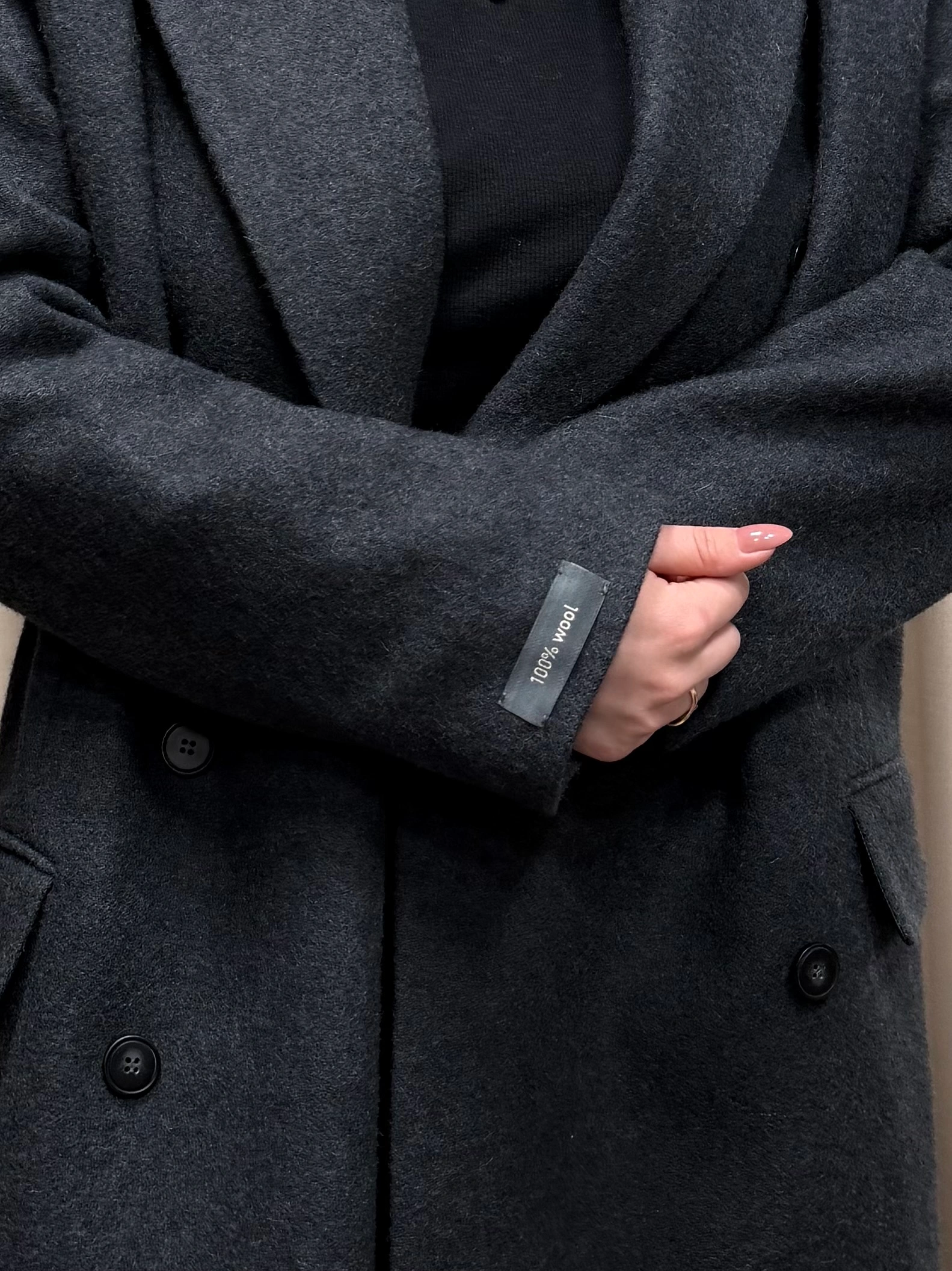 Двобортне пальто напівприлеглого силуету з застібкою на два ґудзики, та оздобленням з шести ґудзиків.
