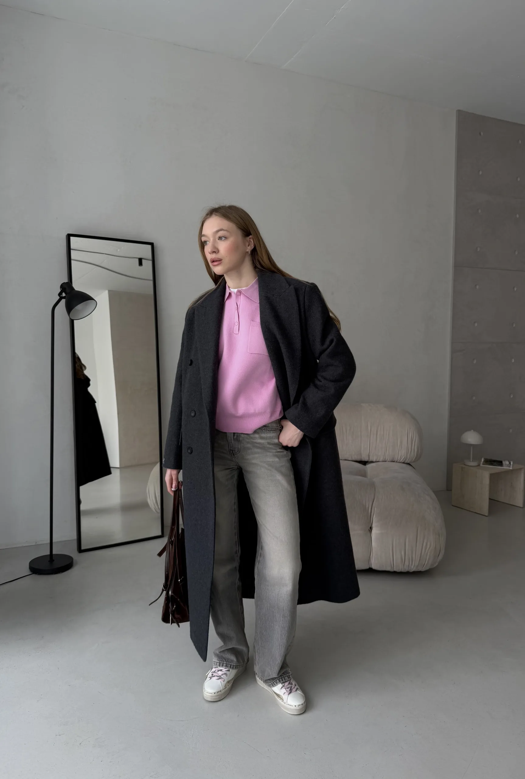 Двобортне пальто напівприлеглого силуету з застібкою на шість ґудзиків.