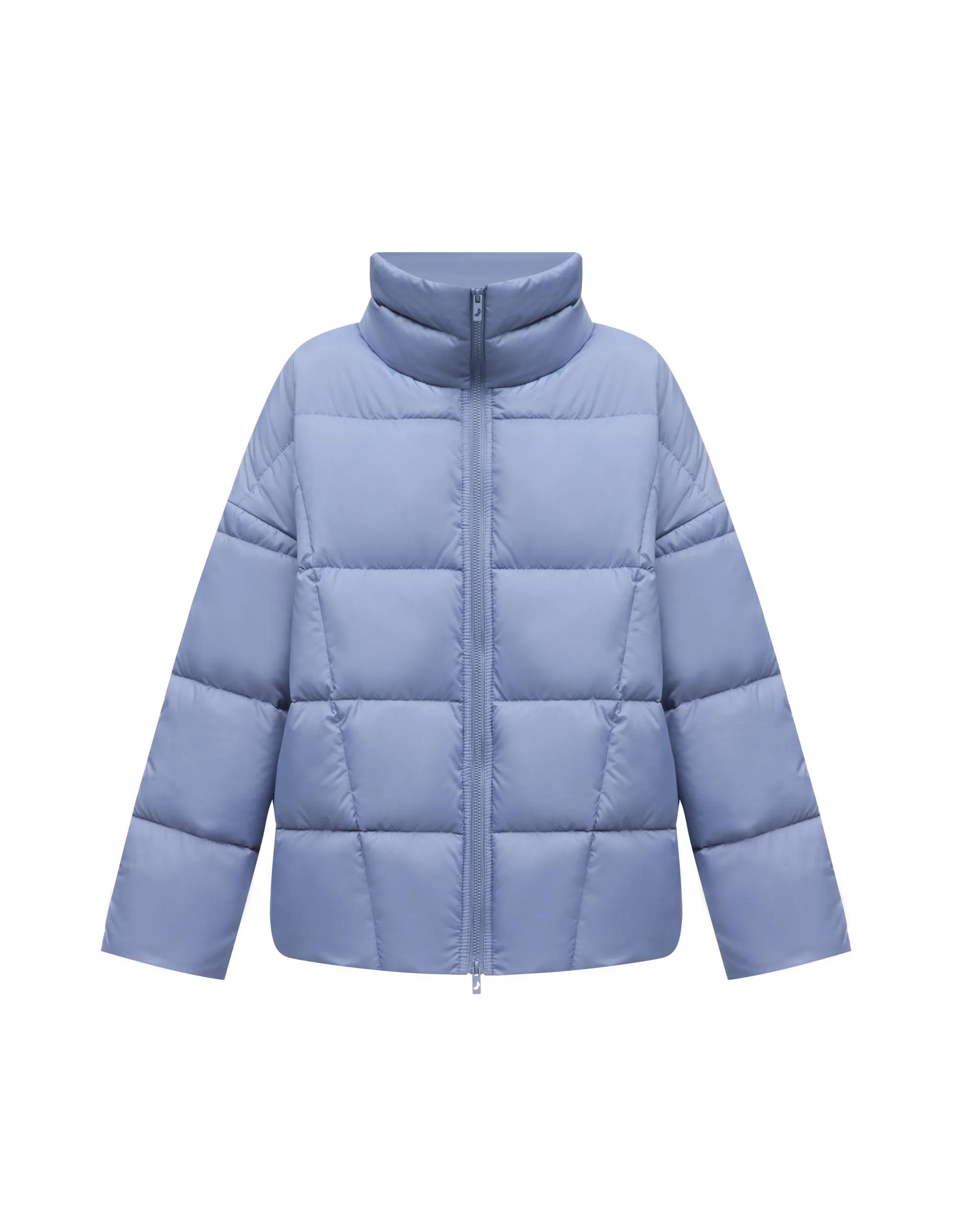 Пуховик-куртка однобортна, з застібкою на двосторонню блискавку, з коміром-стійкою та втачними рукавами з манжетом на еластичну стрічку (резинку). На полочці дві накладні кишені з накладним клапаном на дві кнопки. На лінії талії куліска з вдітим шнурком-мотузкою. До горловиникріпиться на блискавці з`ємний капюшон.