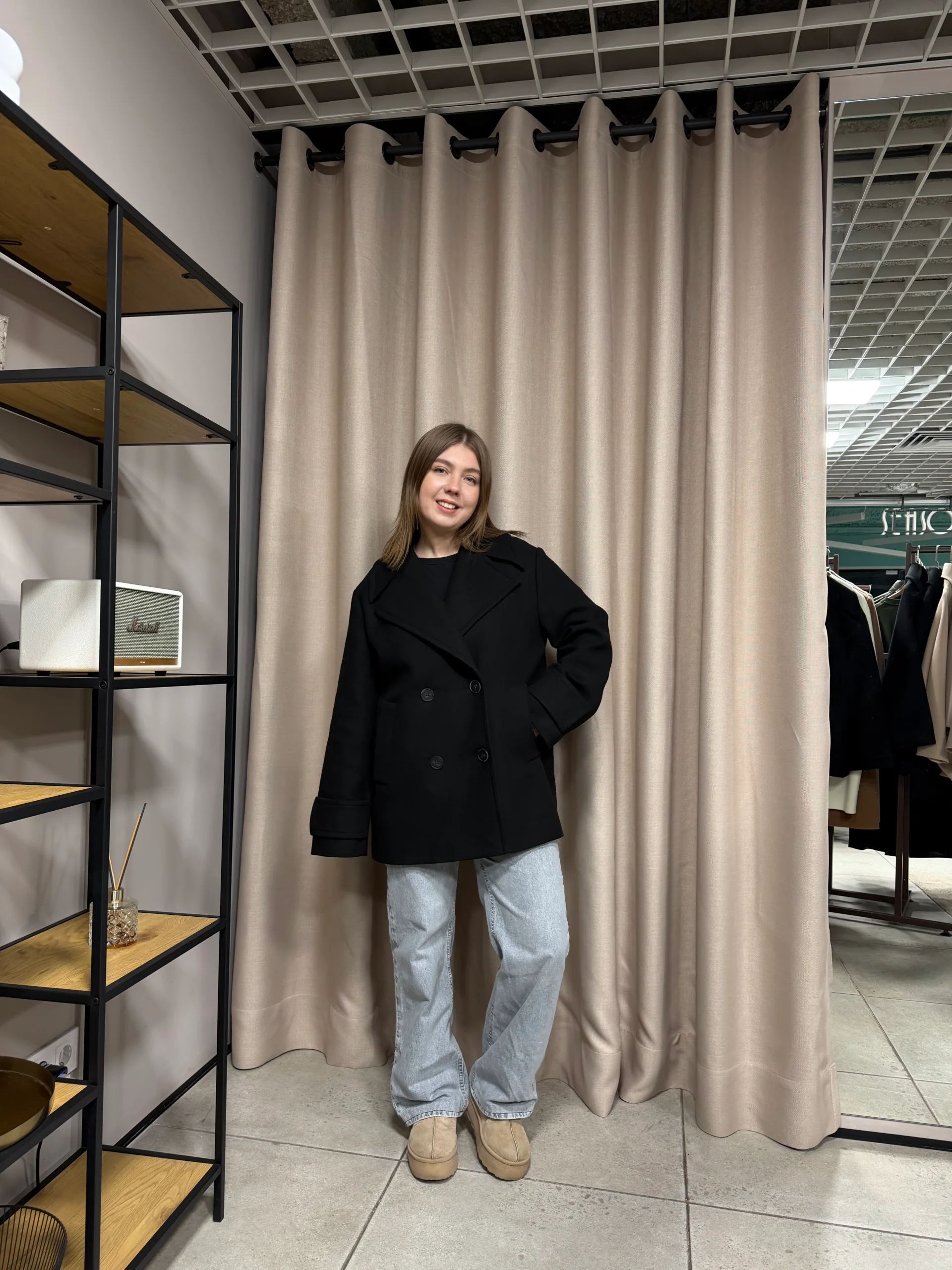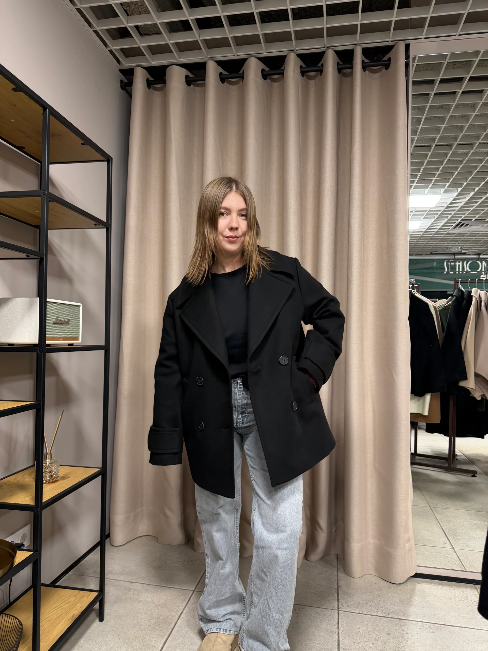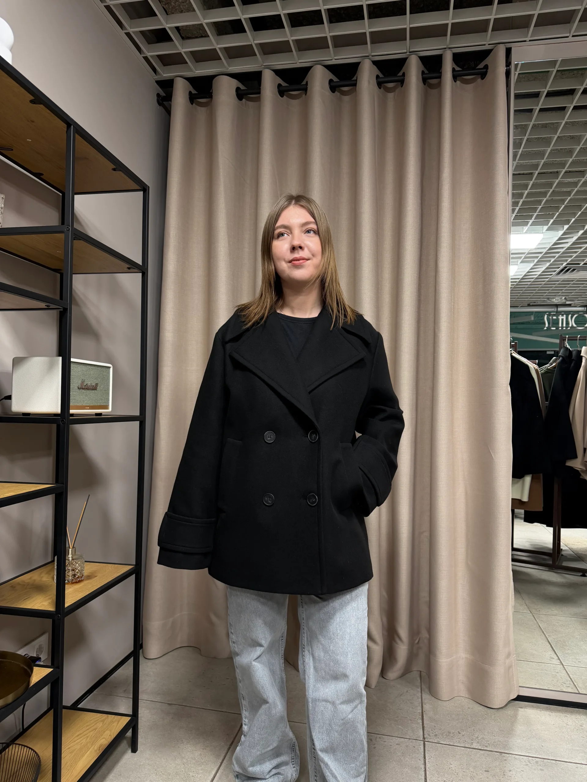 Виконана з пальтової тканини, яка добре тримає форму та забезпечує комфорт у прохолодну погоду.