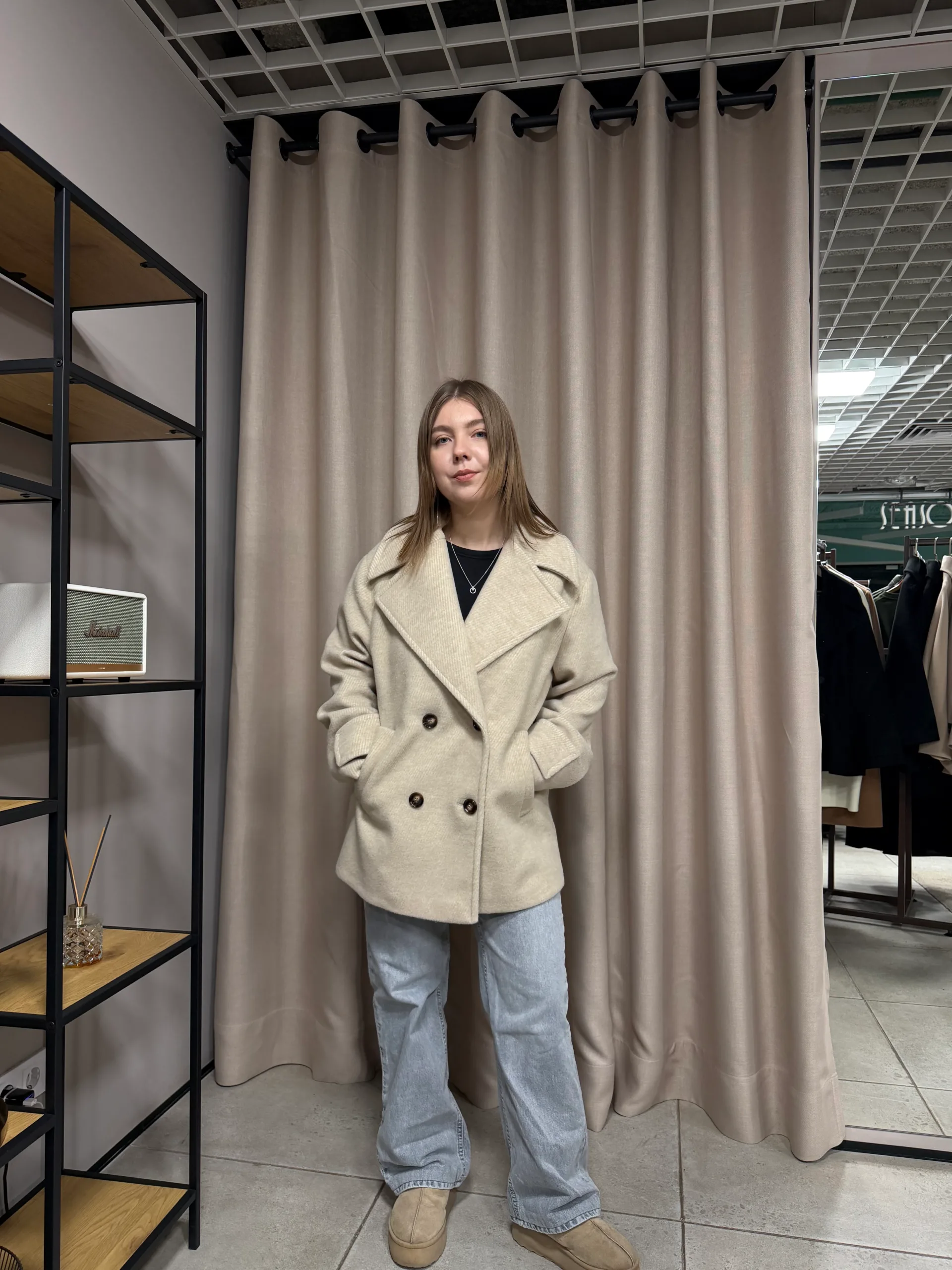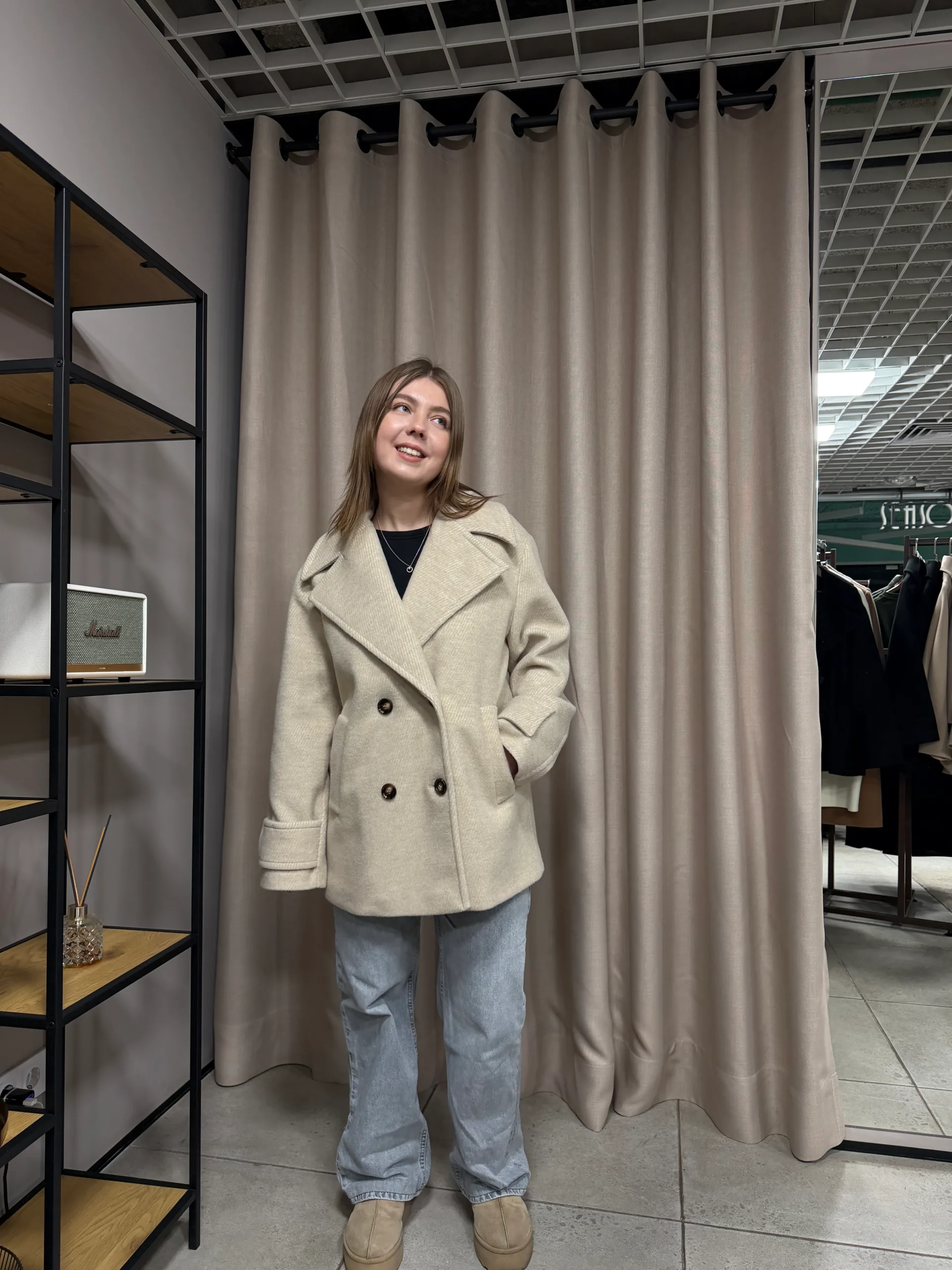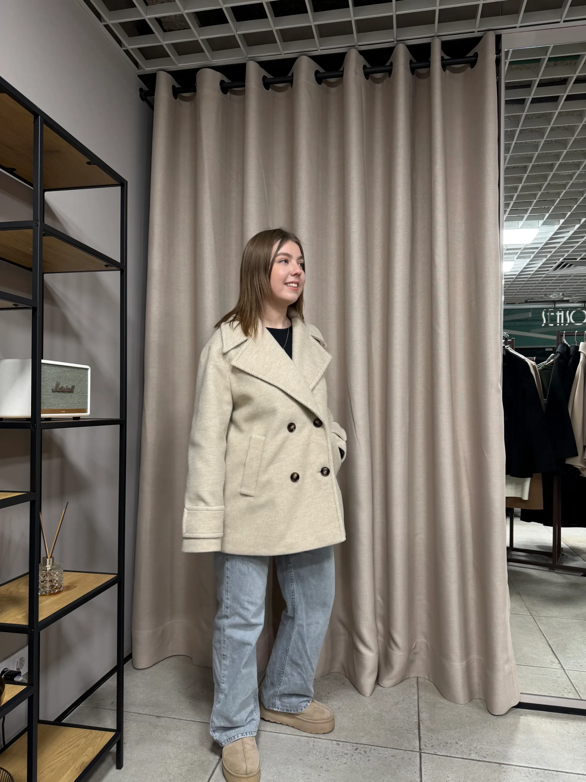 Пальто коротке двобортне з класичним відкладним коміром та застібкою на ґудзики.