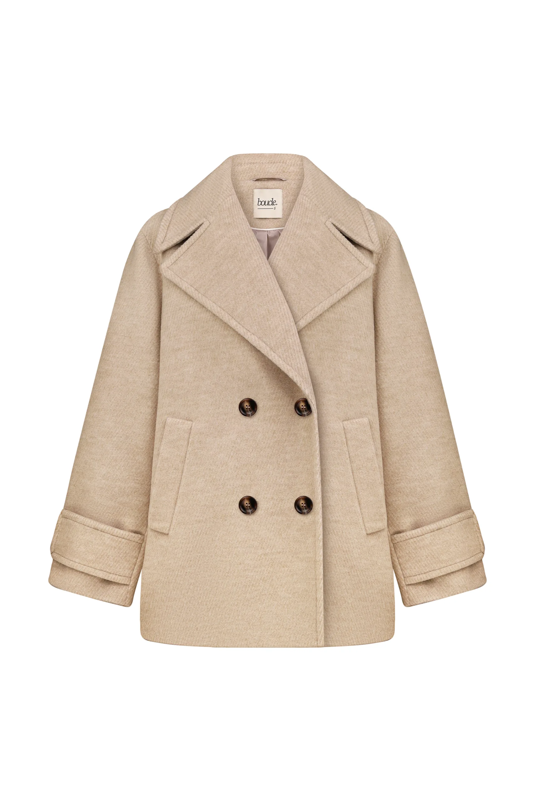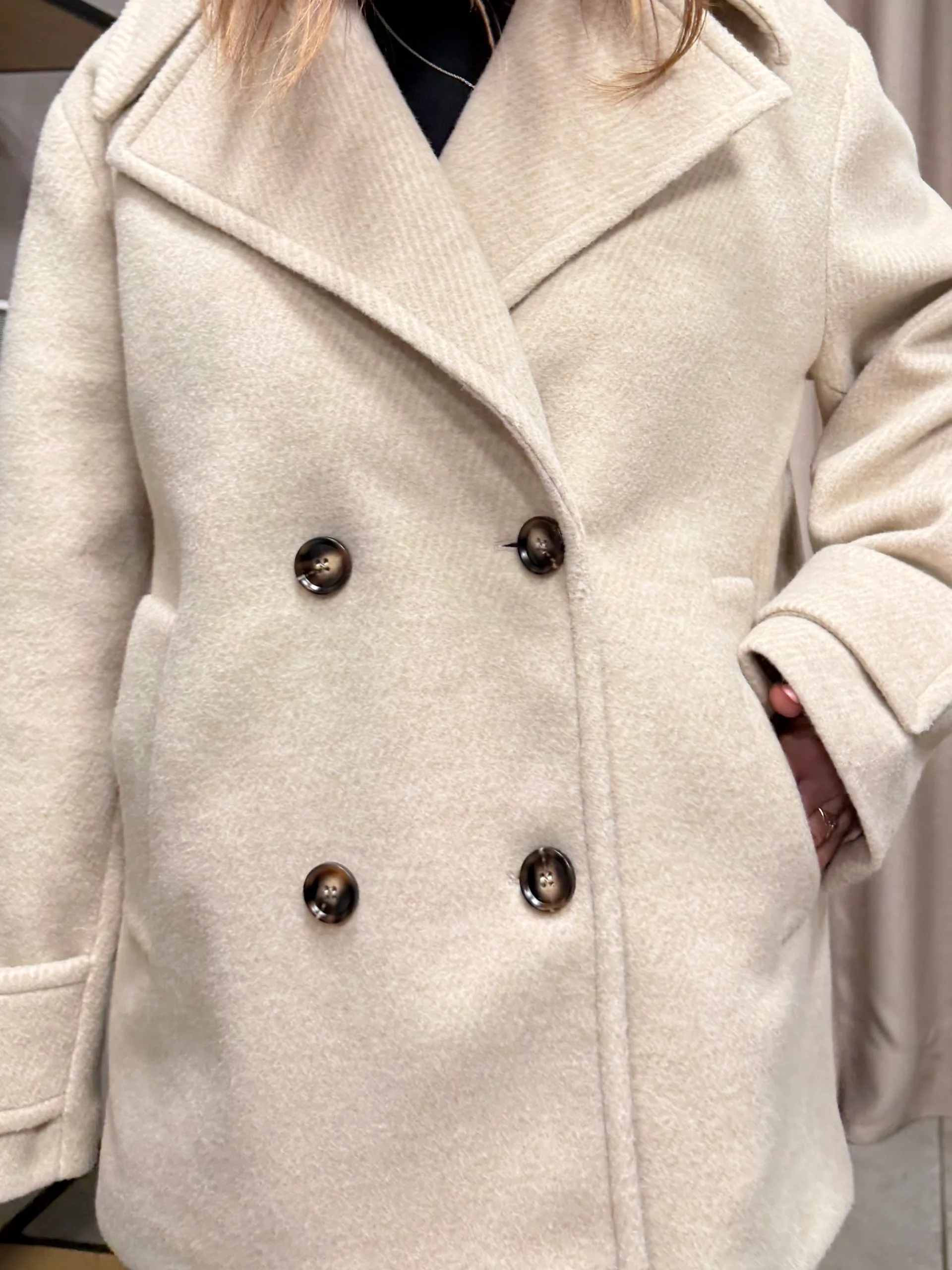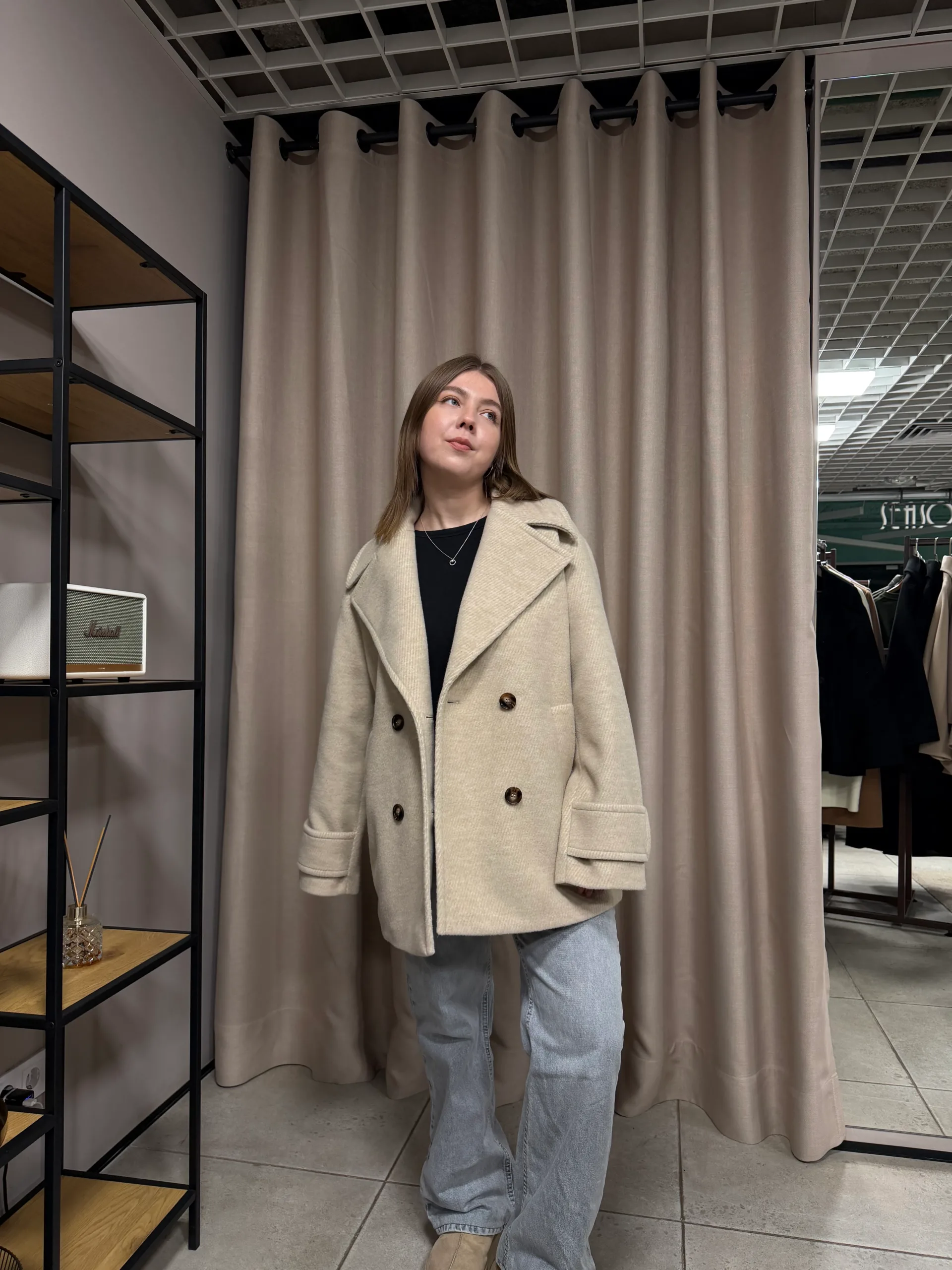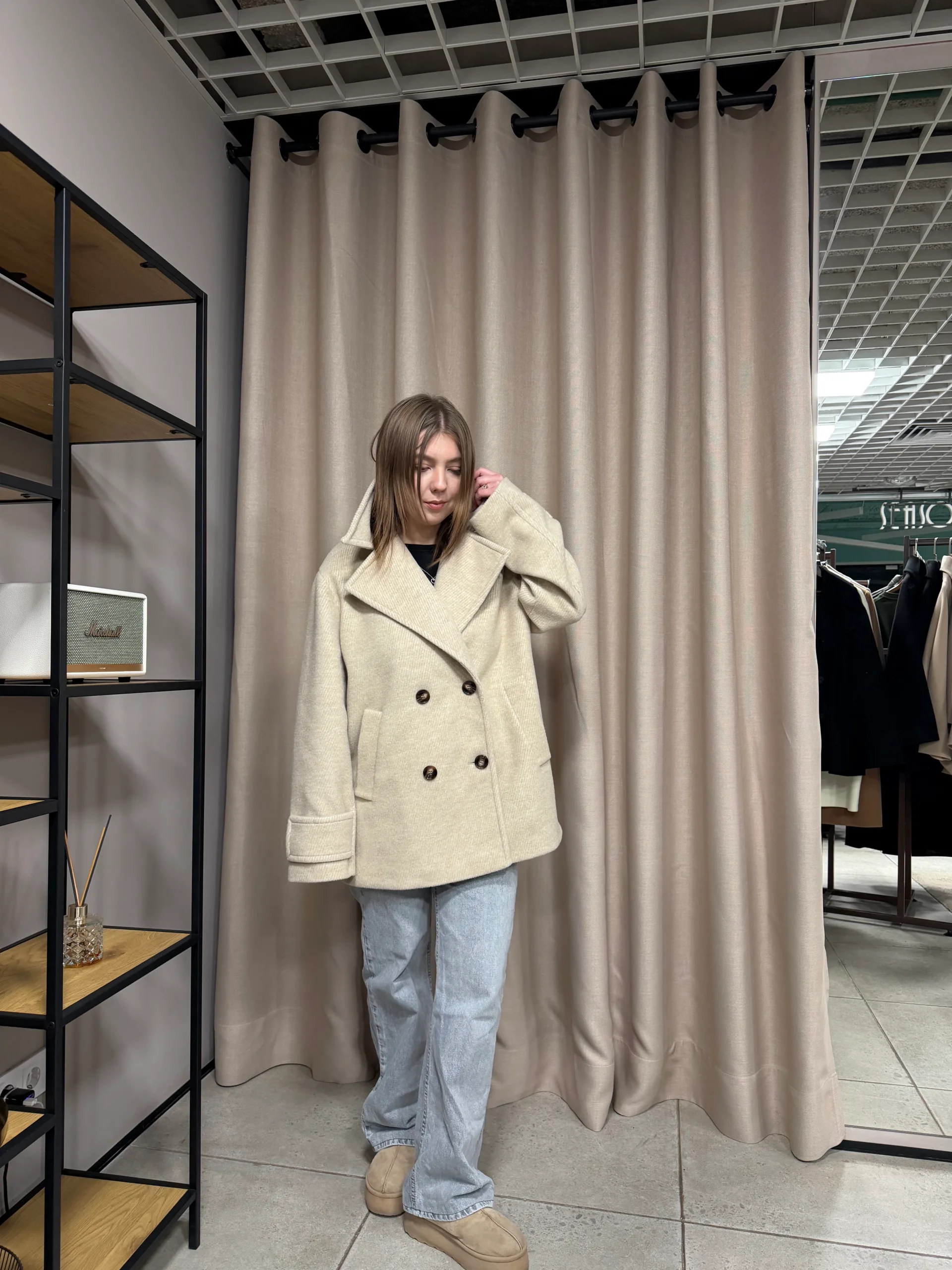 Пальто коротке двобортне з класичним відкладним коміром та застібкою на ґудзики.