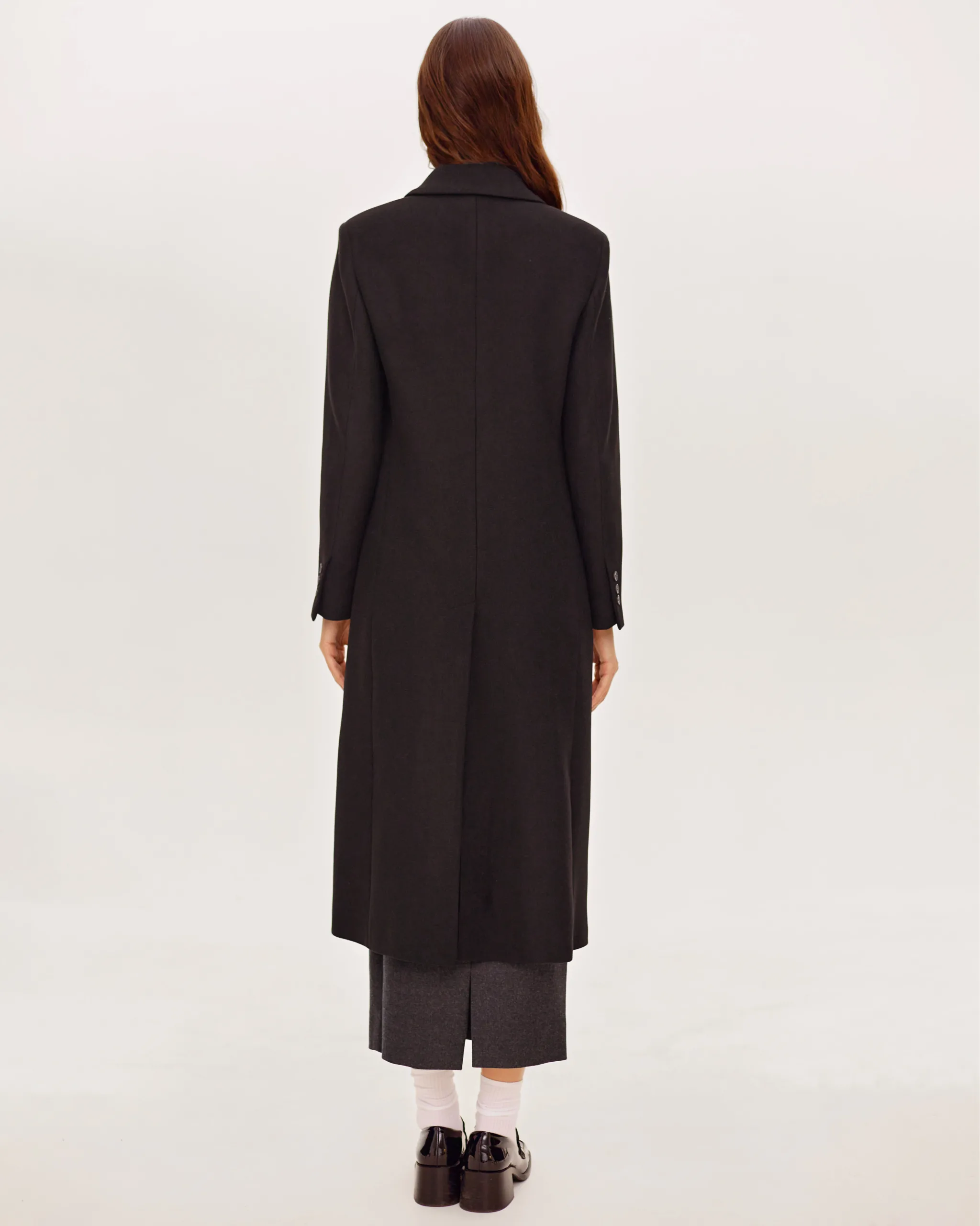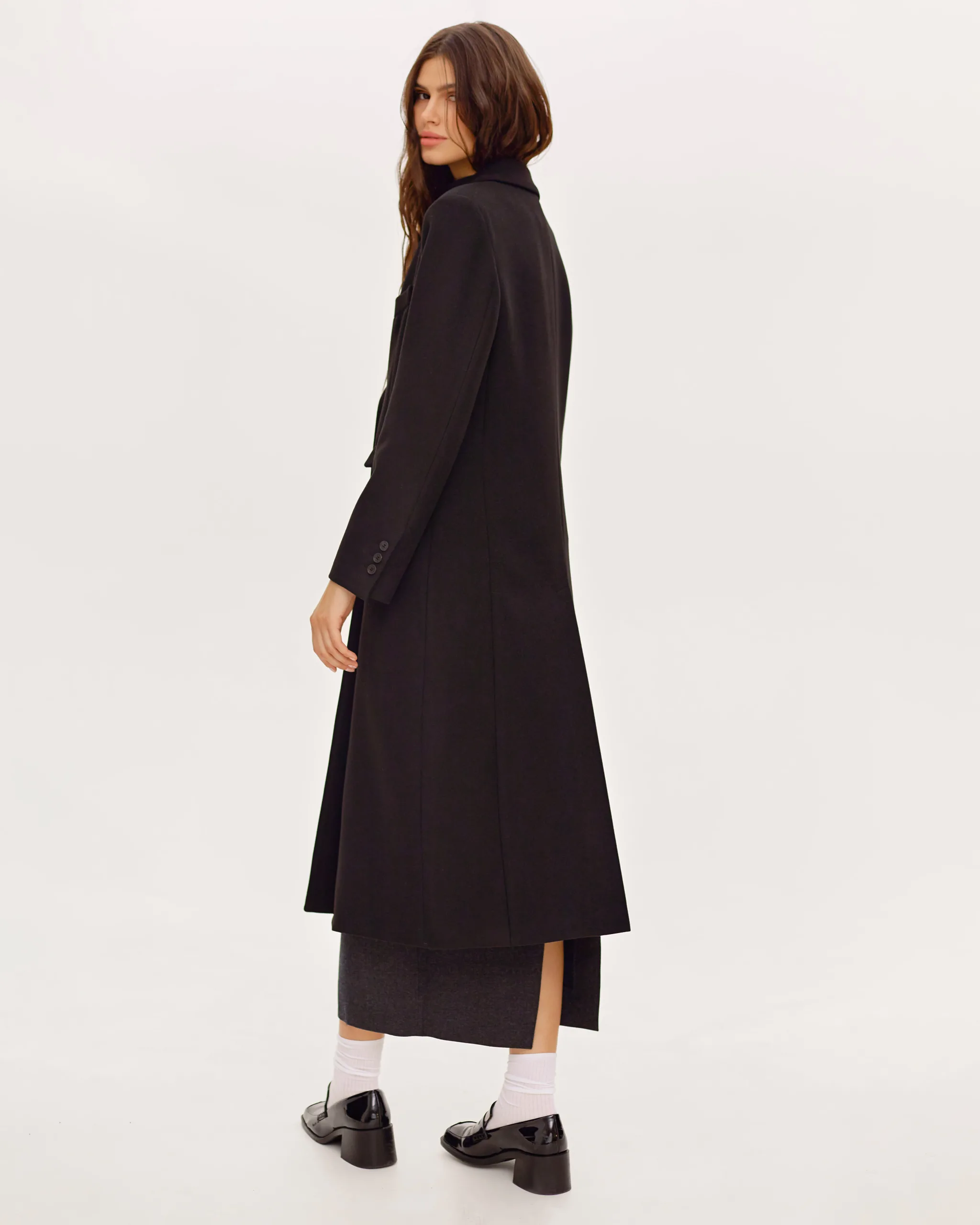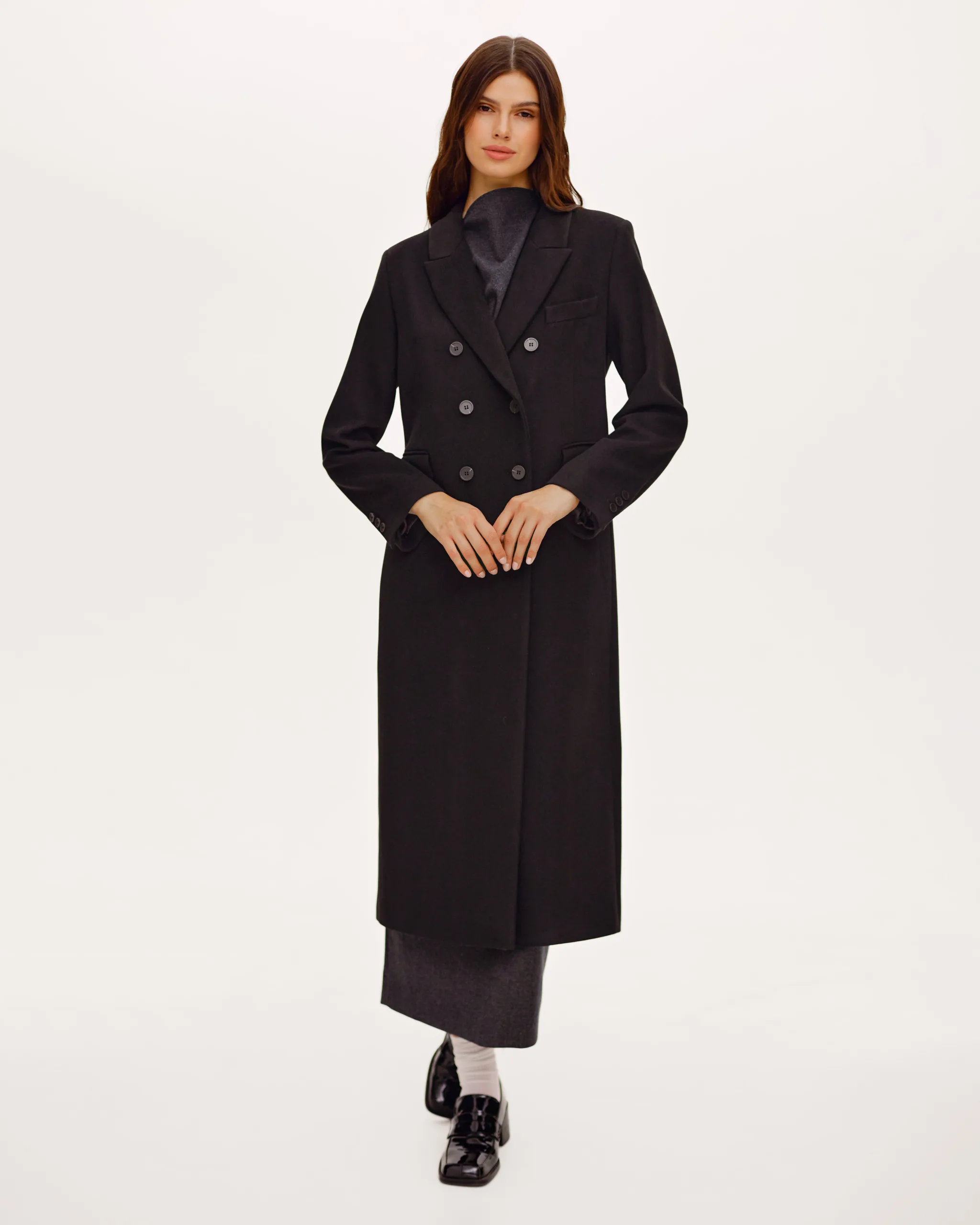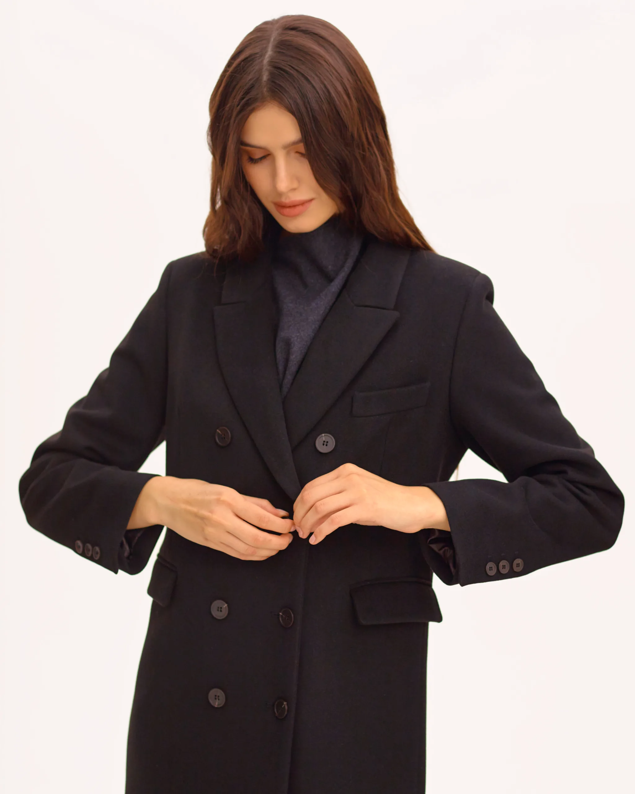 Пальто оверсайз у стилі мінімалізму, двобортне, максі довжини. Силует вільний, розслаблений. Комір з відлітною кокеткою спереду, який завдяки паті може трансформуватися в комір-стійку. Лінія плеча — спущена, рукава вшивні. Модель виконана у стриманому дизайні з чистими лініями, без зайвих деталей, що підкреслює сучасність та преміальність виробу.