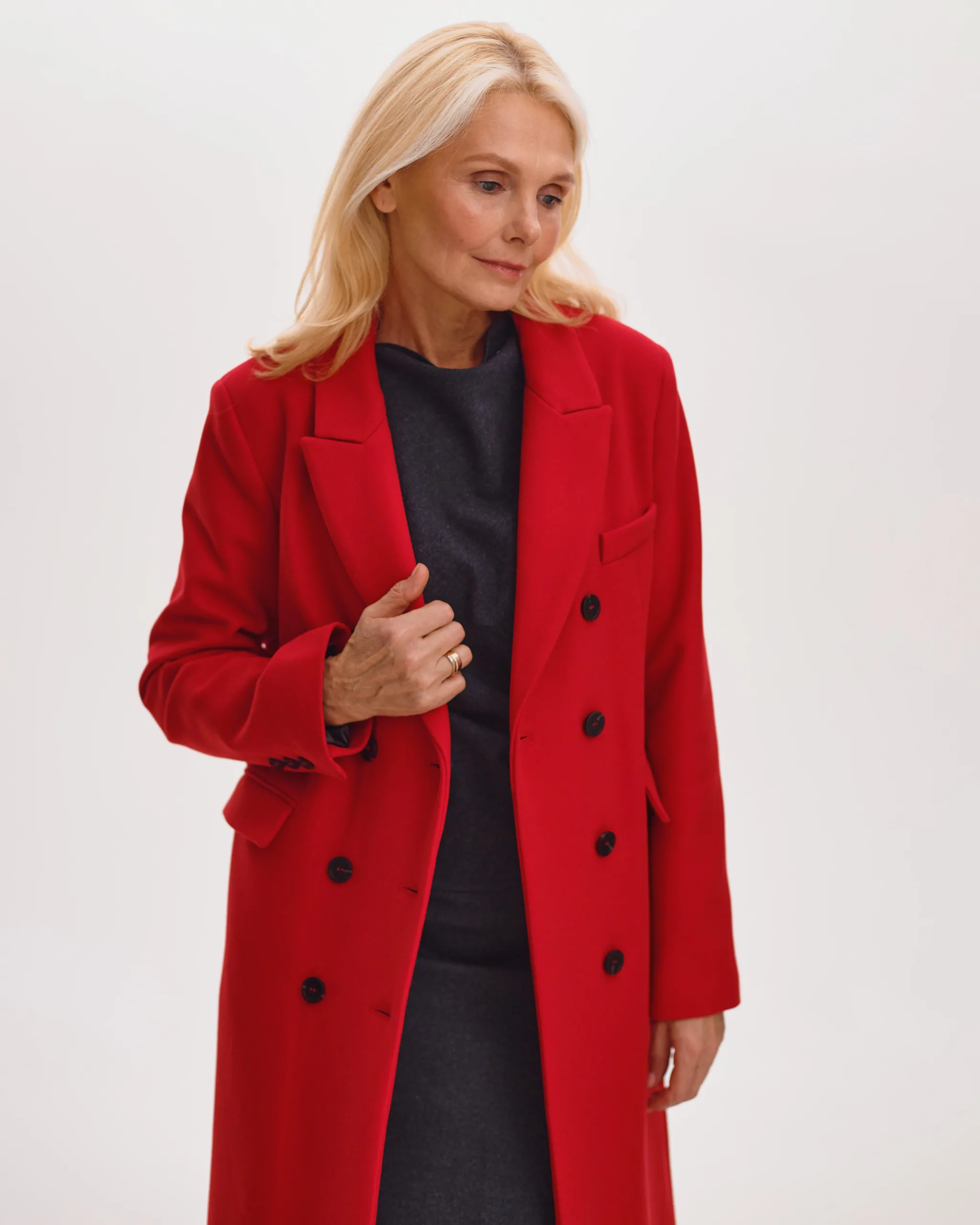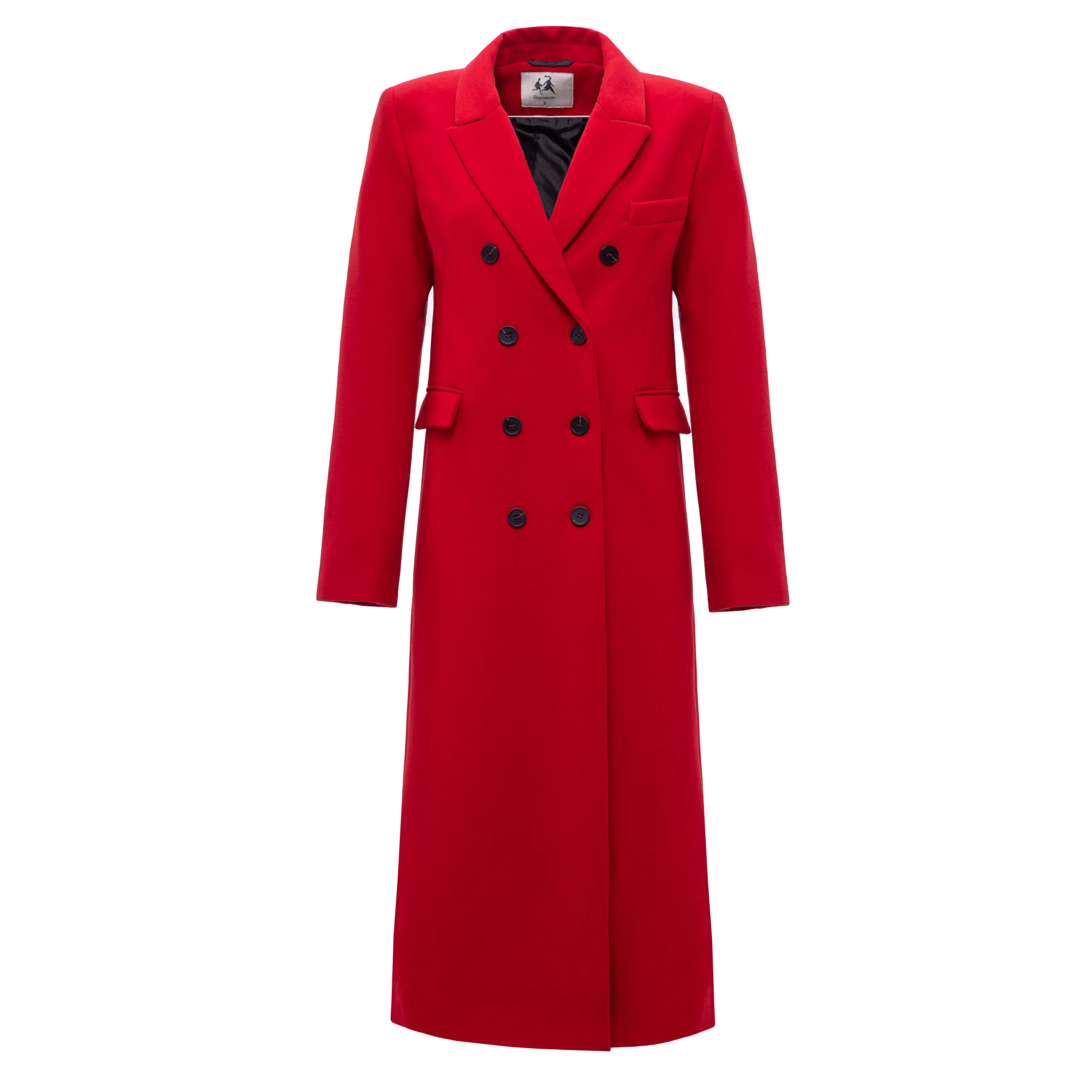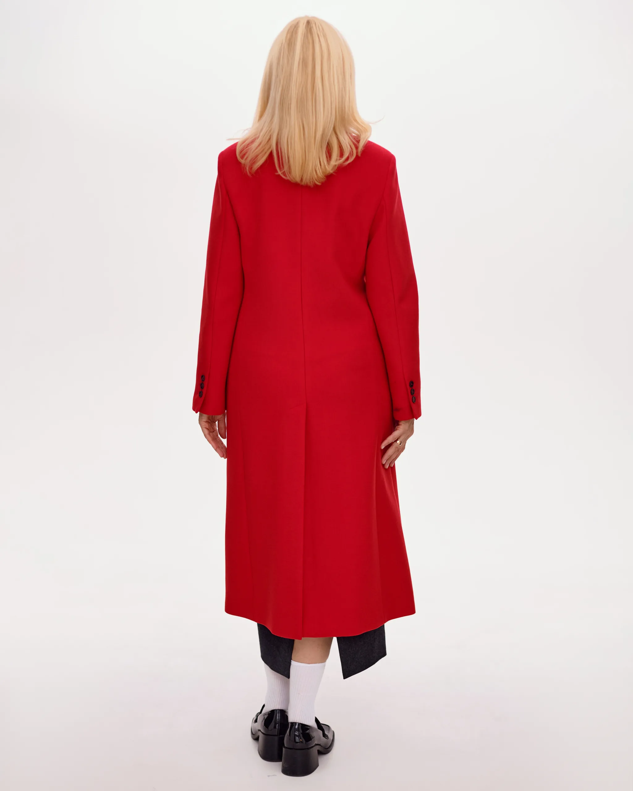 Двобортне пальто прямого силуету з застібкою на два гудзика, зі спущеною проймою та втачними рукавами. Комір відкладний з бортами, кишені прорізні з лісточкою. По спинці середній шов з шліцею.