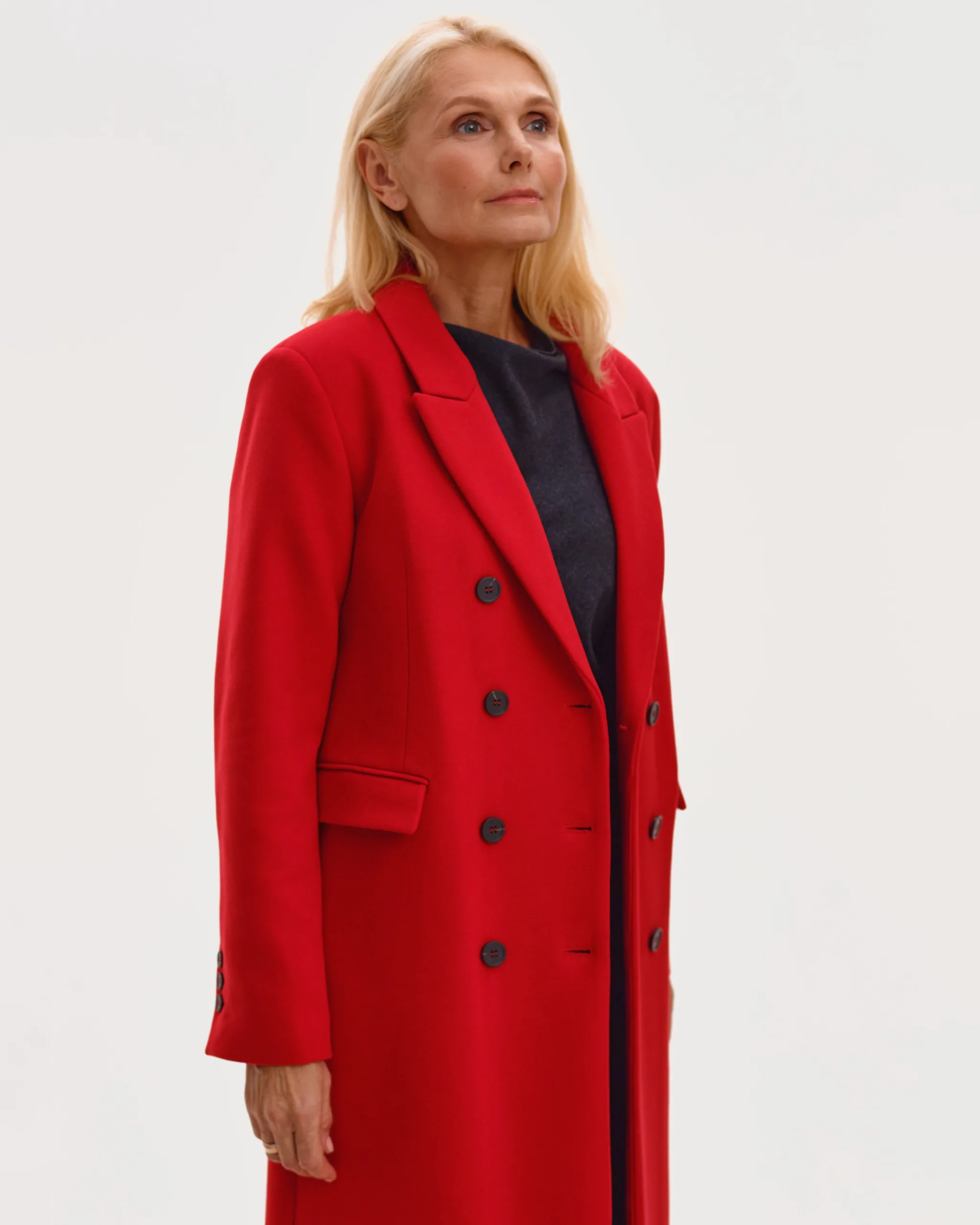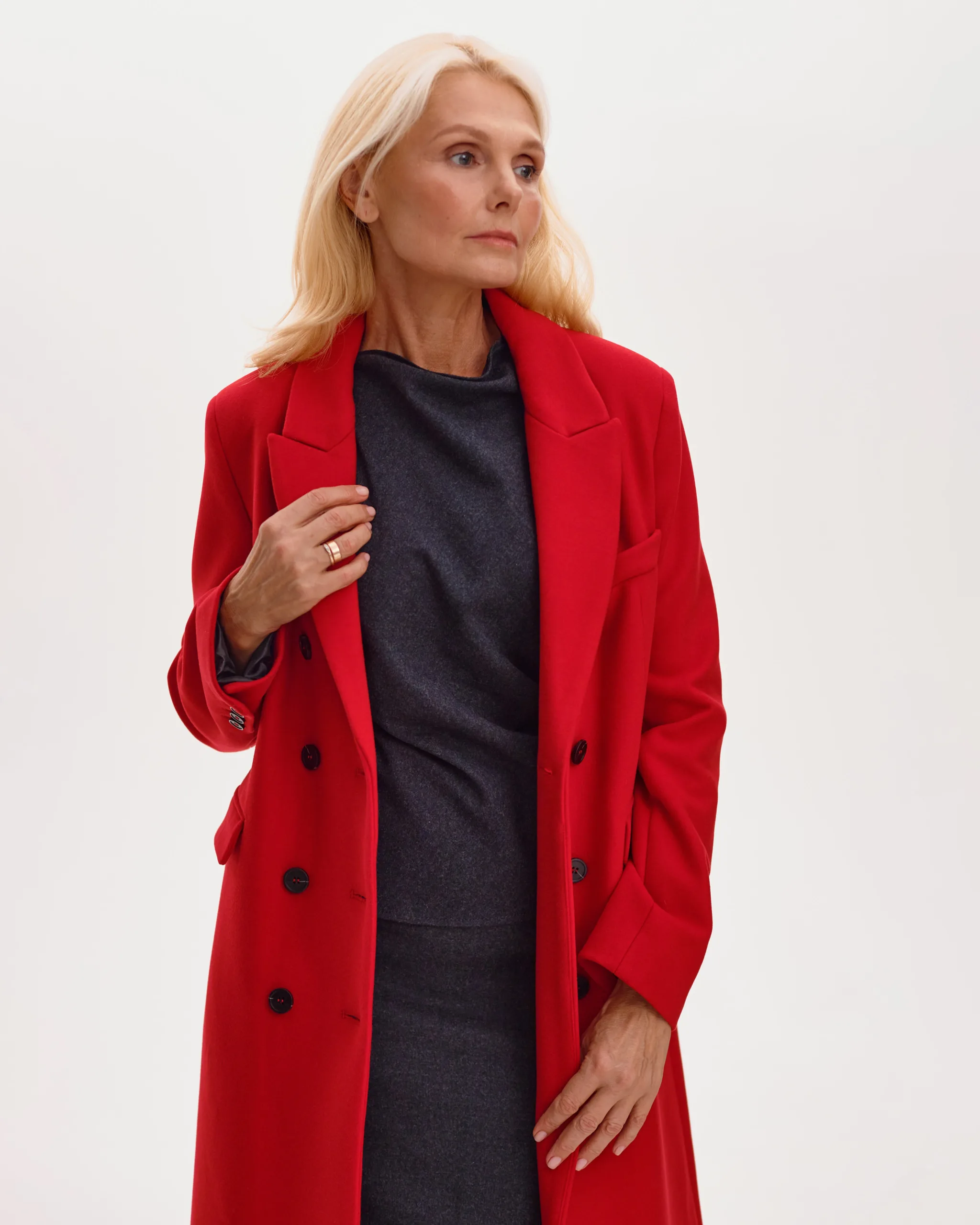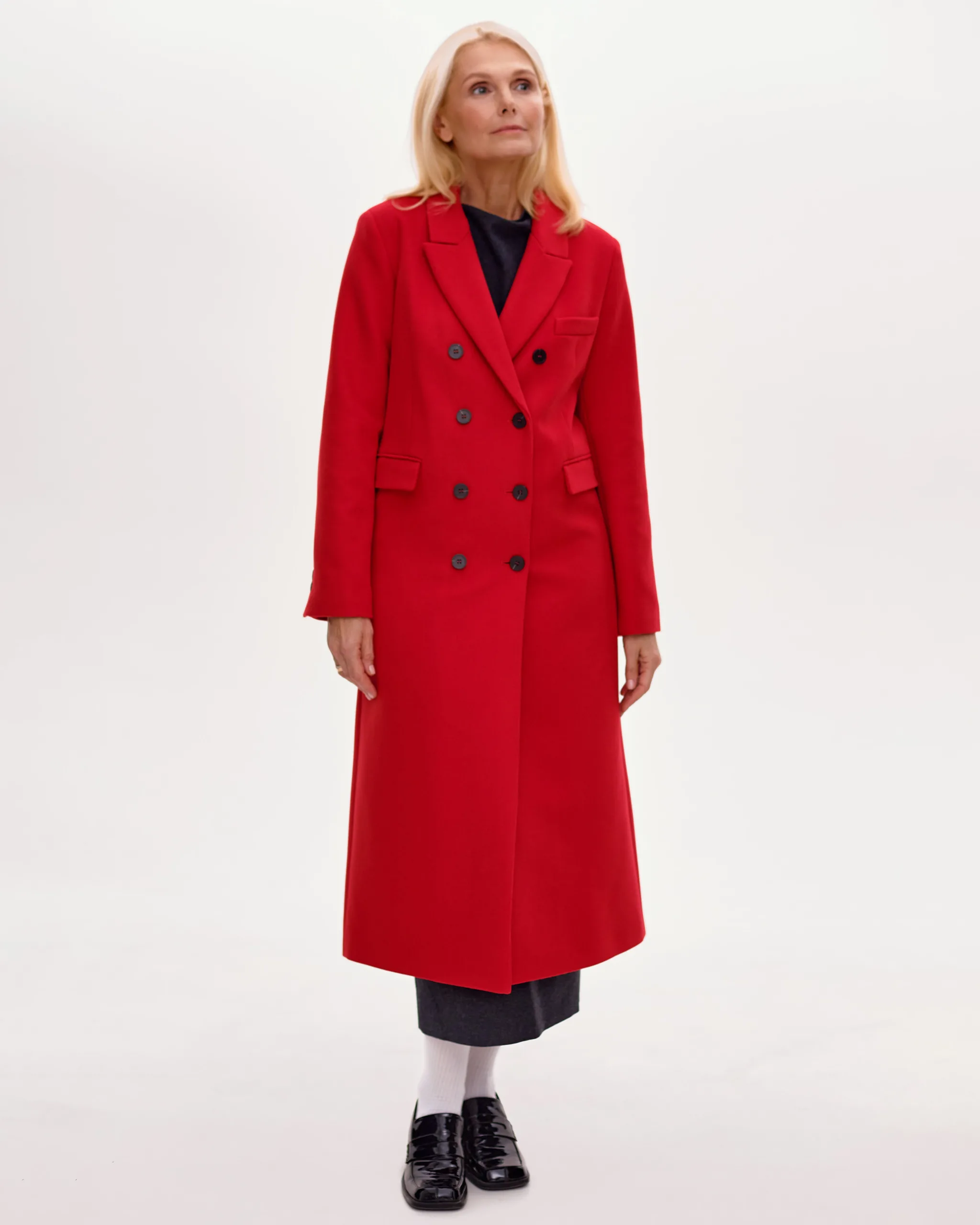Пальто оверсайз у стилі мінімалізму, двобортне, максі довжини. Силует вільний, розслаблений. Комір з відлітною кокеткою спереду, який завдяки паті може трансформуватися в комір-стійку. Лінія плеча — спущена, рукава вшивні. Модель виконана у стриманому дизайні з чистими лініями, без зайвих деталей, що підкреслює сучасність та преміальність виробу.