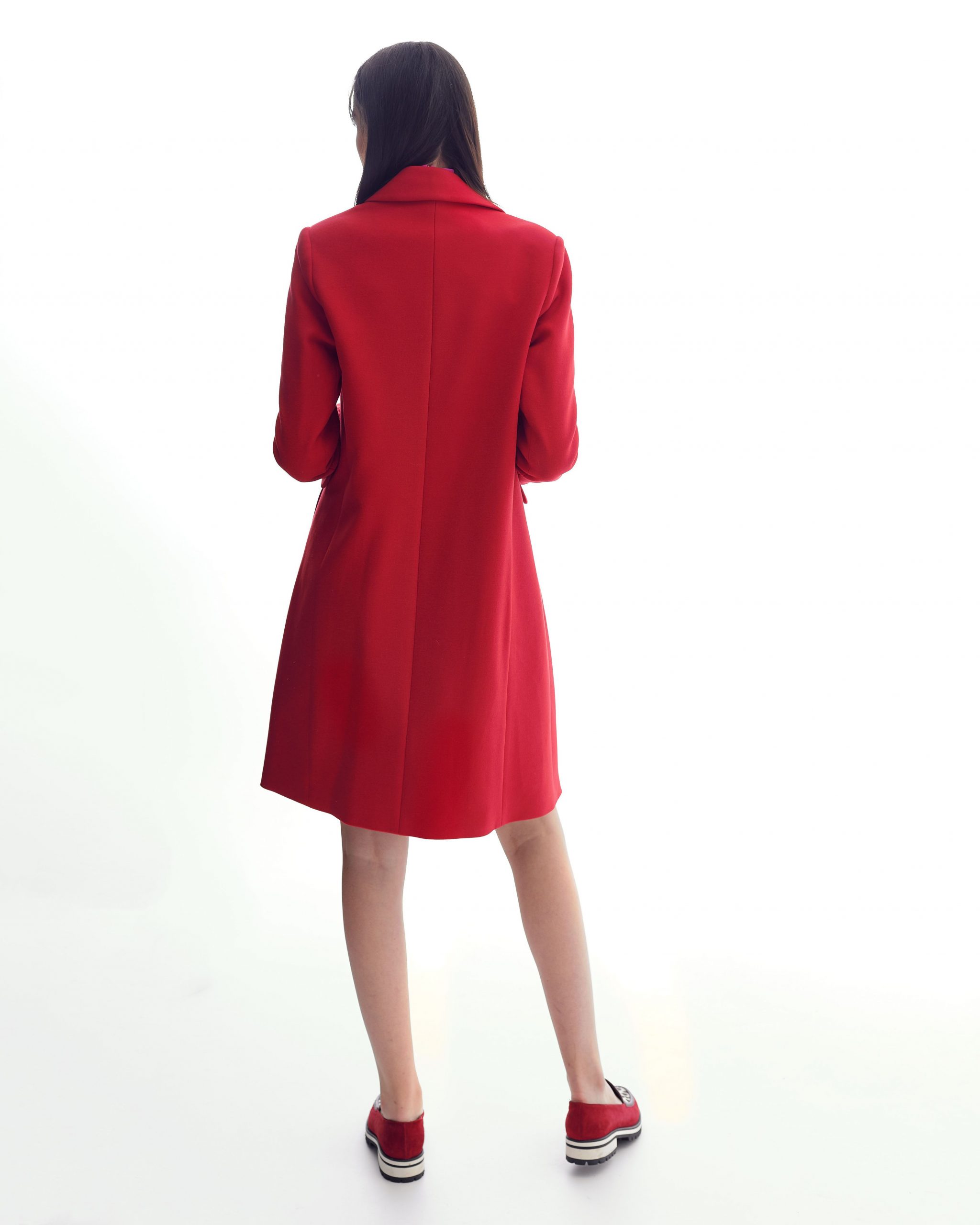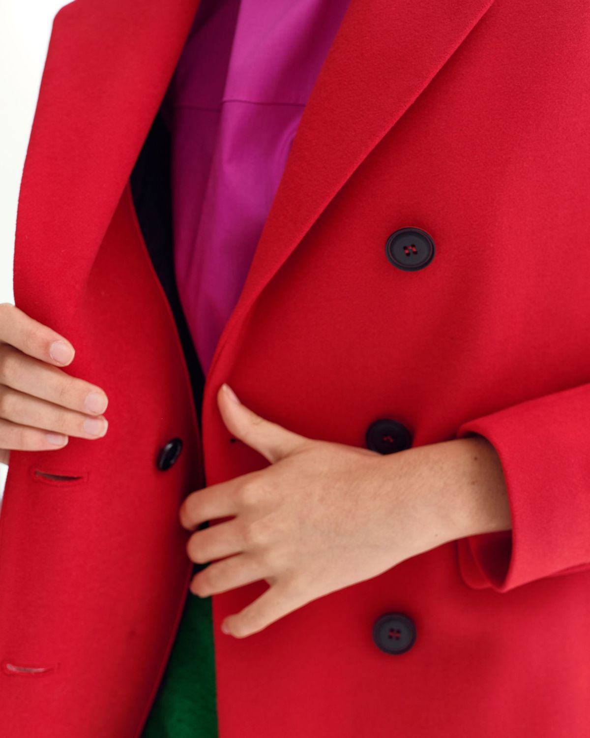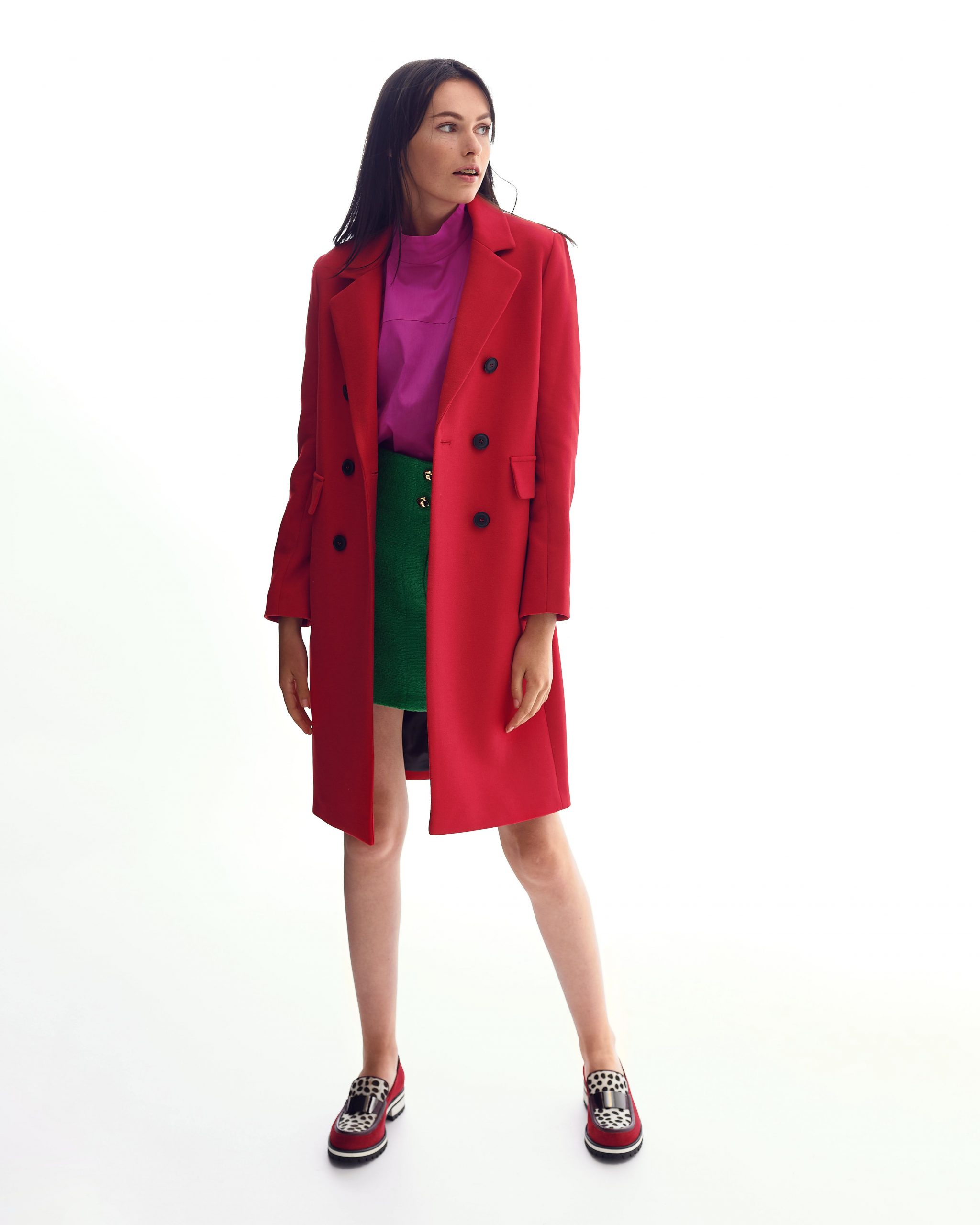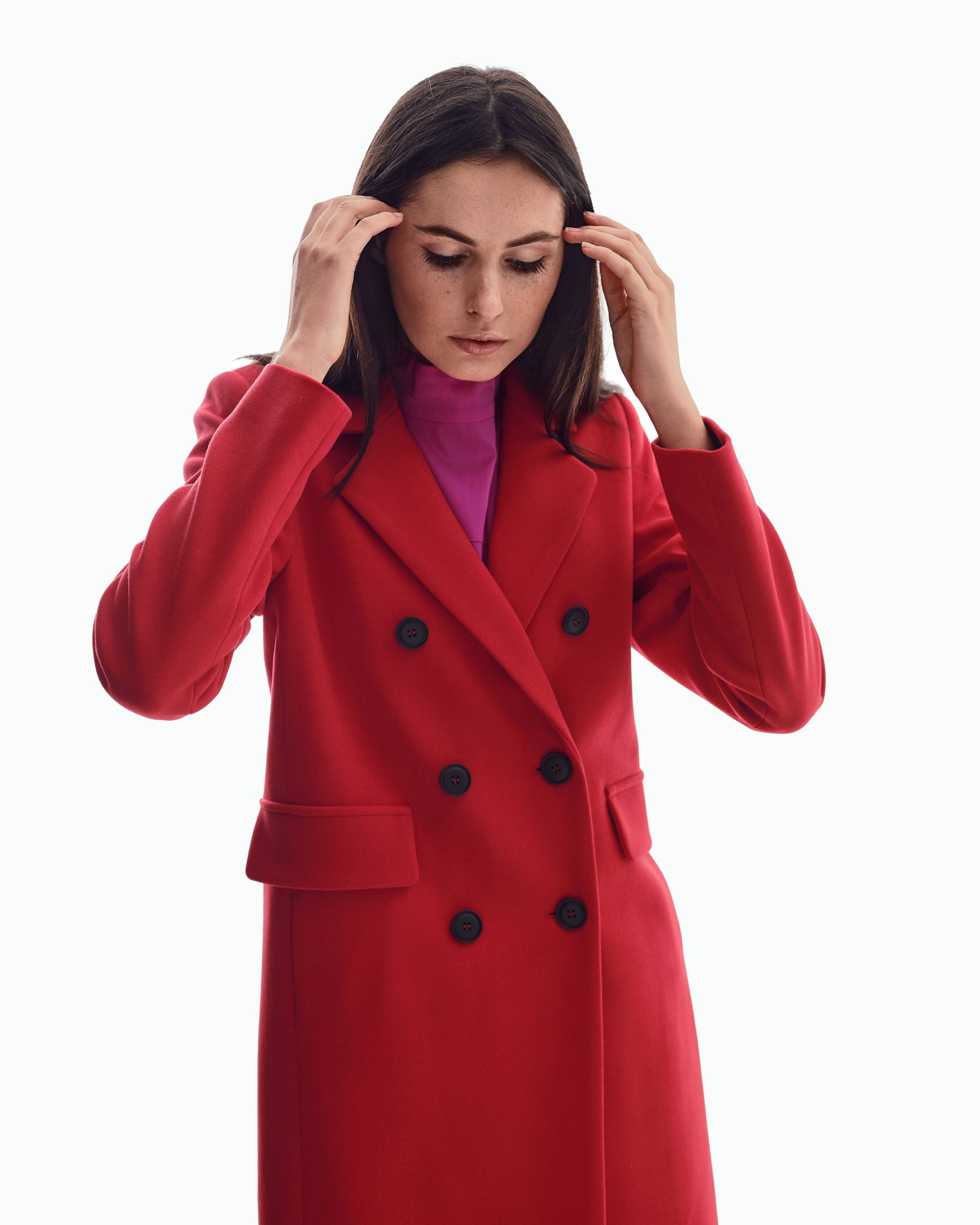 Двобортне пальто напівприлеглого силуету з застібкою на шість ґудзиків.