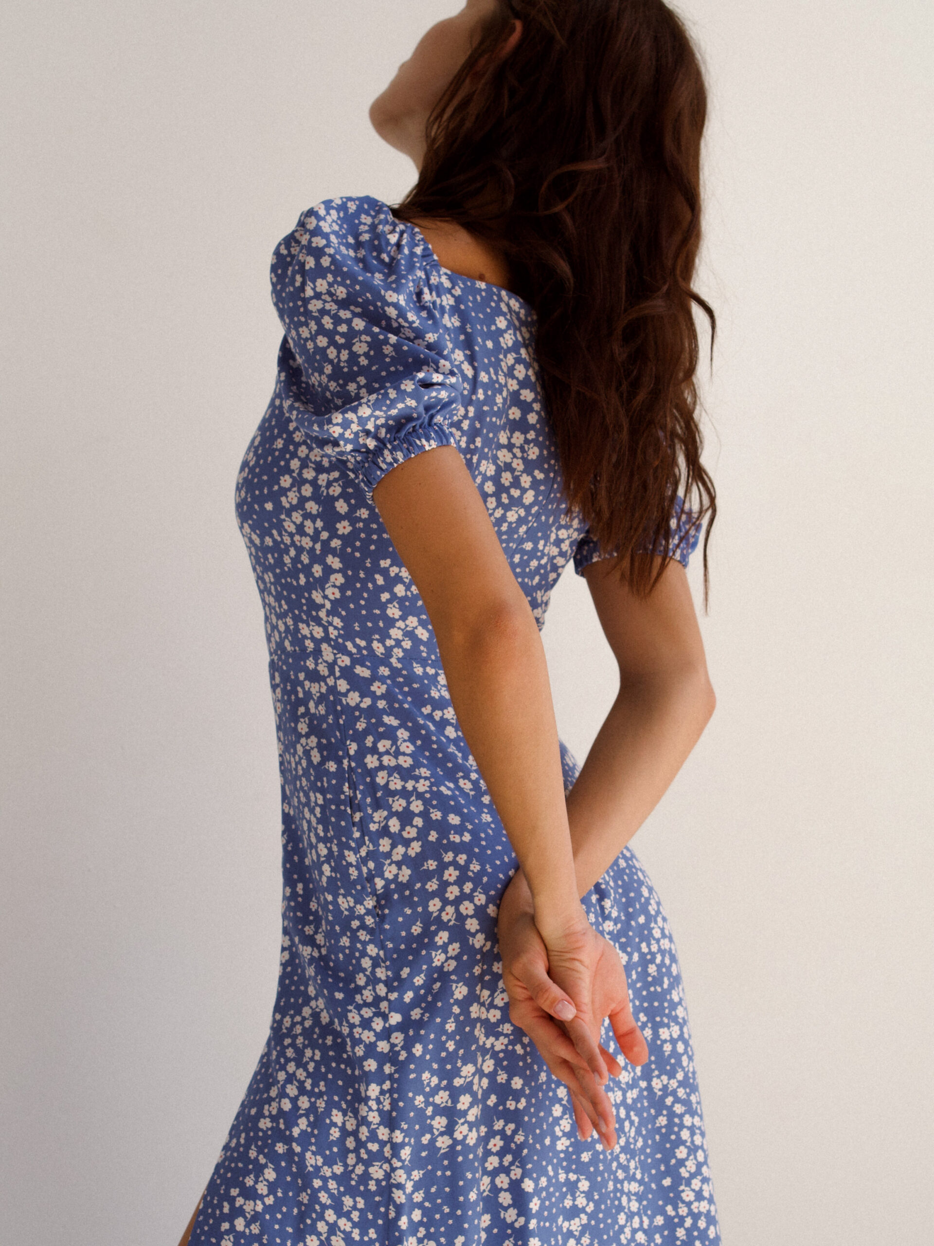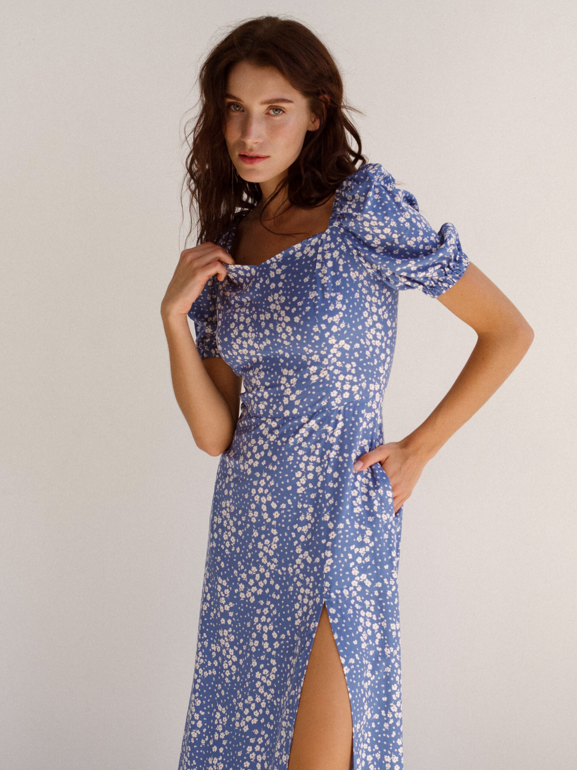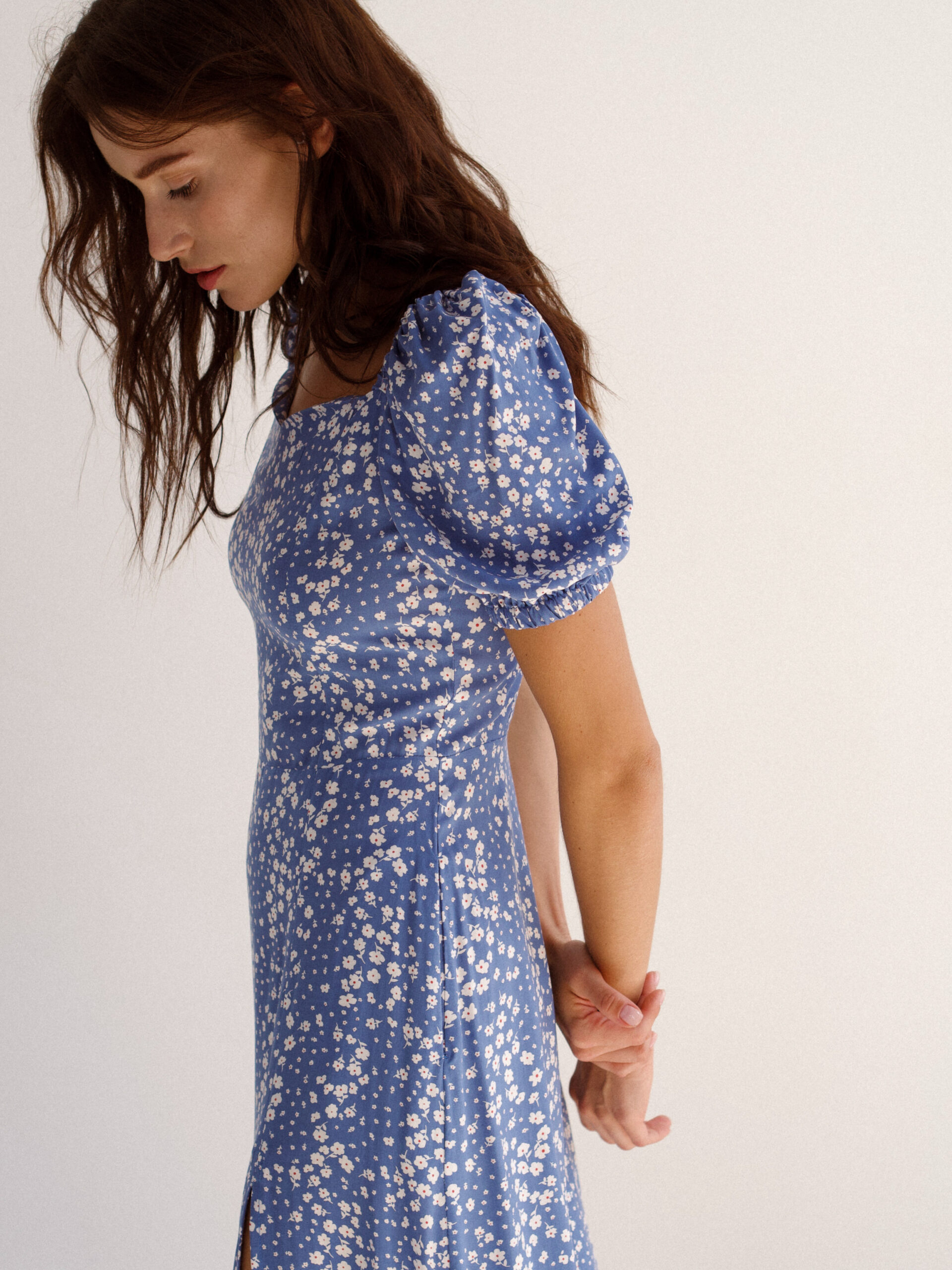 Сукня у стилі бохо, відрізна вище лінії талії. Нижча частина призібрана. У бічних швах кишені. Рукав 7/8, злегка прикриває лікоть. По центру горловини розріз.