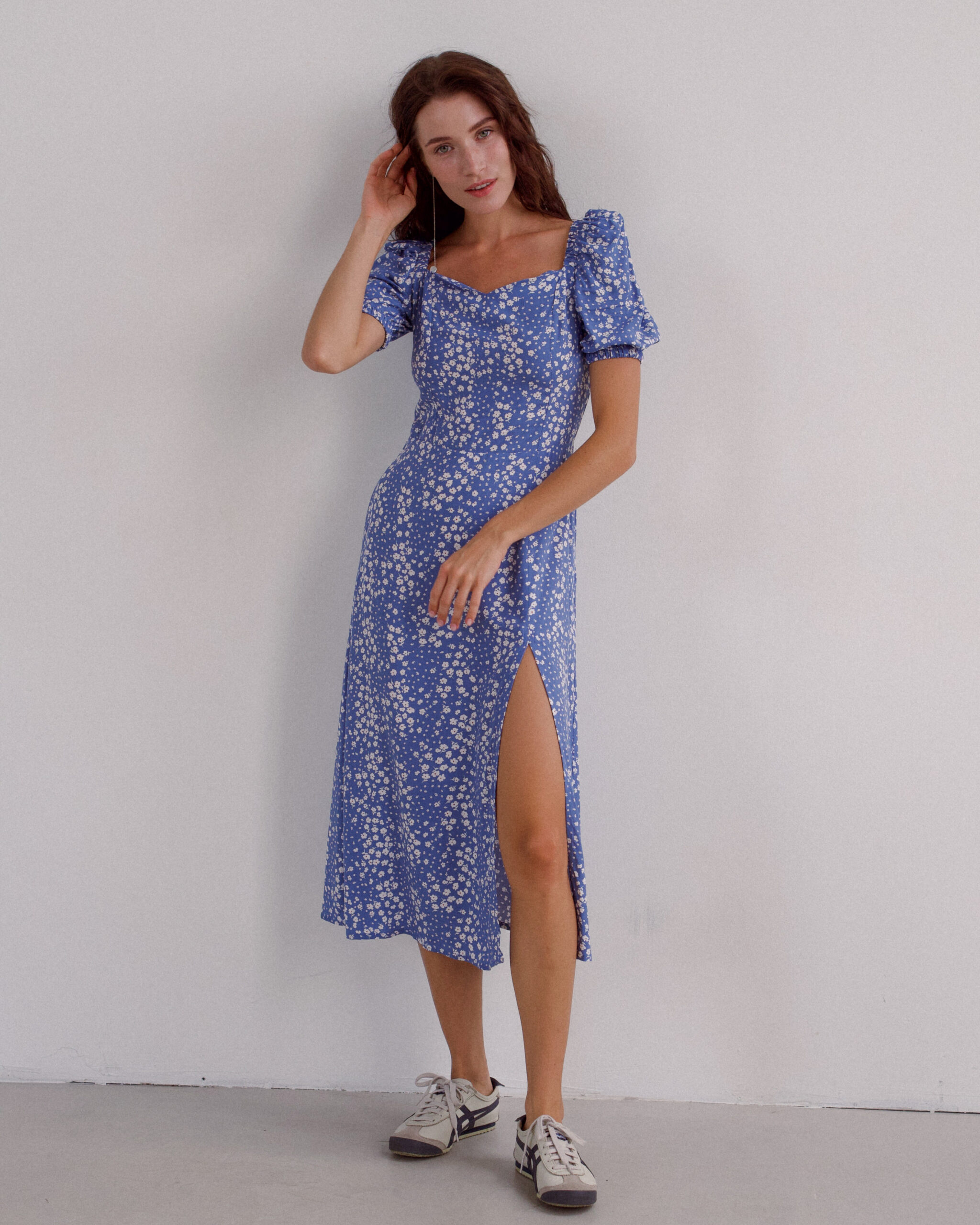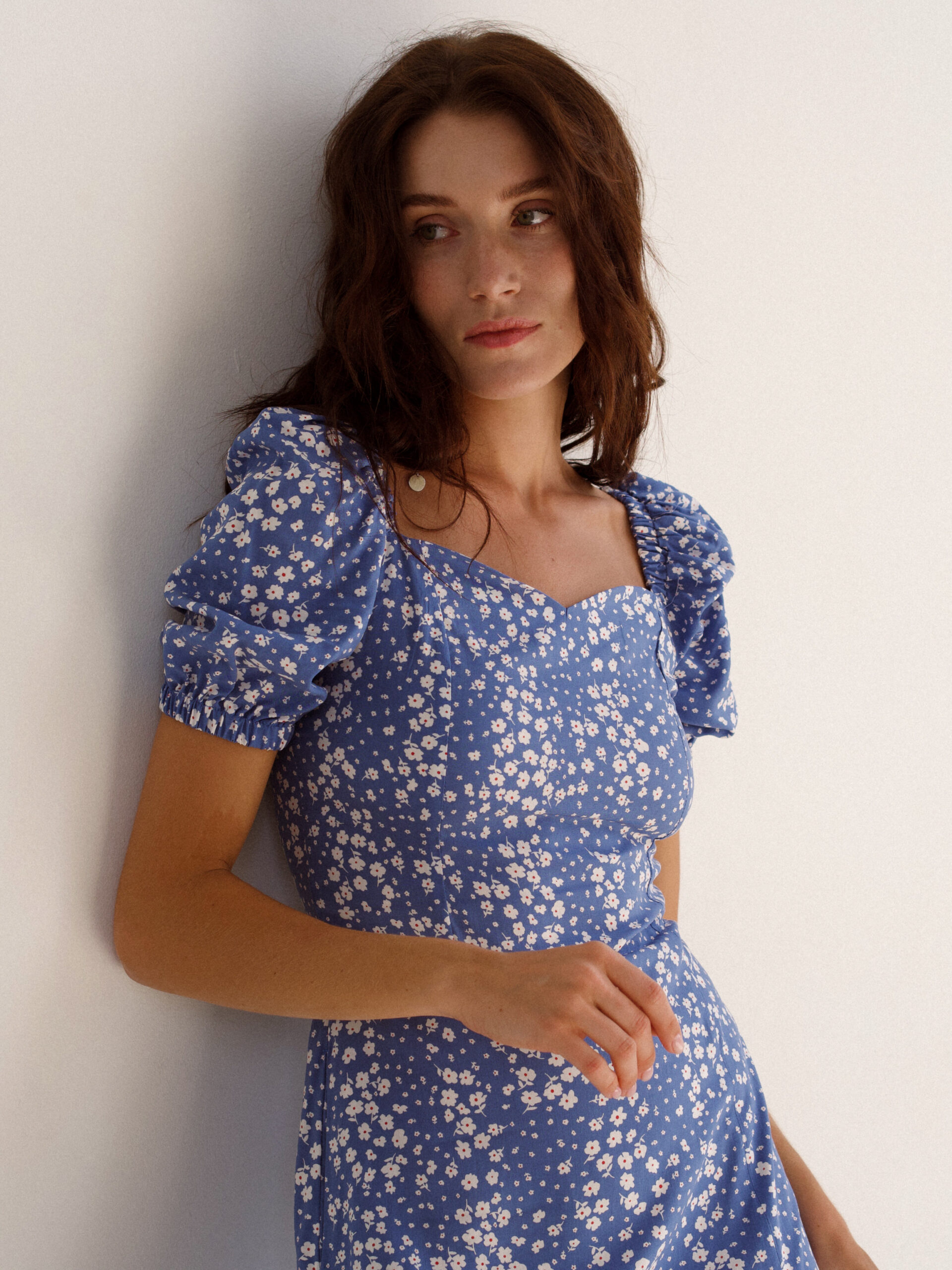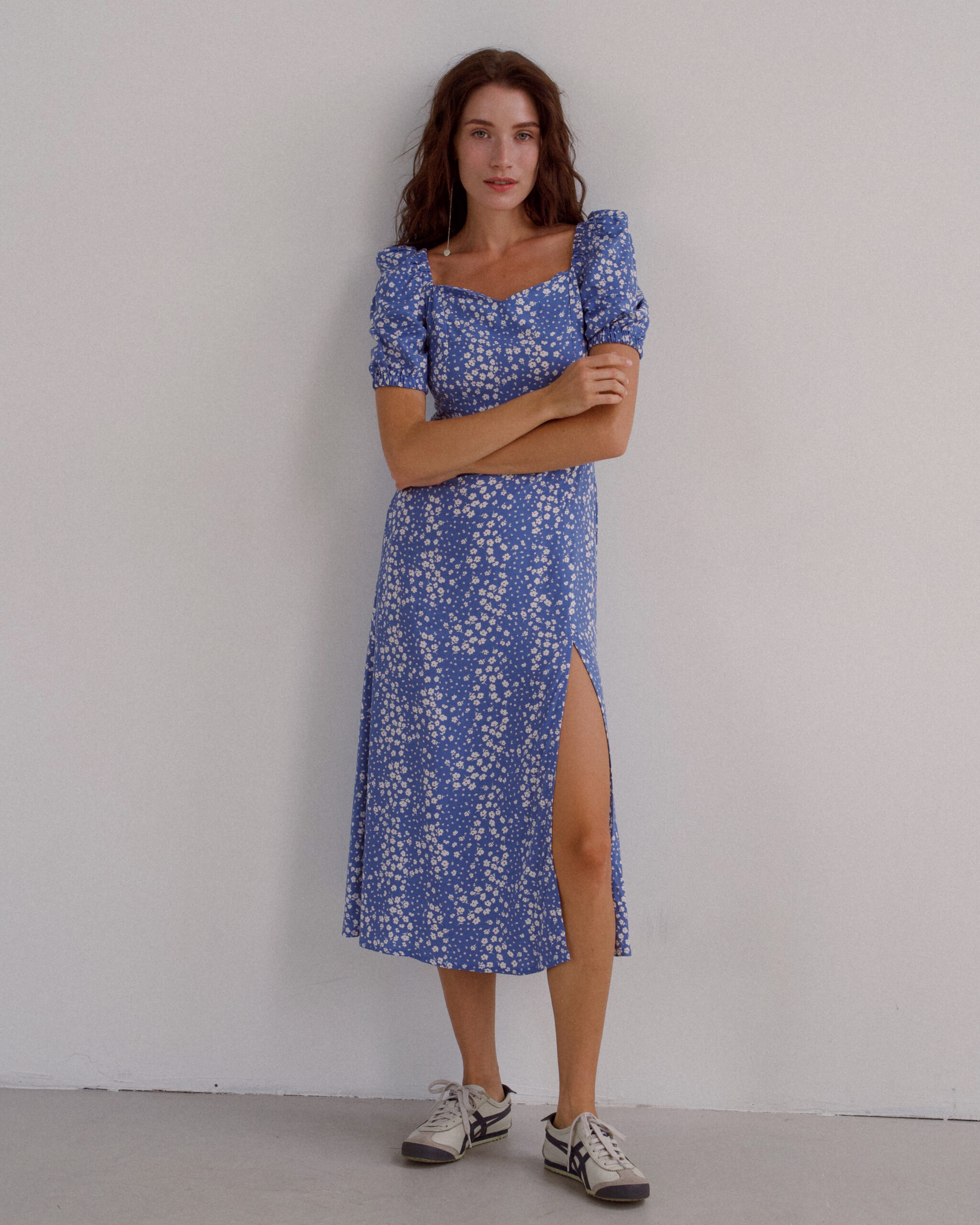 Сукня у стилі бохо, відрізна вище лінії талії. Нижча частина призібрана. У бічних швах кишені. Рукав 7/8, злегка прикриває лікоть. По центру горловини розріз.