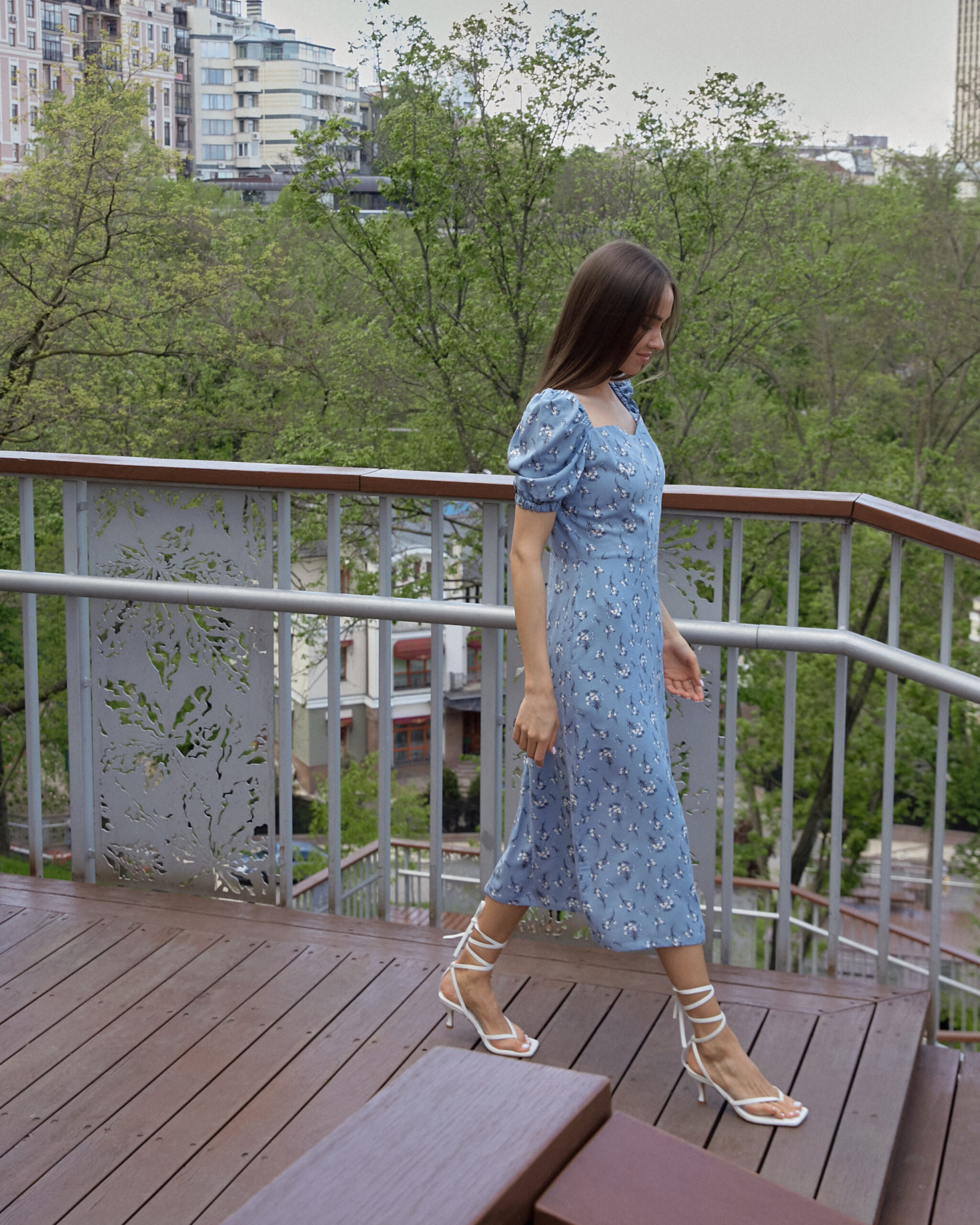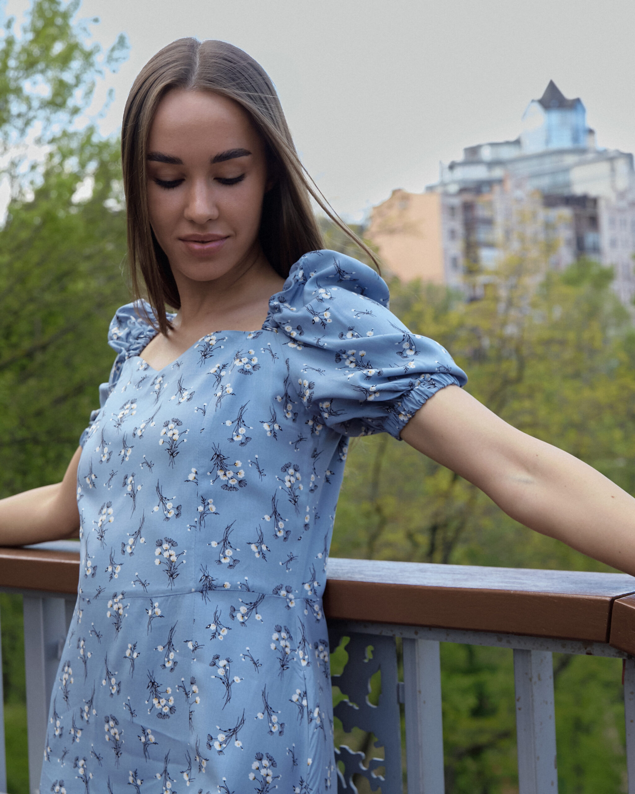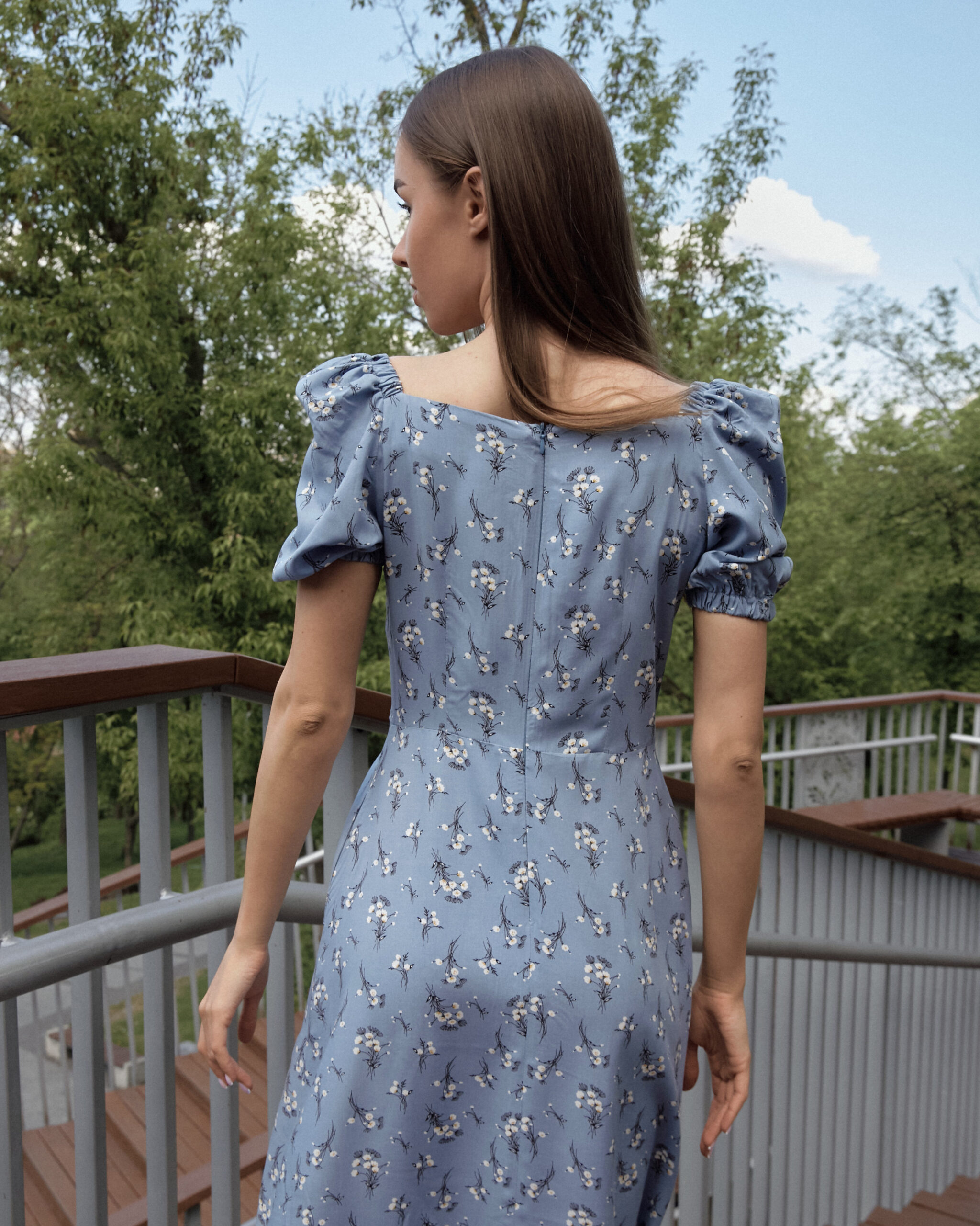 Сукня у стилі бохо, відрізна вище лінії талії. Нижча частина призібрана. У бічних швах кишені. Рукав 7/8, злегка прикриває лікоть. По центру горловини розріз.