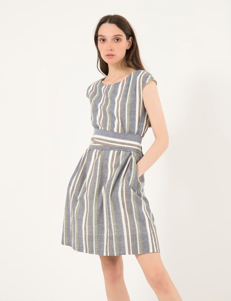 Free silhouette dress with sewn-in flared sleeves, rounded neck