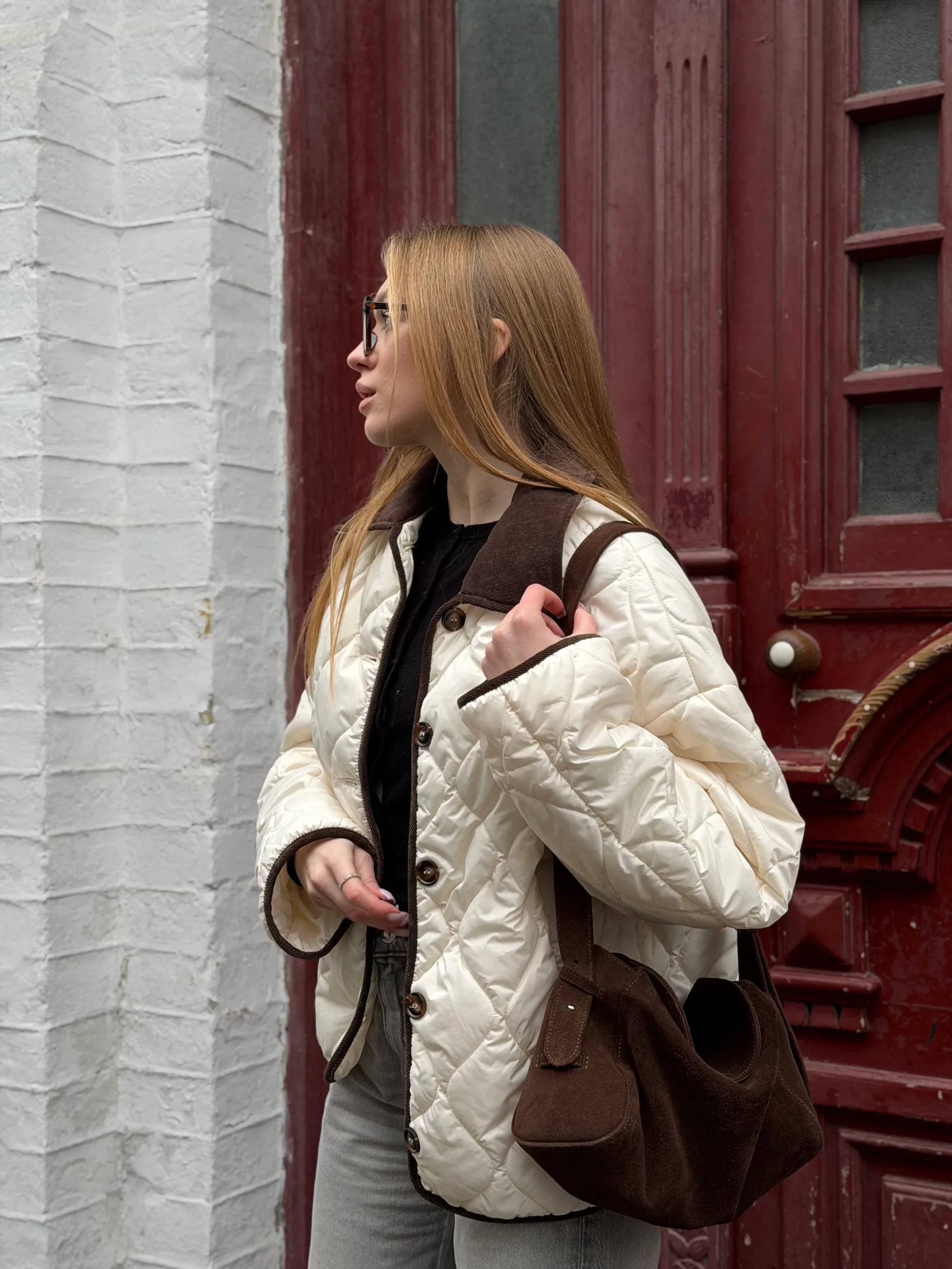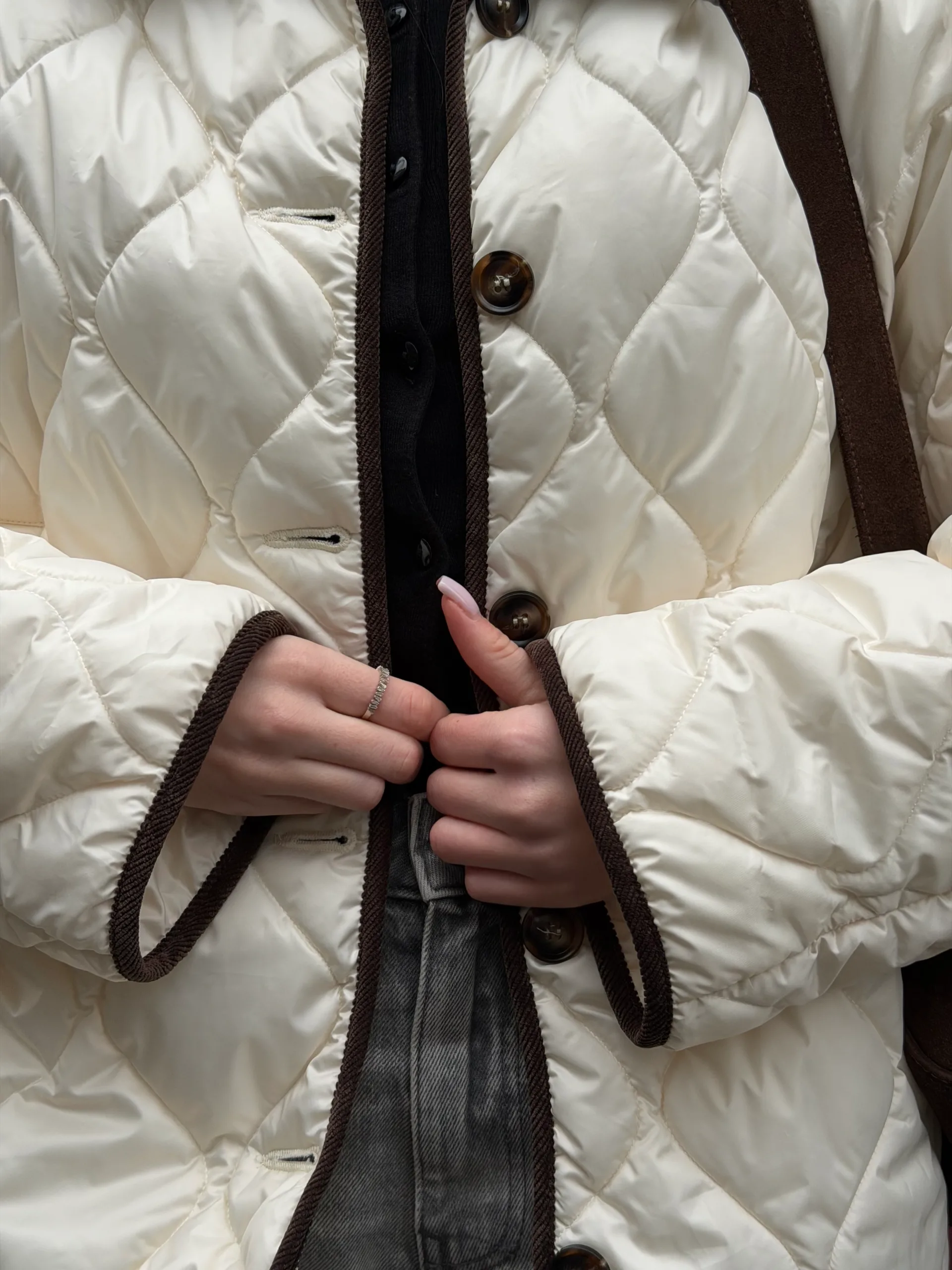 Чудове, довге, лаконічне стьобане пальто прямого крою під пояс з застібкою на потайних кнопках.