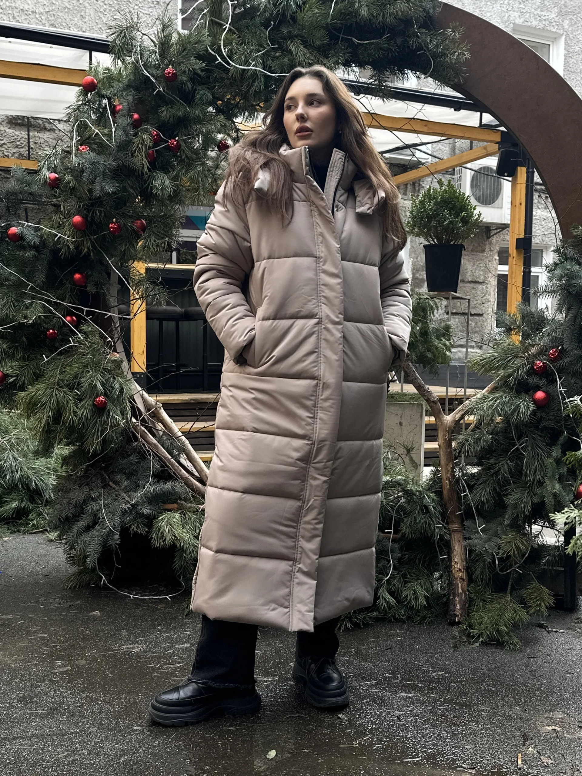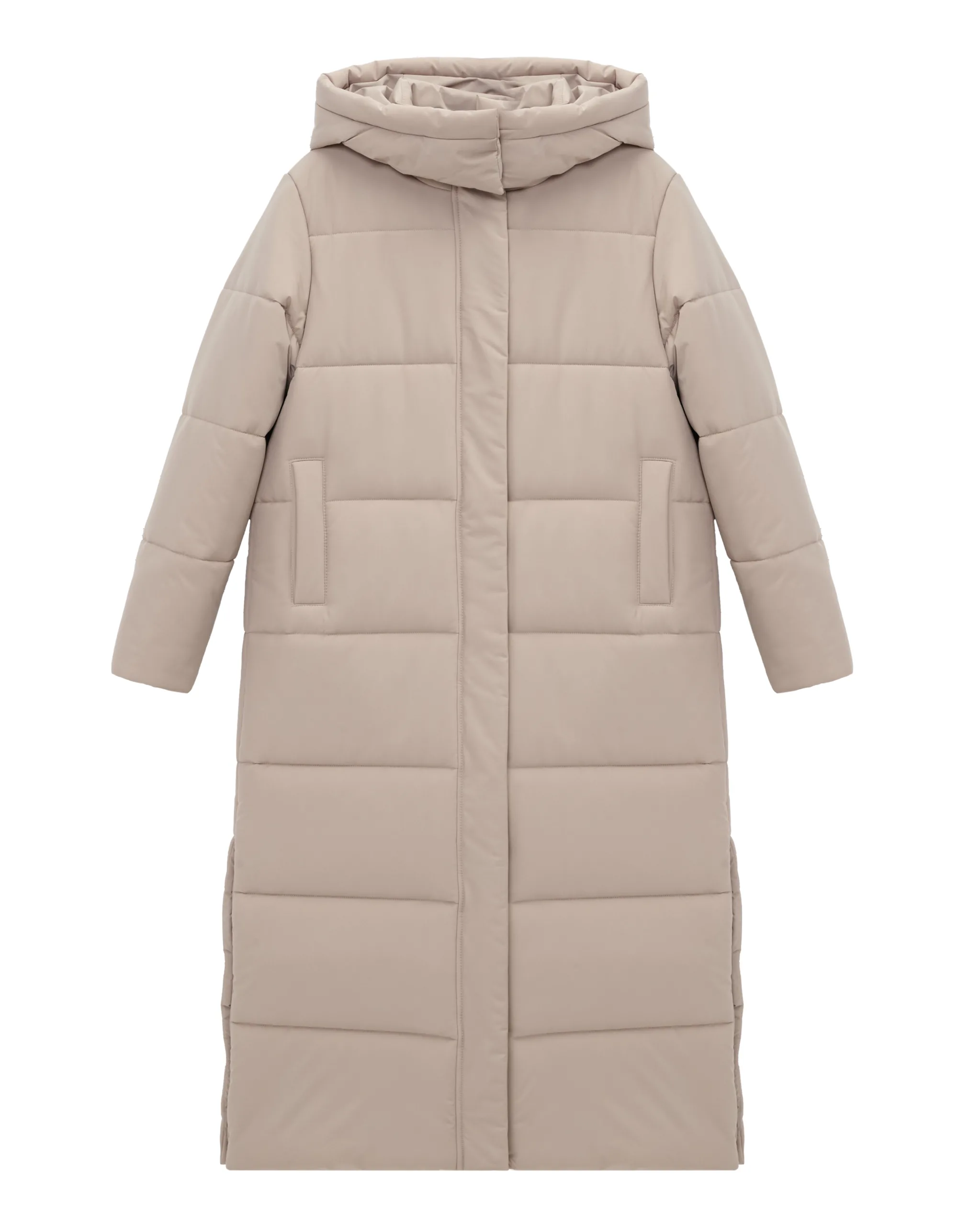 Чудове, довге, лаконічне стьобане пальто прямого крою під пояс з застібкою на потайних кнопках.