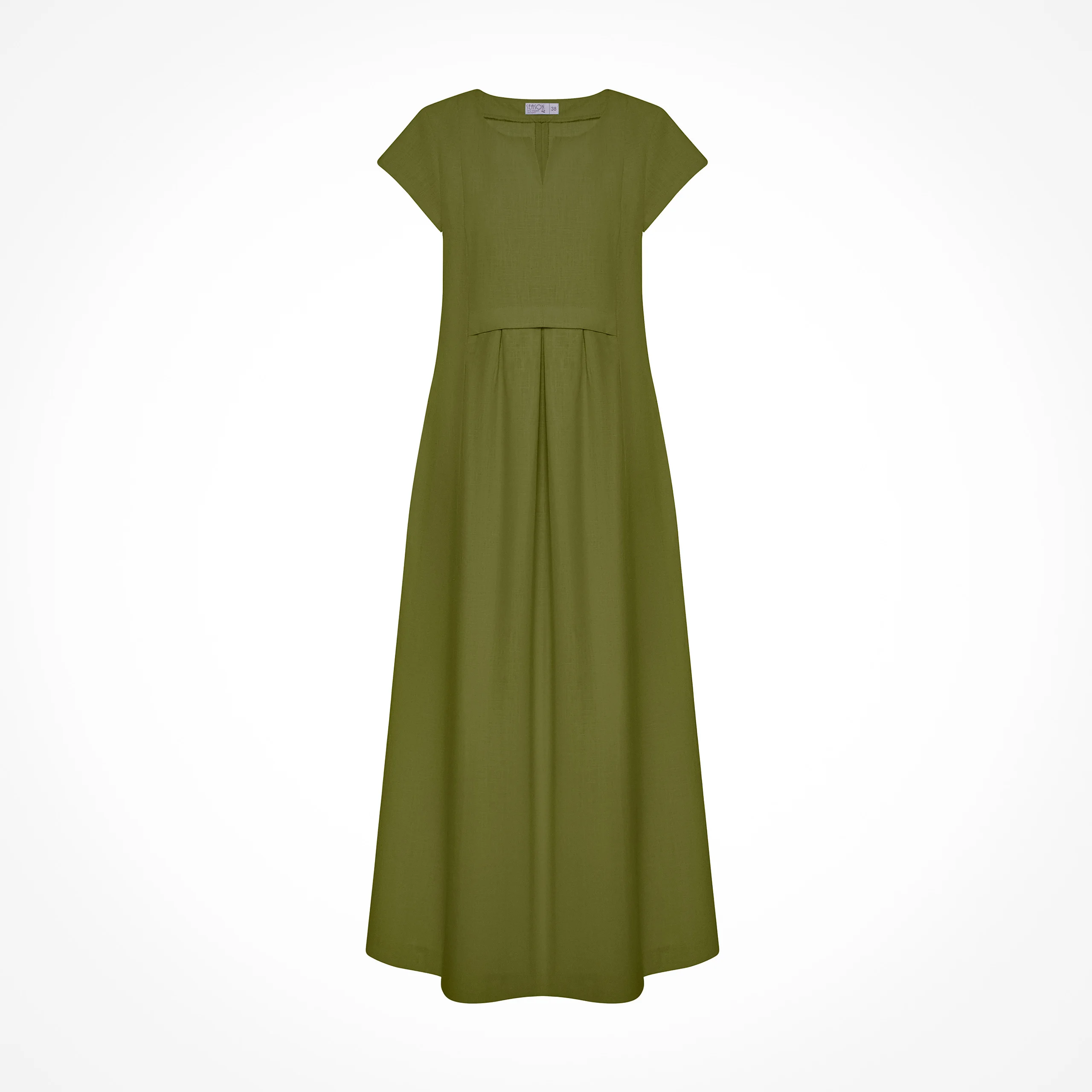 Сукня максі напівприлеглого силуету з вертикальними рельєфами по полочці та спинці. З округлою горловиною з розрізом спереду, короткими рукавами та двома розрізами в рельєфах знизу.