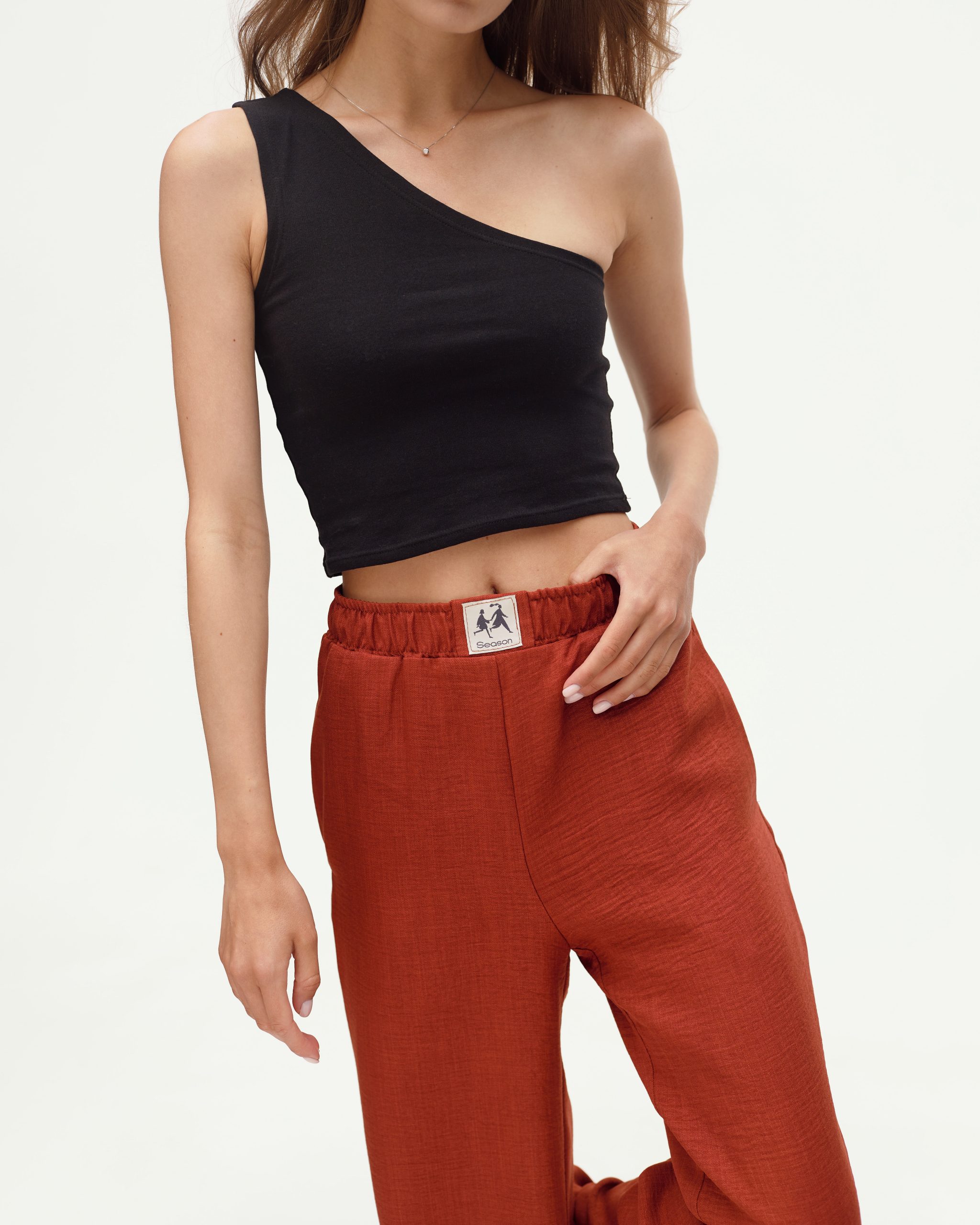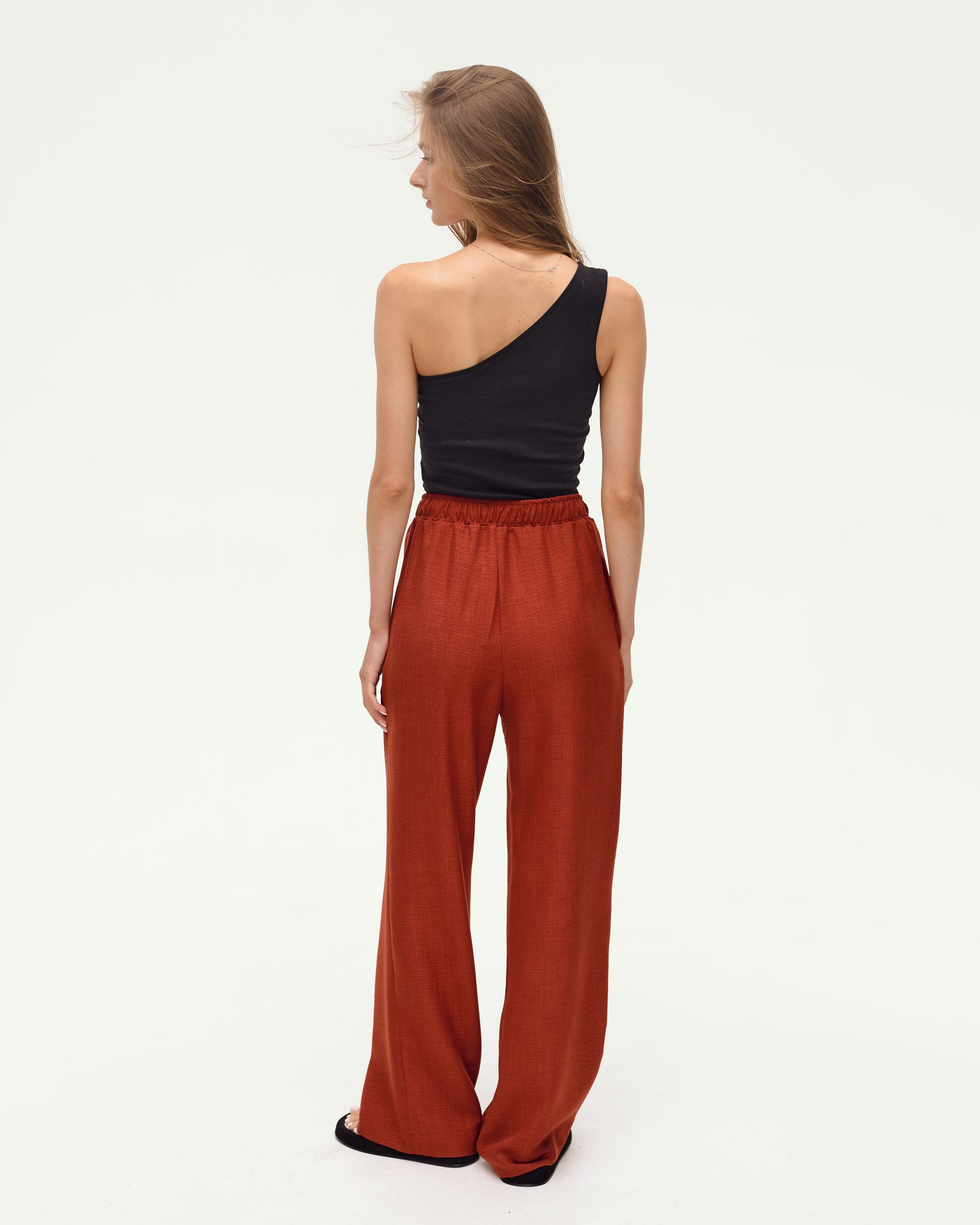 Штани вільного крою з поясом на еластичній стрічці, з кишенями.