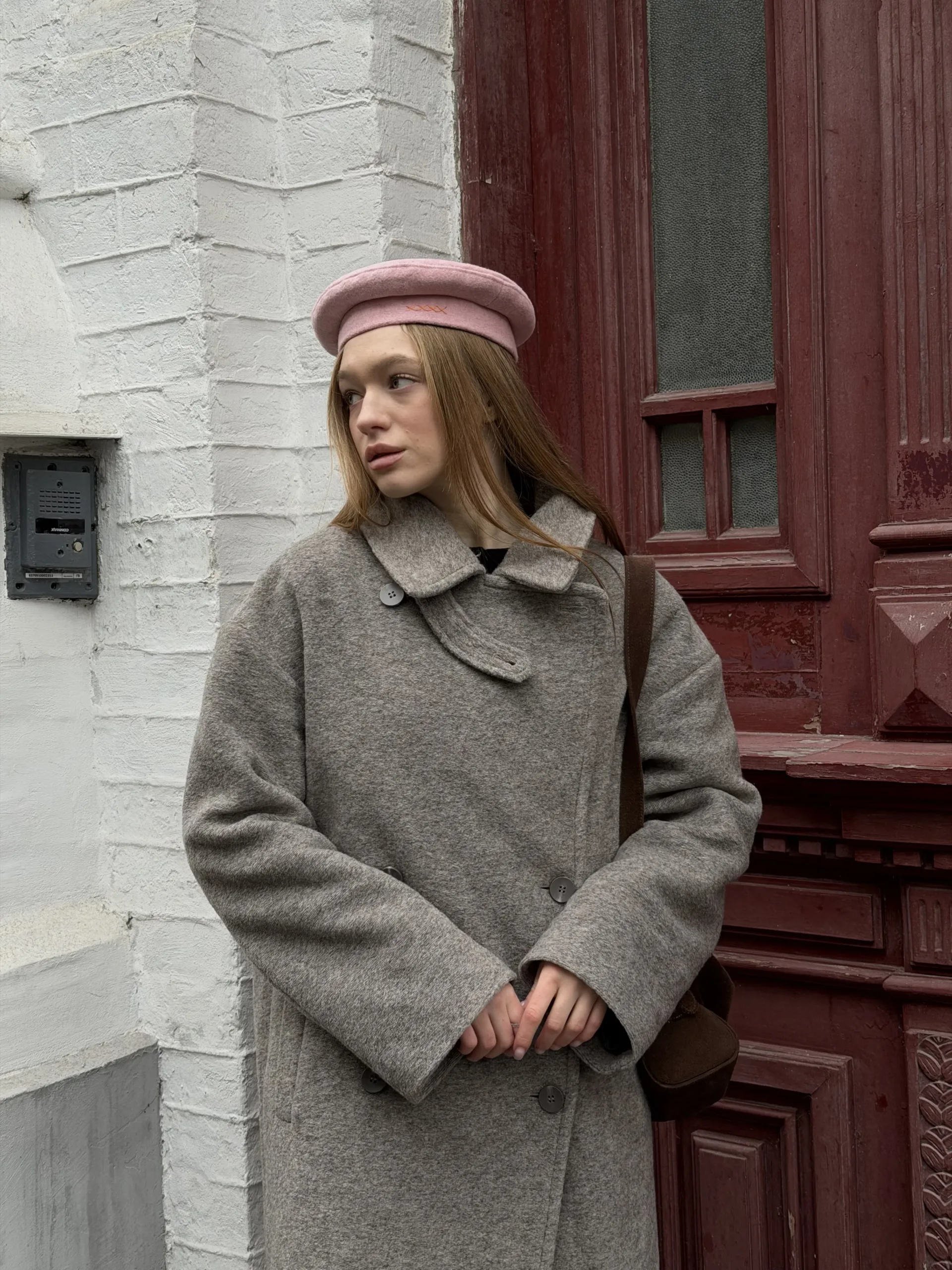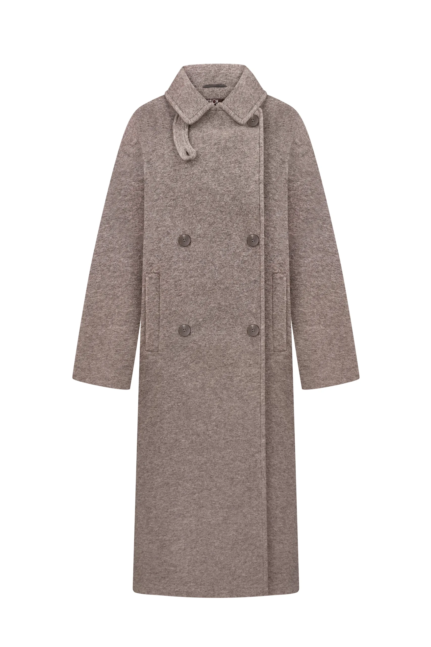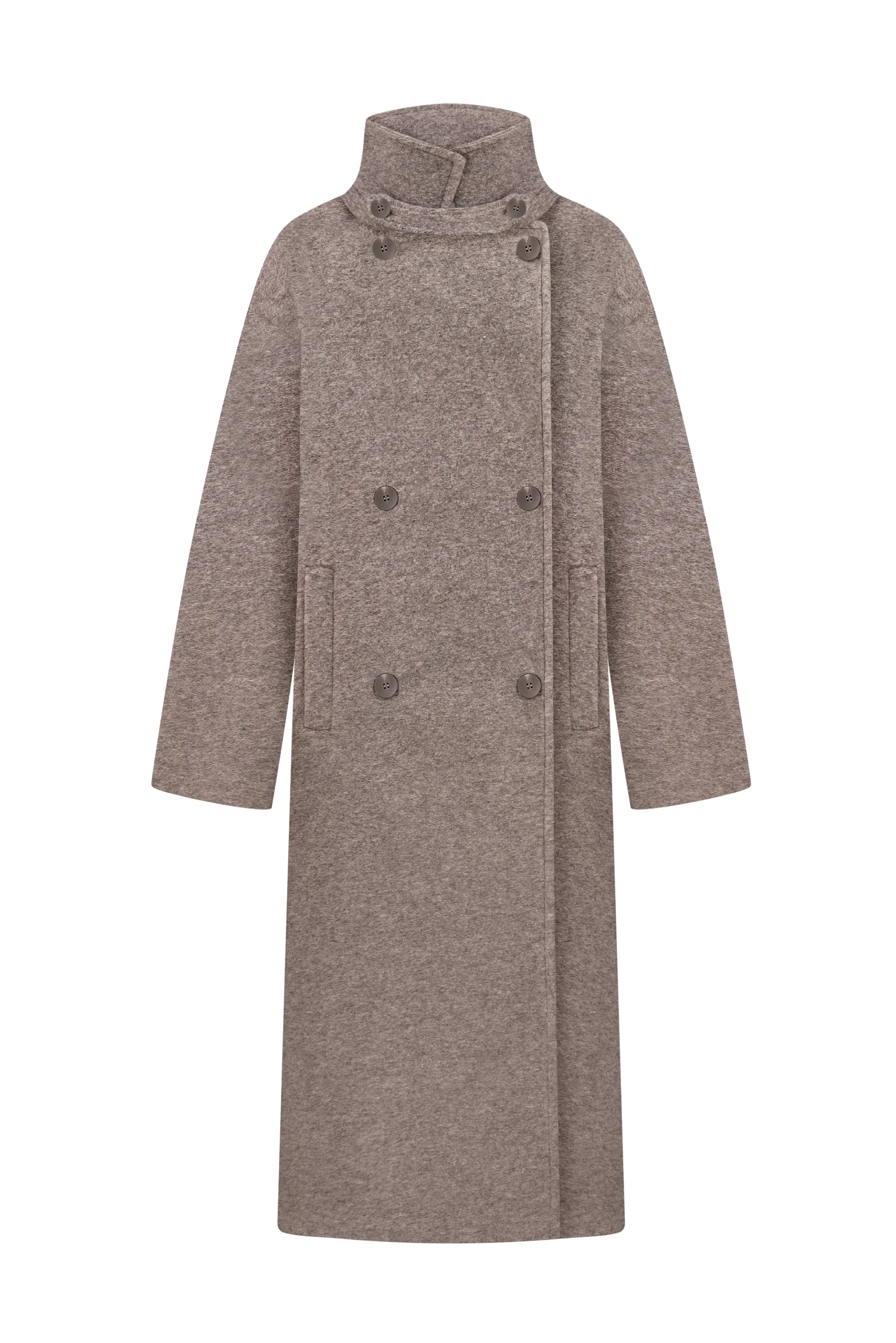 Пальто оверсайз у стилі мінімалізму, двобортне, максі довжини. Силует вільний, розслаблений. Комір з відлітною кокеткою спереду, який завдяки паті може трансформуватися в комір-стійку. Лінія плеча — спущена, рукава вшивні. Модель виконана у стриманому дизайні з чистими лініями, без зайвих деталей, що підкреслює сучасність та преміальність виробу.