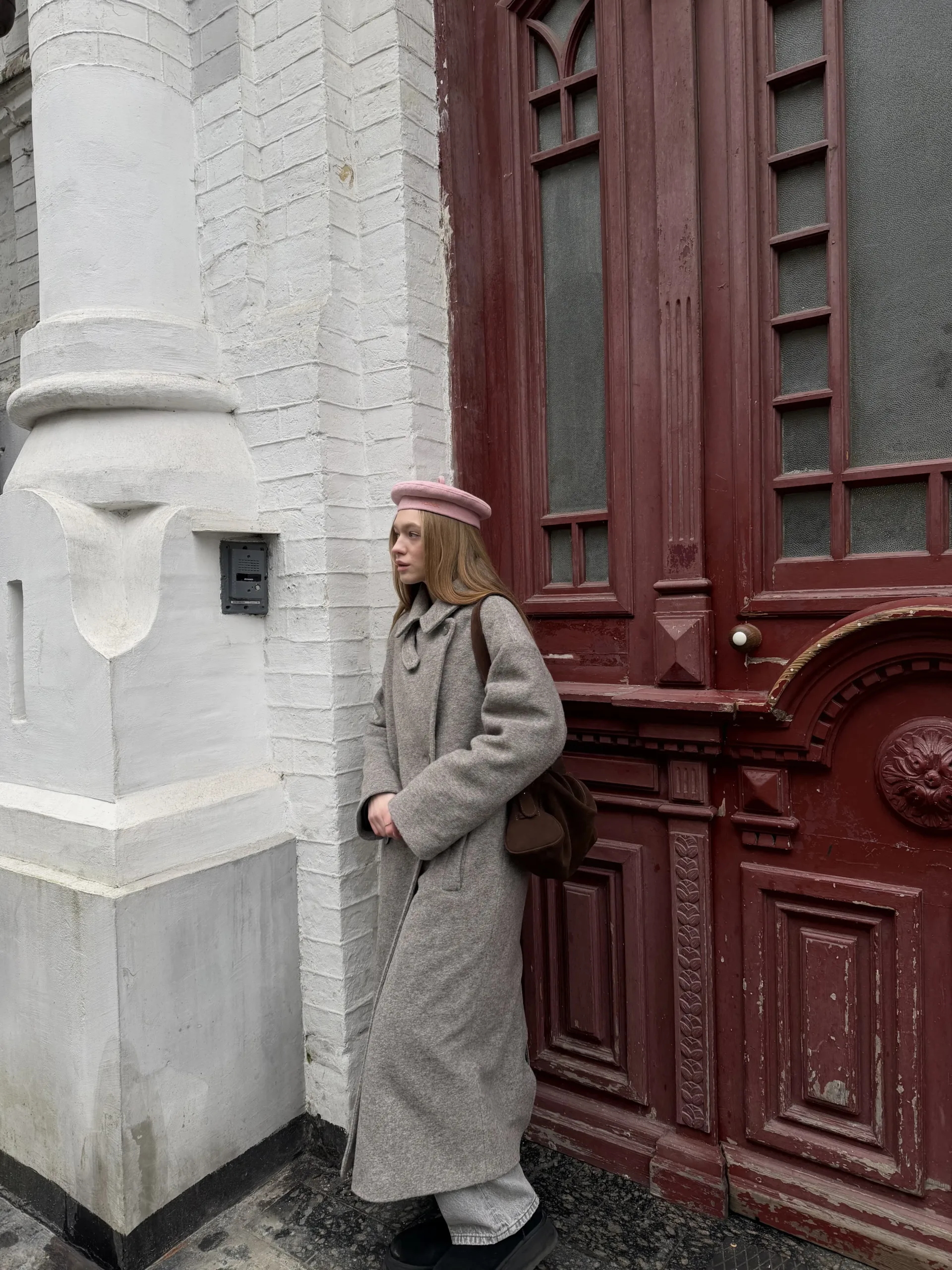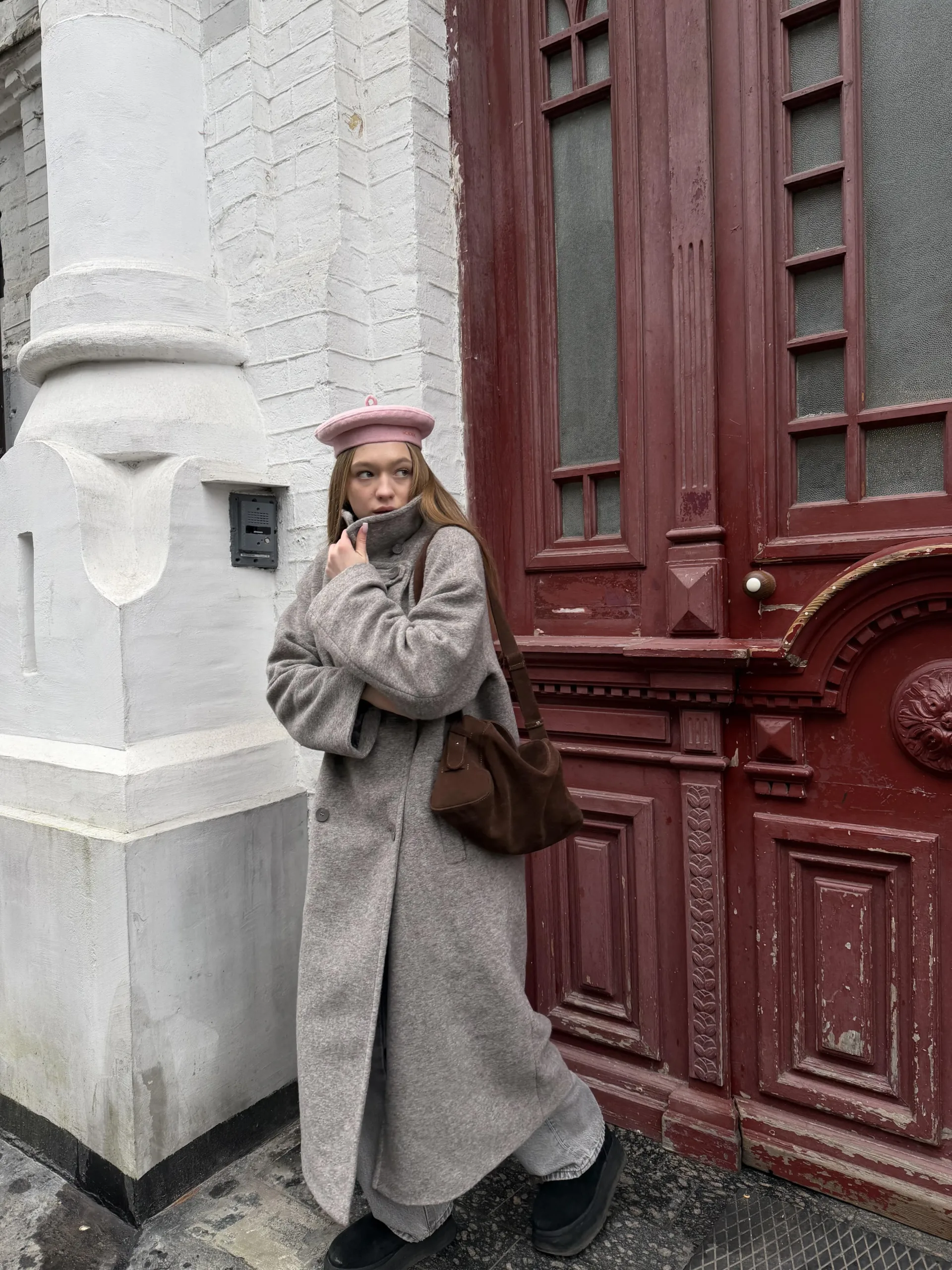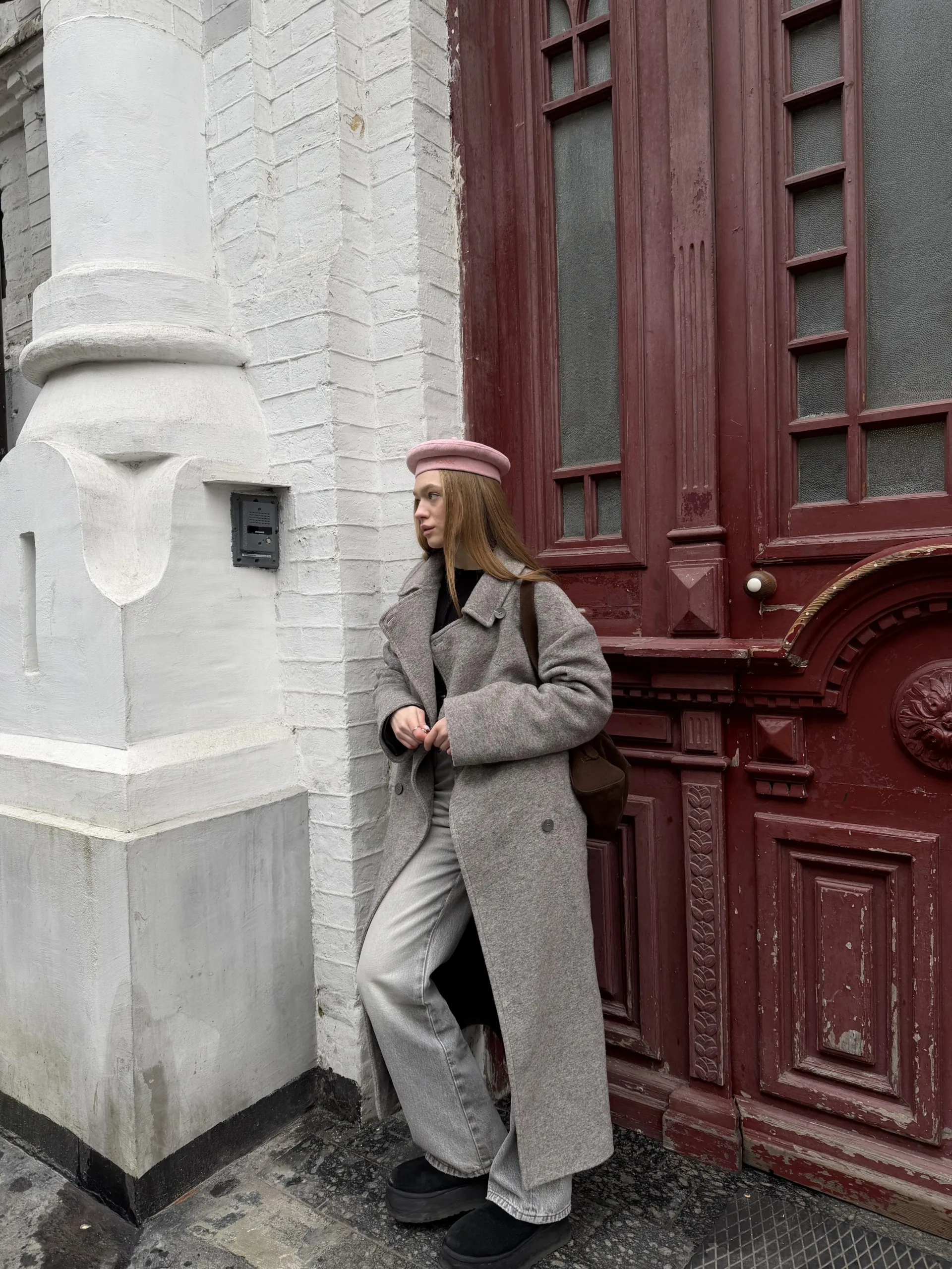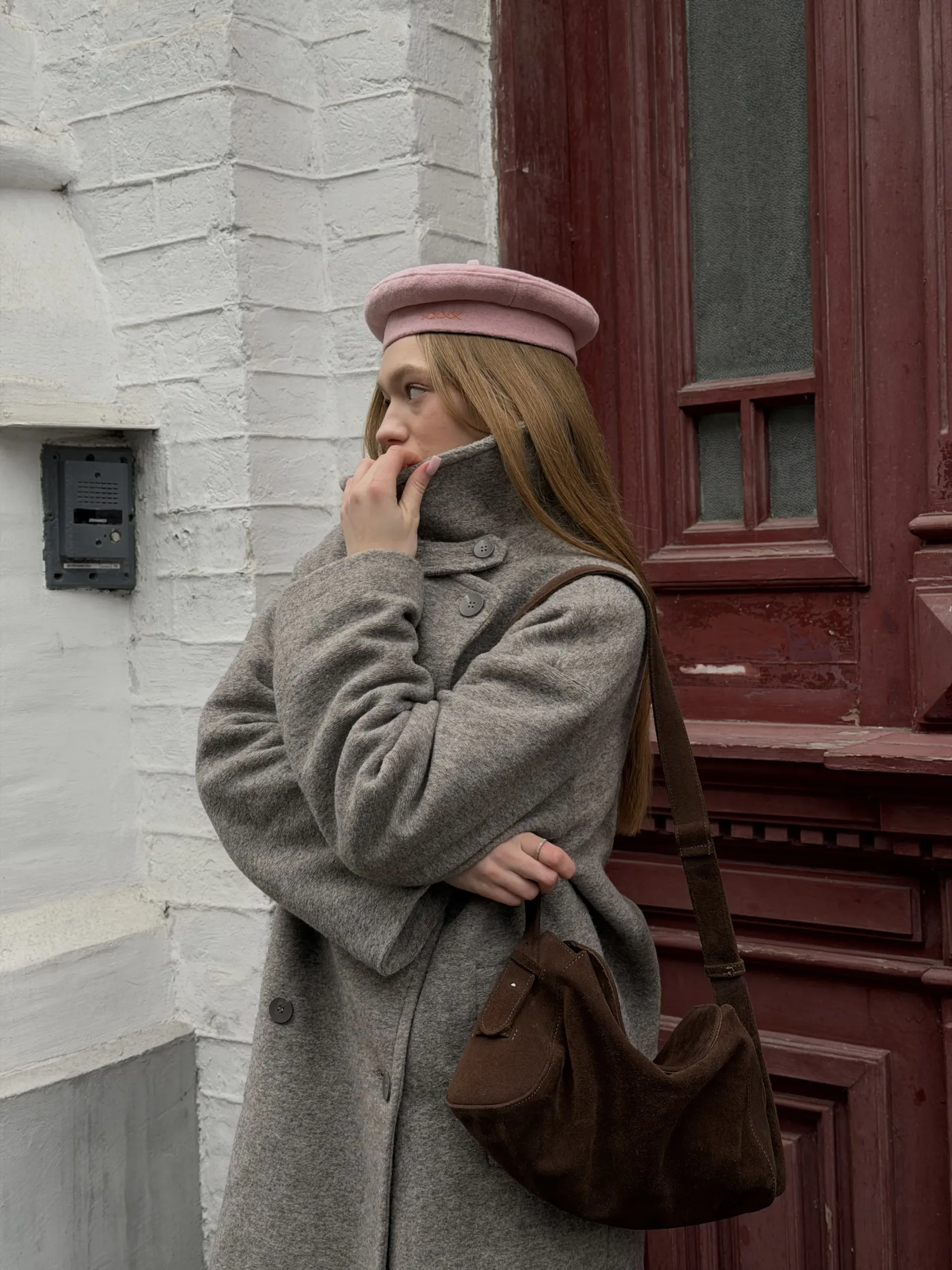 Пальто оверсайз у стилі мінімалізму, двобортне, максі довжини. Силует вільний, розслаблений. Комір з відлітною кокеткою спереду, який завдяки паті може трансформуватися в комір-стійку. Лінія плеча — спущена, рукава вшивні. Модель виконана у стриманому дизайні з чистими лініями, без зайвих деталей, що підкреслює сучасність та преміальність виробу.