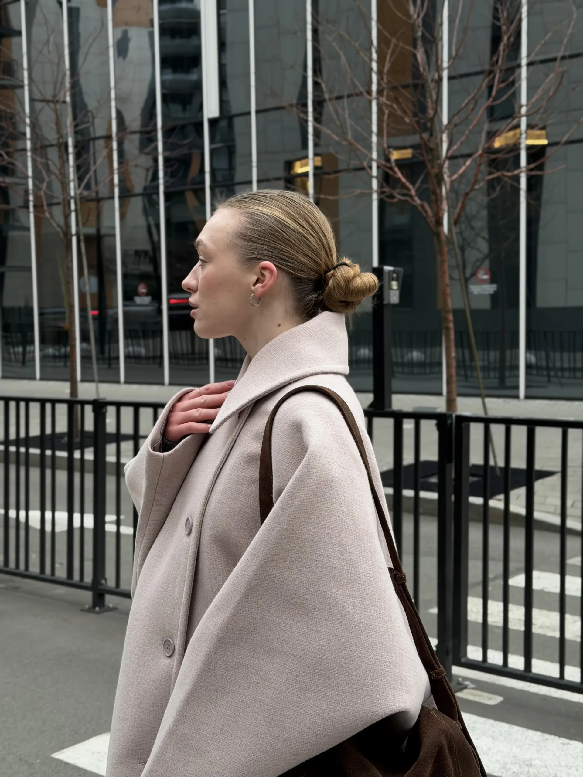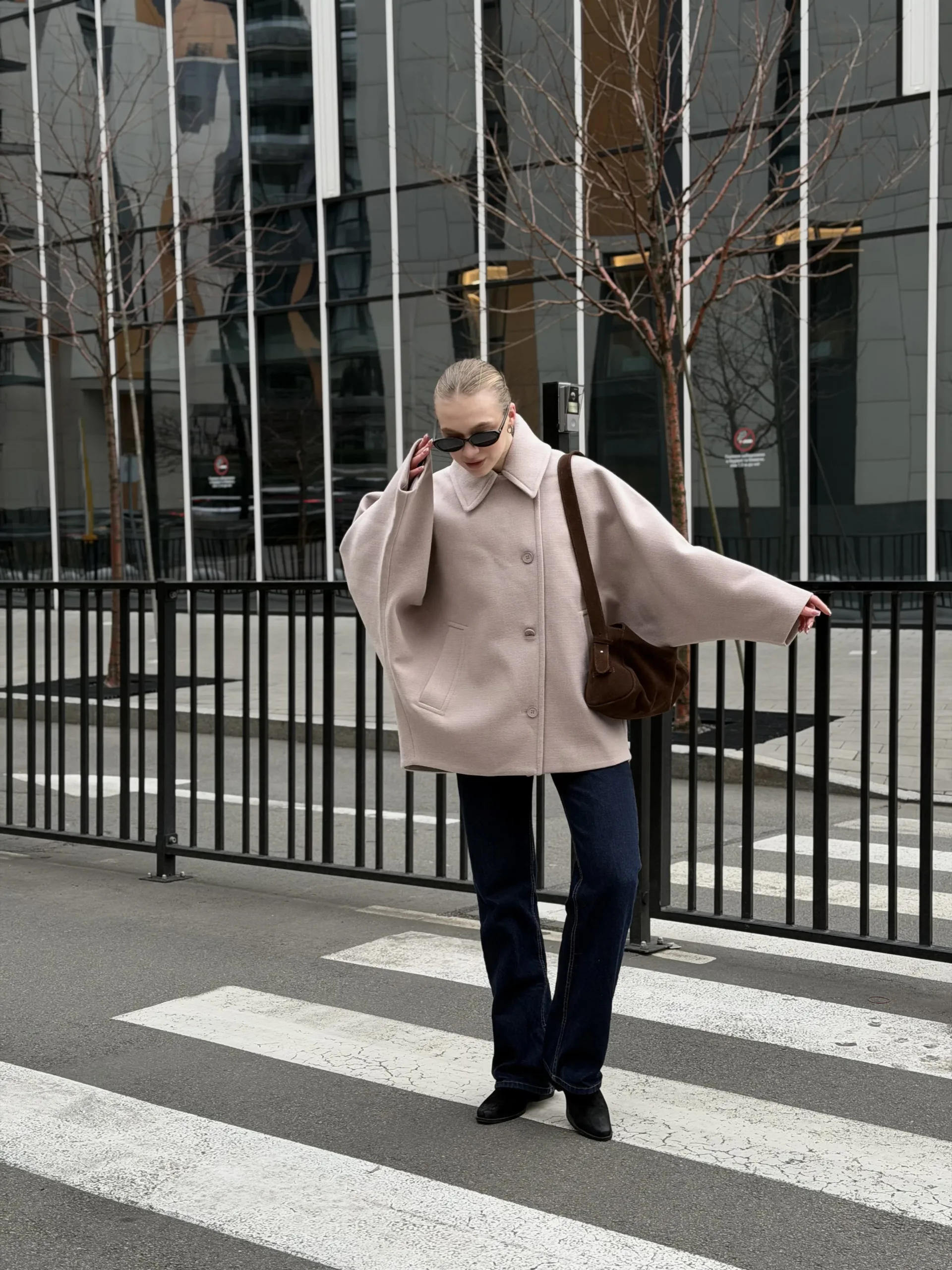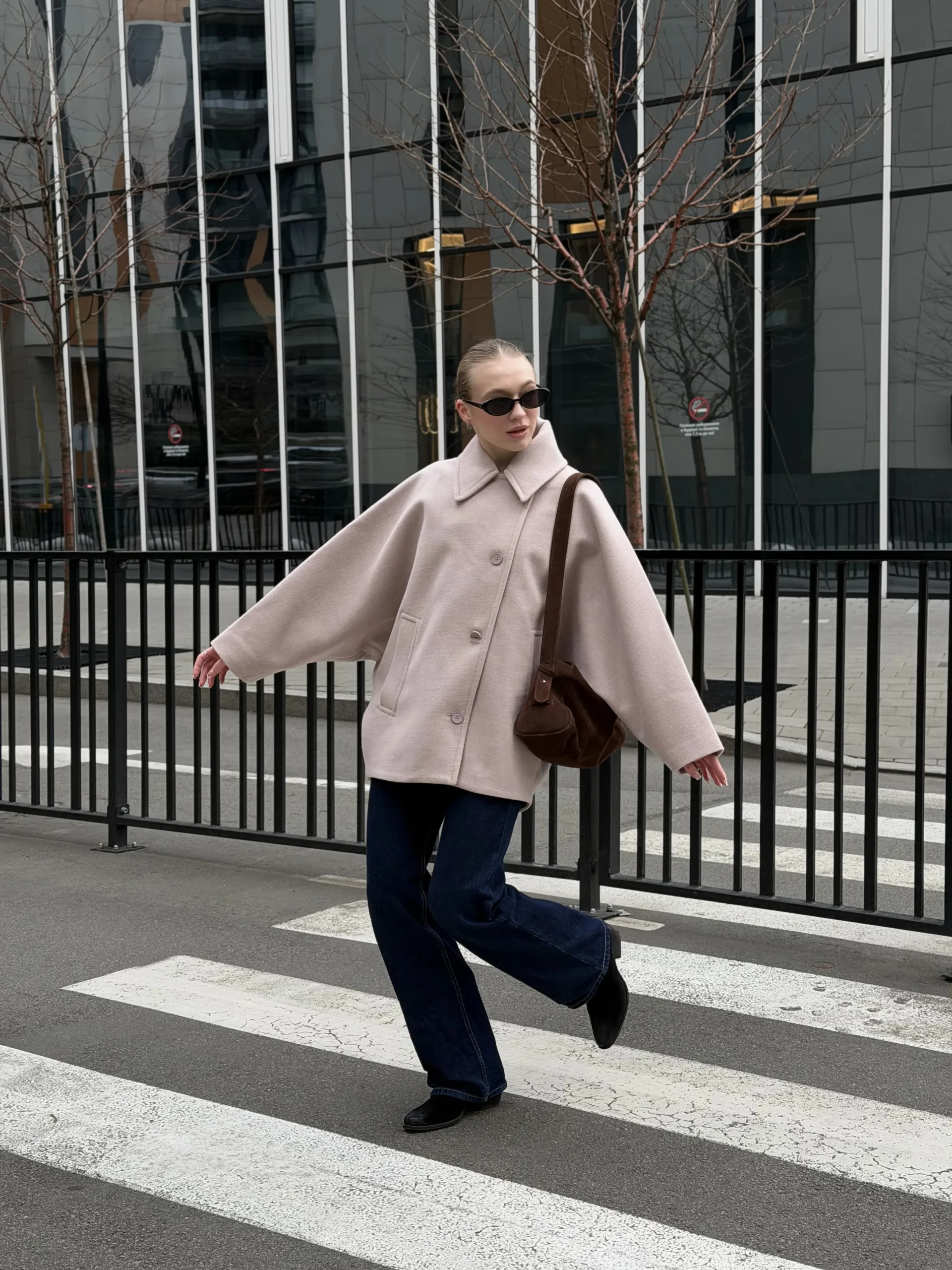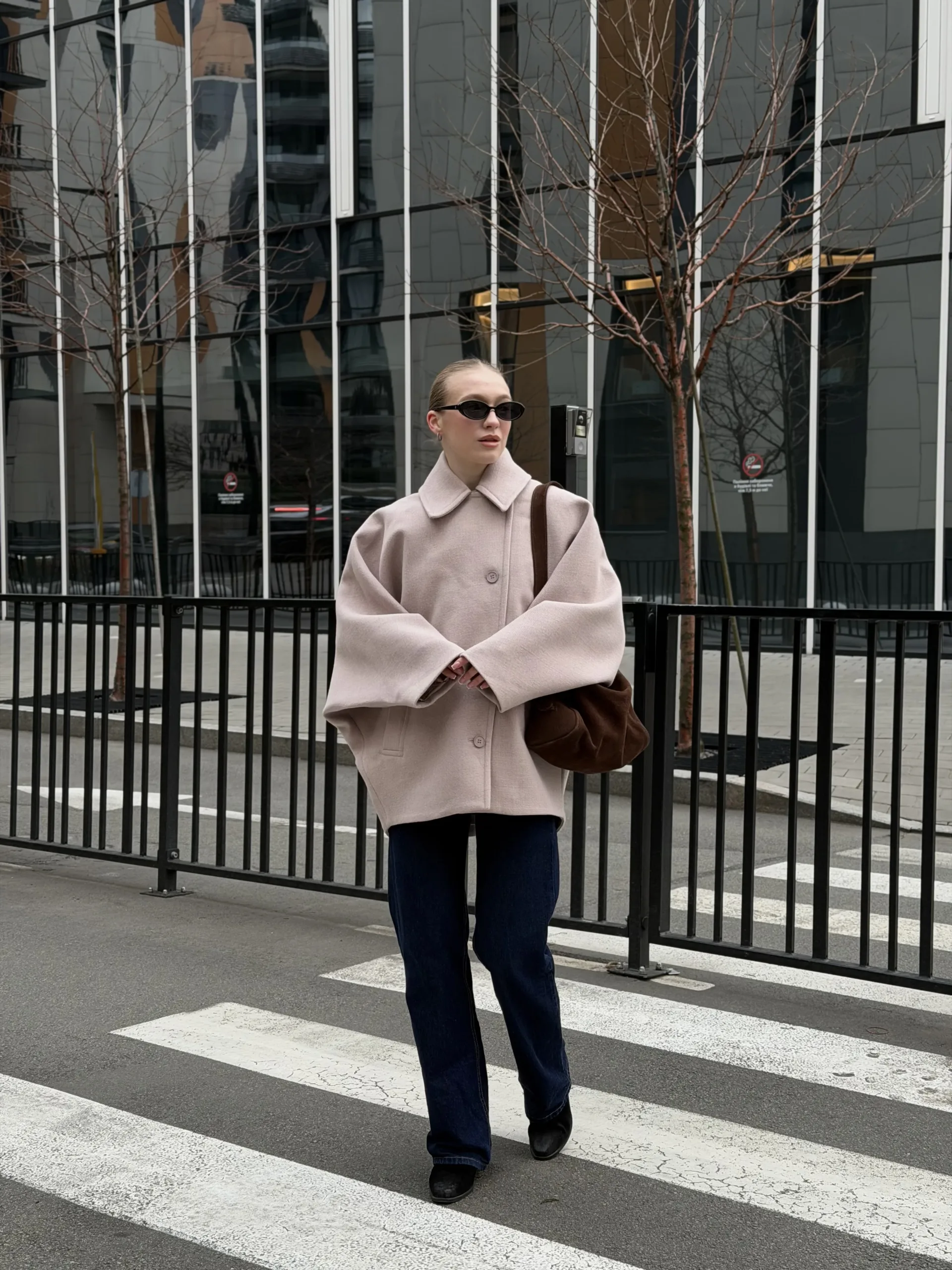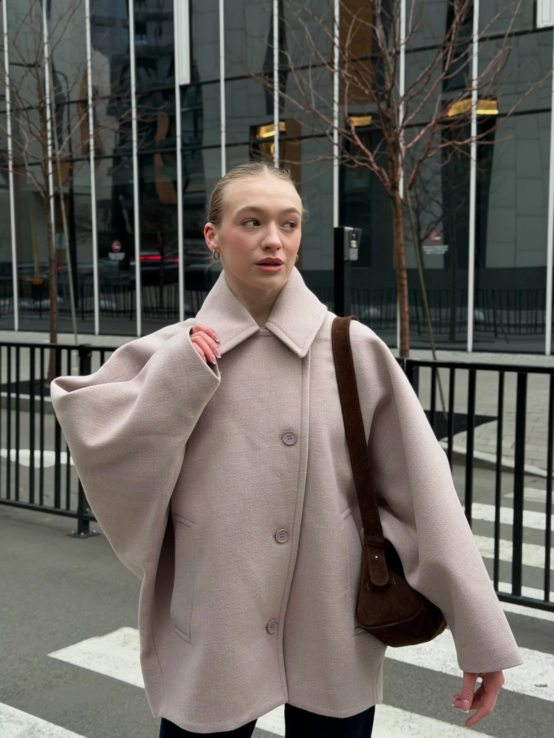 Пальто оверсайз у стилі мінімалізму, двобортне, максі довжини. Силует вільний, розслаблений. Комір з відлітною кокеткою спереду, який завдяки паті може трансформуватися в комір-стійку. Лінія плеча — спущена, рукава вшивні. Модель виконана у стриманому дизайні з чистими лініями, без зайвих деталей, що підкреслює сучасність та преміальність виробу.