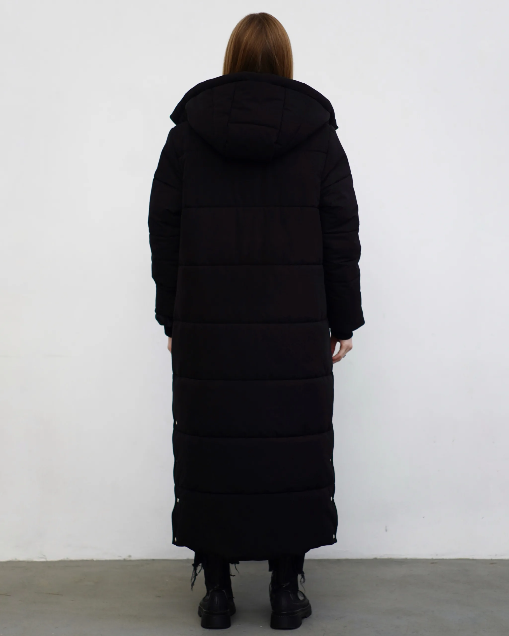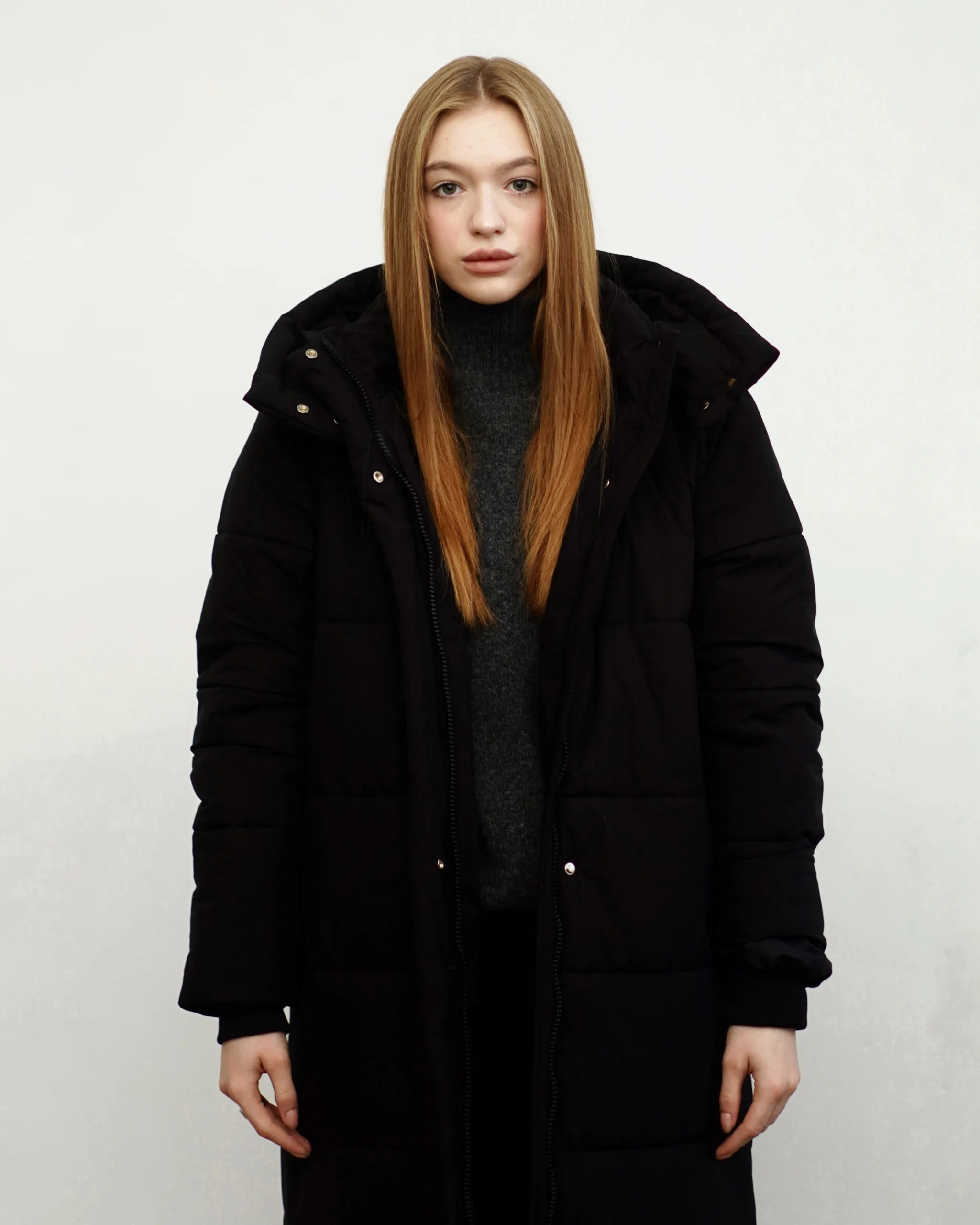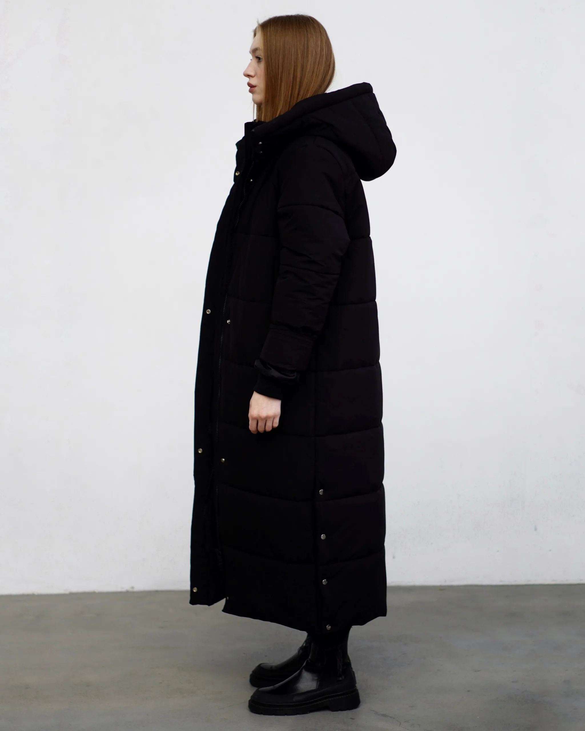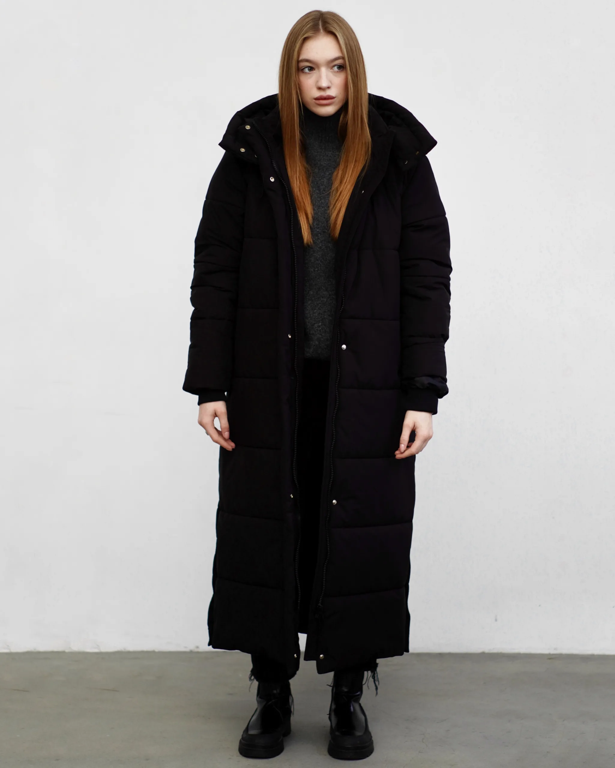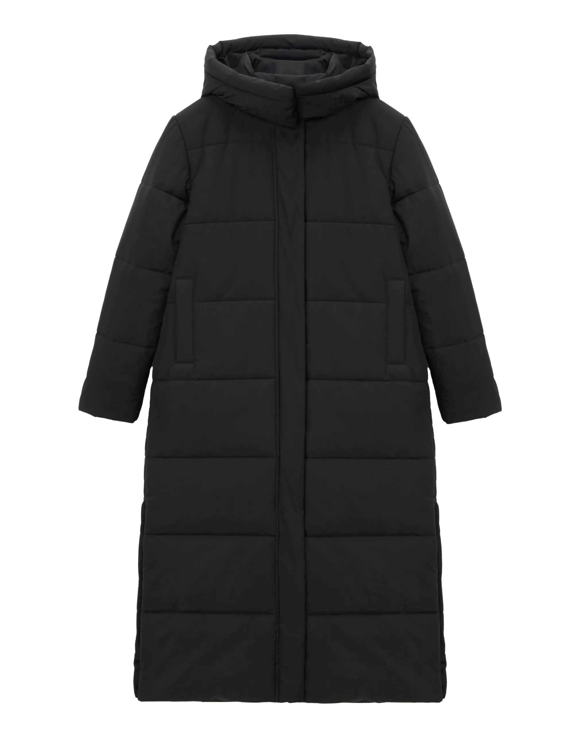 Чудове, довге, лаконічне стьобане пальто прямого крою під пояс з застібкою на потайних кнопках.