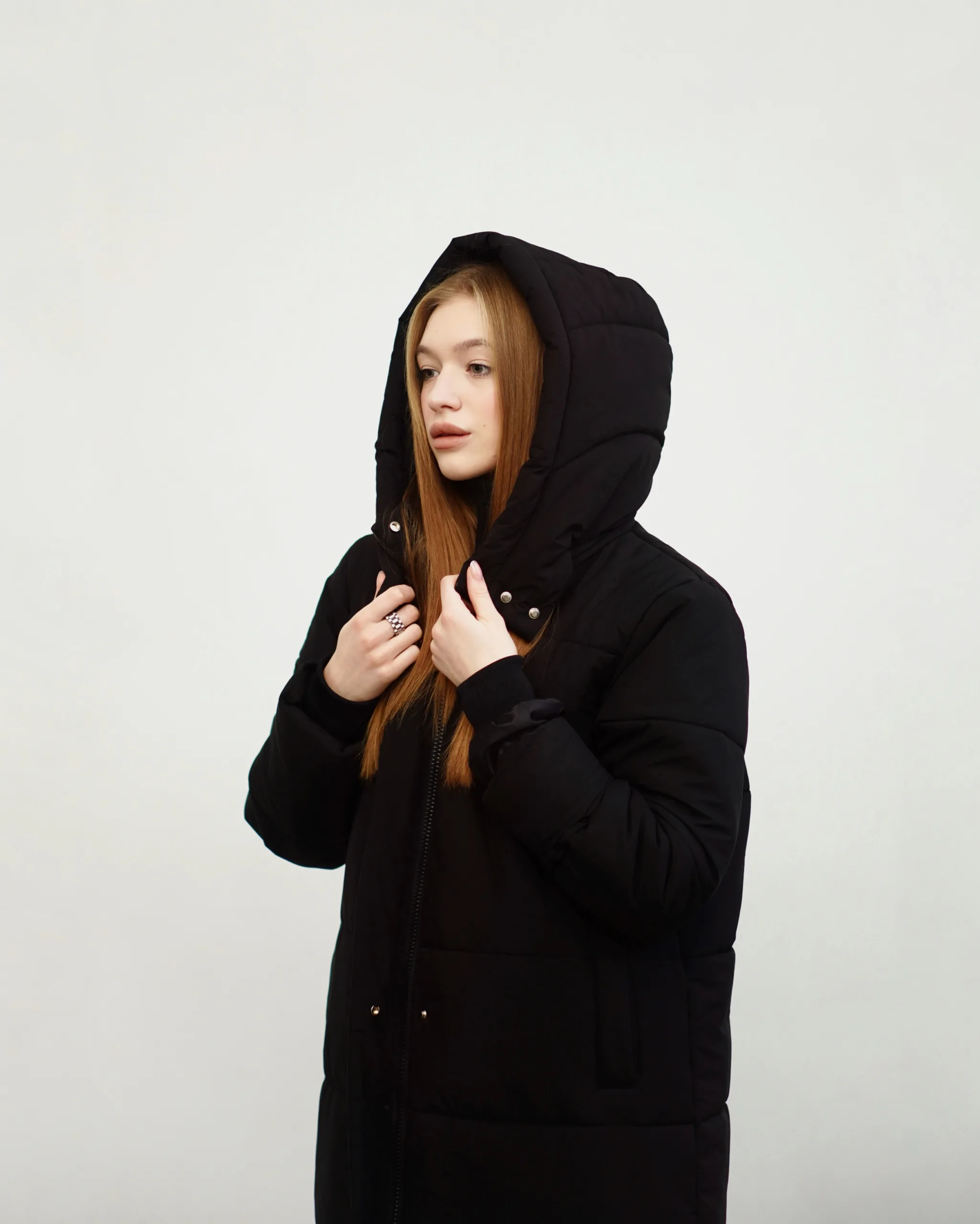 Пуховик-куртка однобортна, з застібкою на двосторонню блискавку, з коміром-стійкою та втачними рукавами з манжетом на еластичну стрічку (резинку). На полочці дві накладні кишені з накладним клапаном на дві кнопки. На лінії талії куліска з вдітим шнурком-мотузкою. До горловиникріпиться на блискавці з`ємний капюшон.